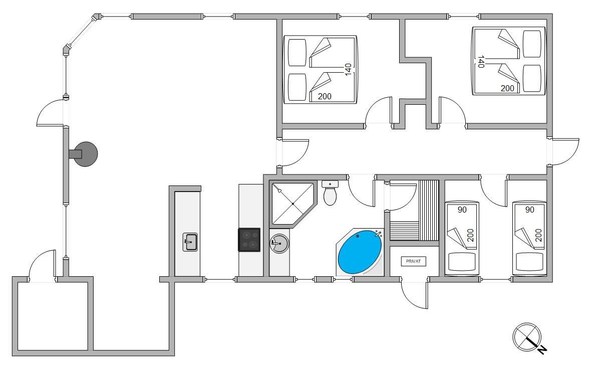Det praktisk indrettede køkken med blandt andet opvaskemaskine, mikroovn og separat fryser står i åben forbindelse med stuen. Der er 3 soveværelser samt et stort badeværelse med gulvvarme, boblebad og sauna. Huset har brændeovn og en energibesparende varmepumpe, der også kan benyttes som aircondition om sommeren.