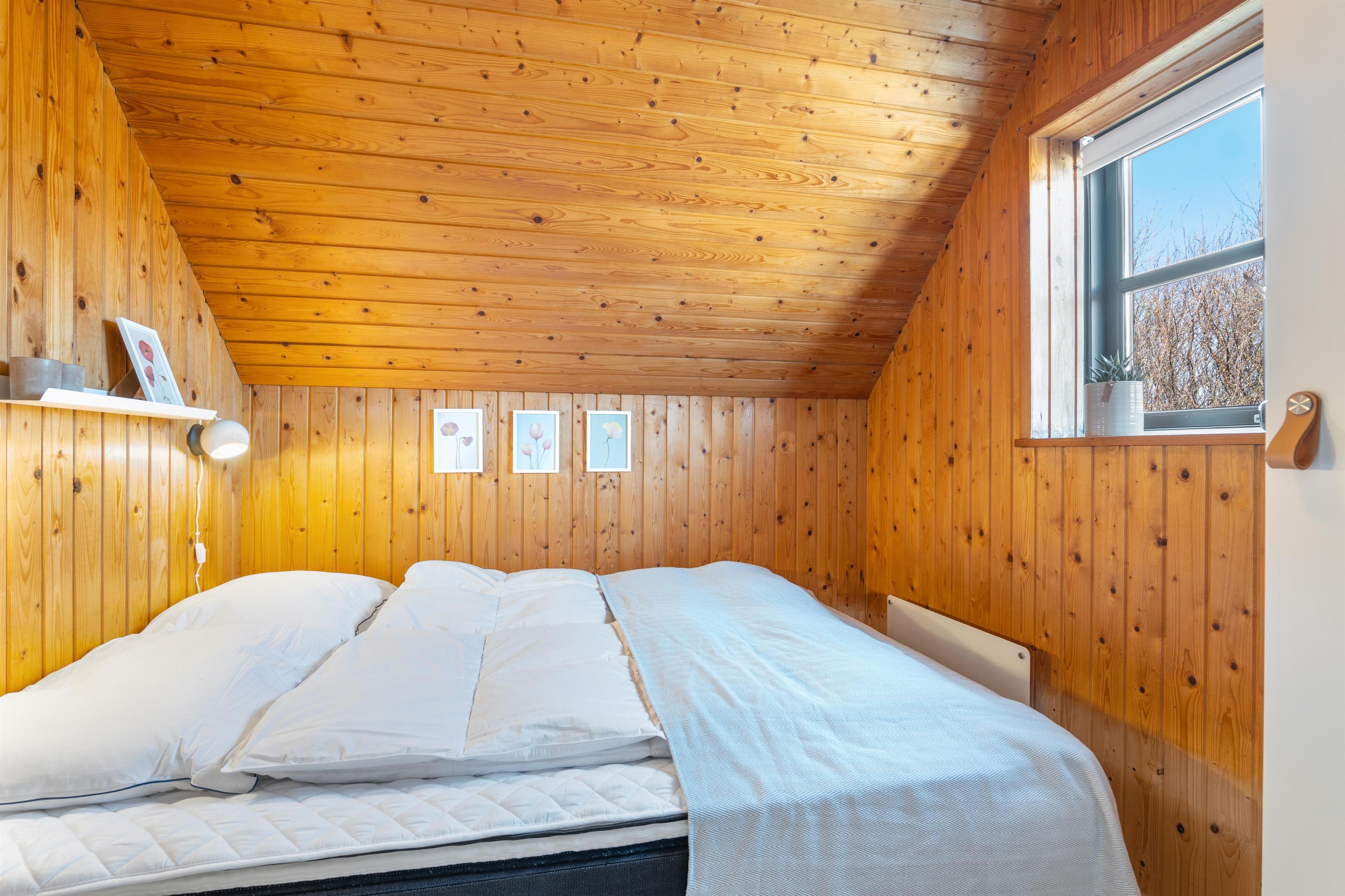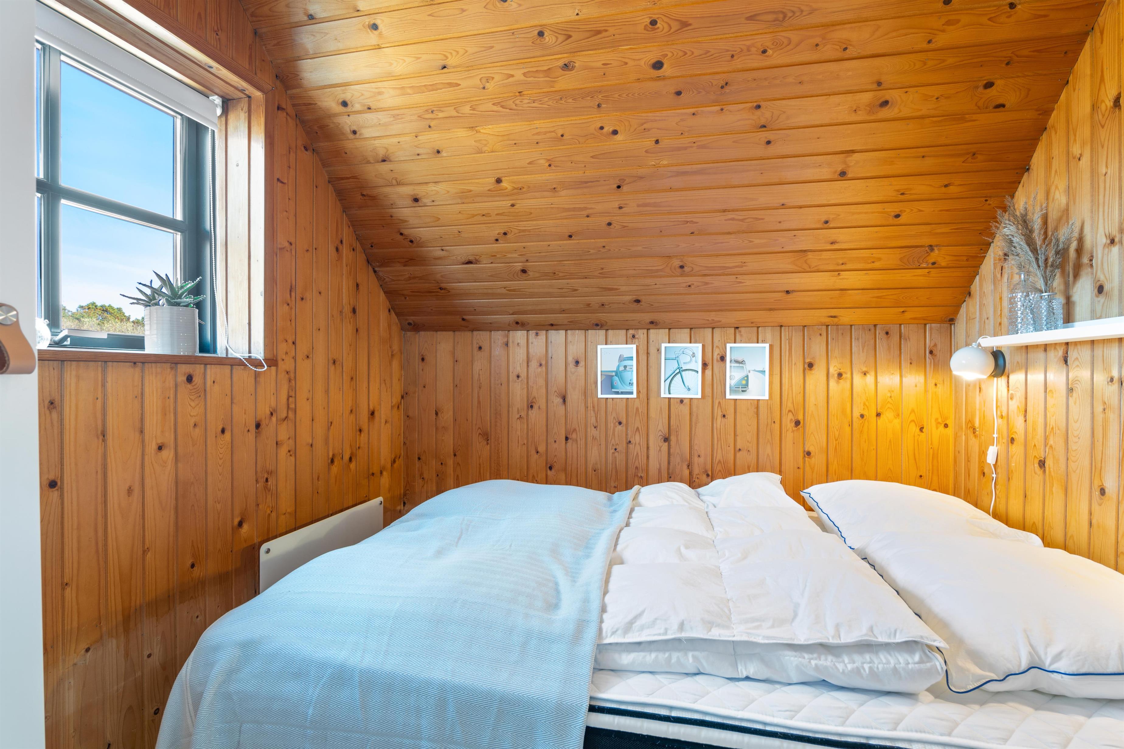 Det hyggelige sommerhus med synlige bjælker rummer 3 soveværelser med plads til i alt 6 personer. Der er varmepumpe installeret. Feriehuset har en åben køkkenafdeling ind mod stue med spiseplads, rummeligt sofaafsnit og brændeovn, samt udgang til afskærmet terrasse. Her kan I nyde morgenmaden eller slappe af i en stille stund.