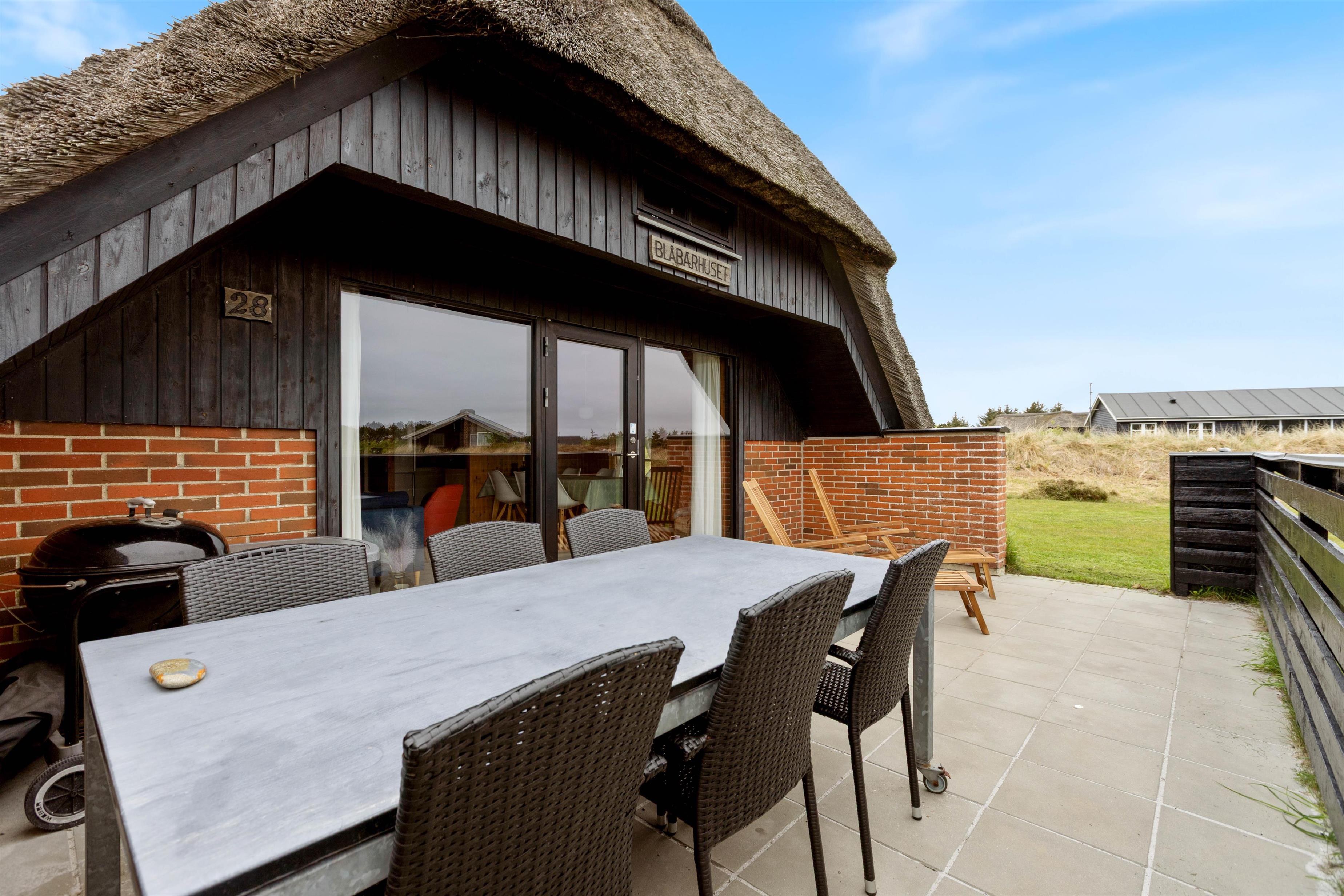 Det stråtækte feriehus er udstyret med 2 dejlige terrasser, så der både er mulighed for morgen- og aftensol. Der er en afskærmet terrasse i forbindelse med stuen, så I kan nyde den friske luft både inde og ude. En ekstra terrasse er på den anden side af feriehuset med dejlig plads til sol og samvær.