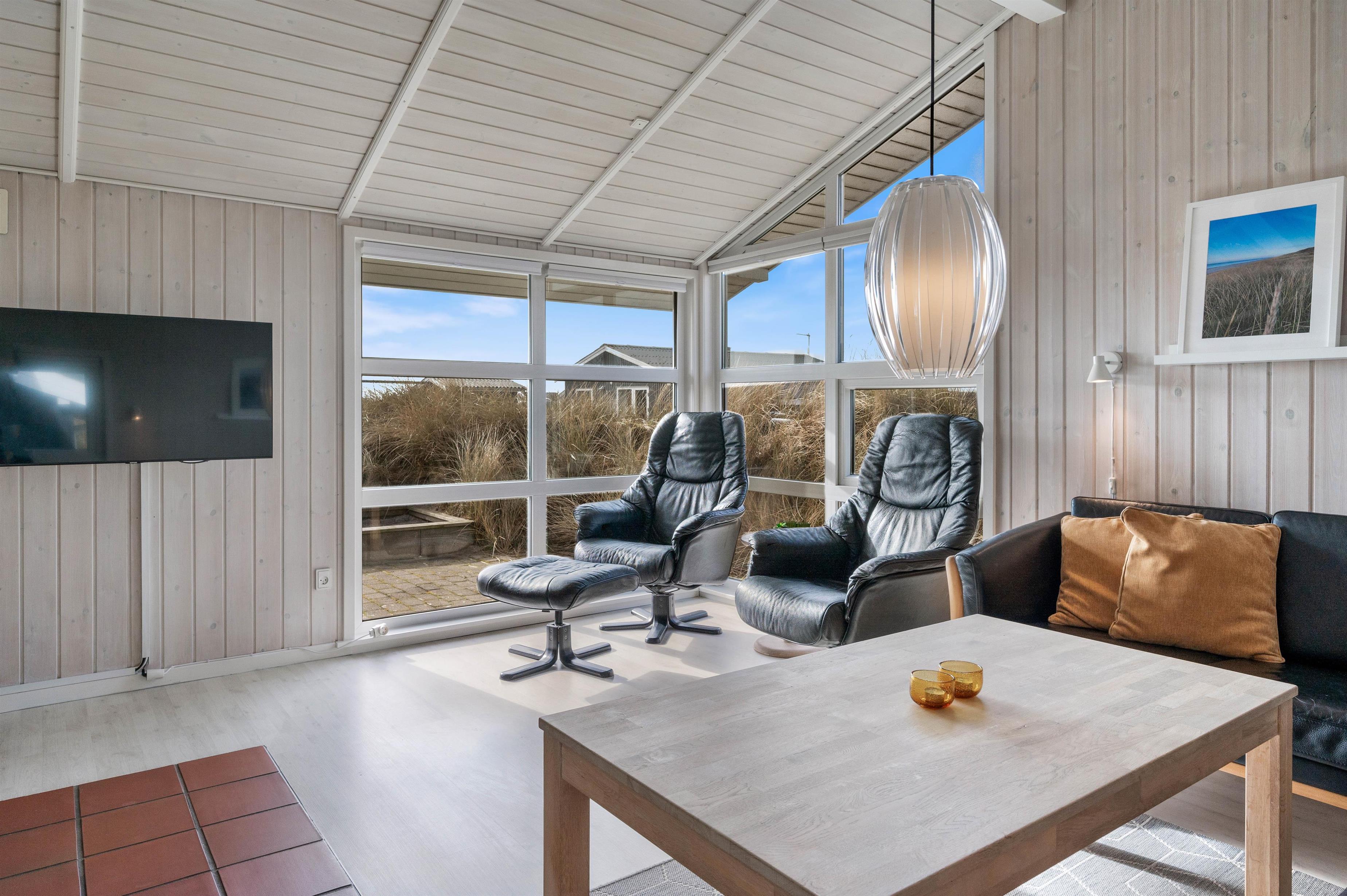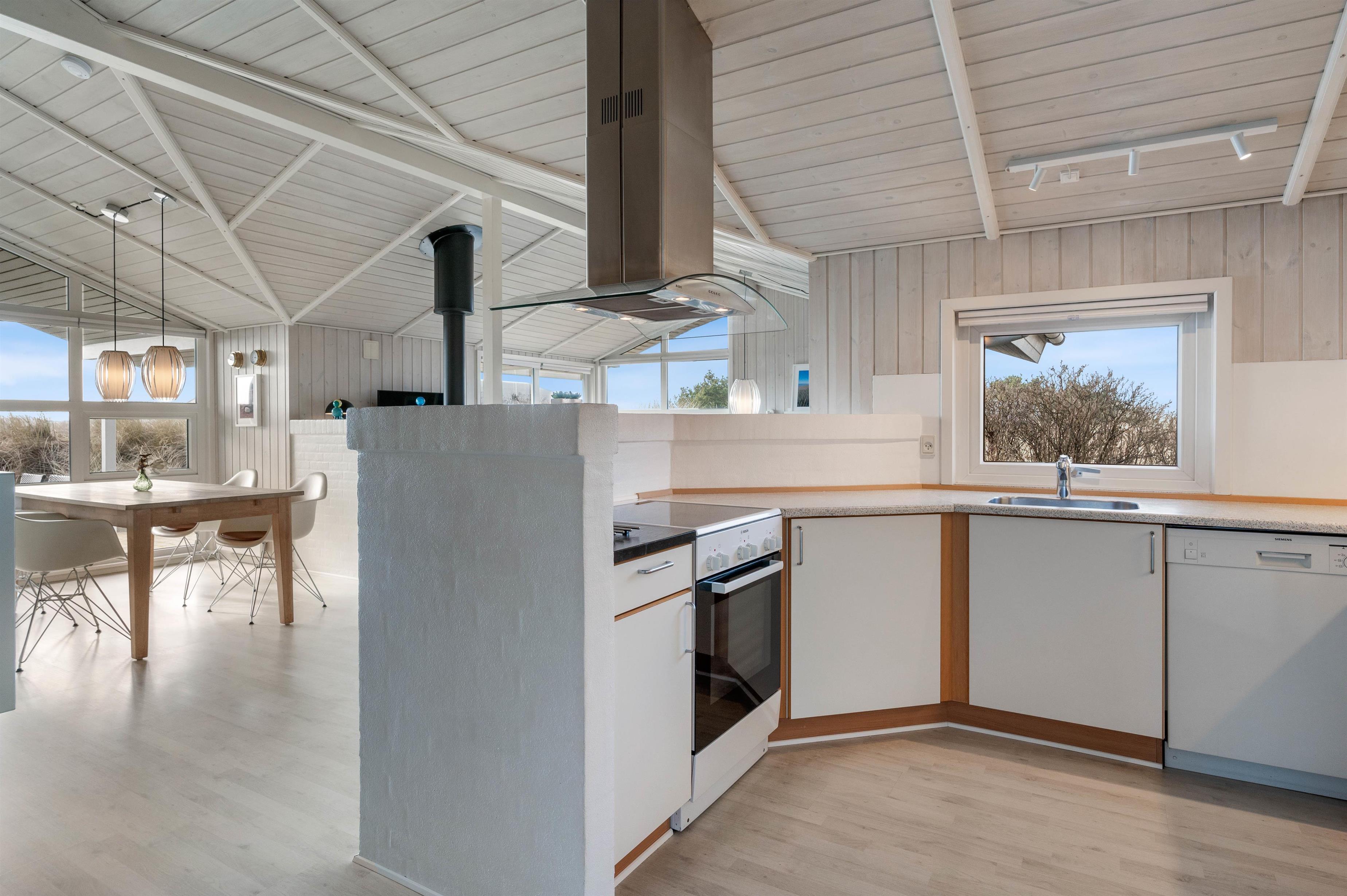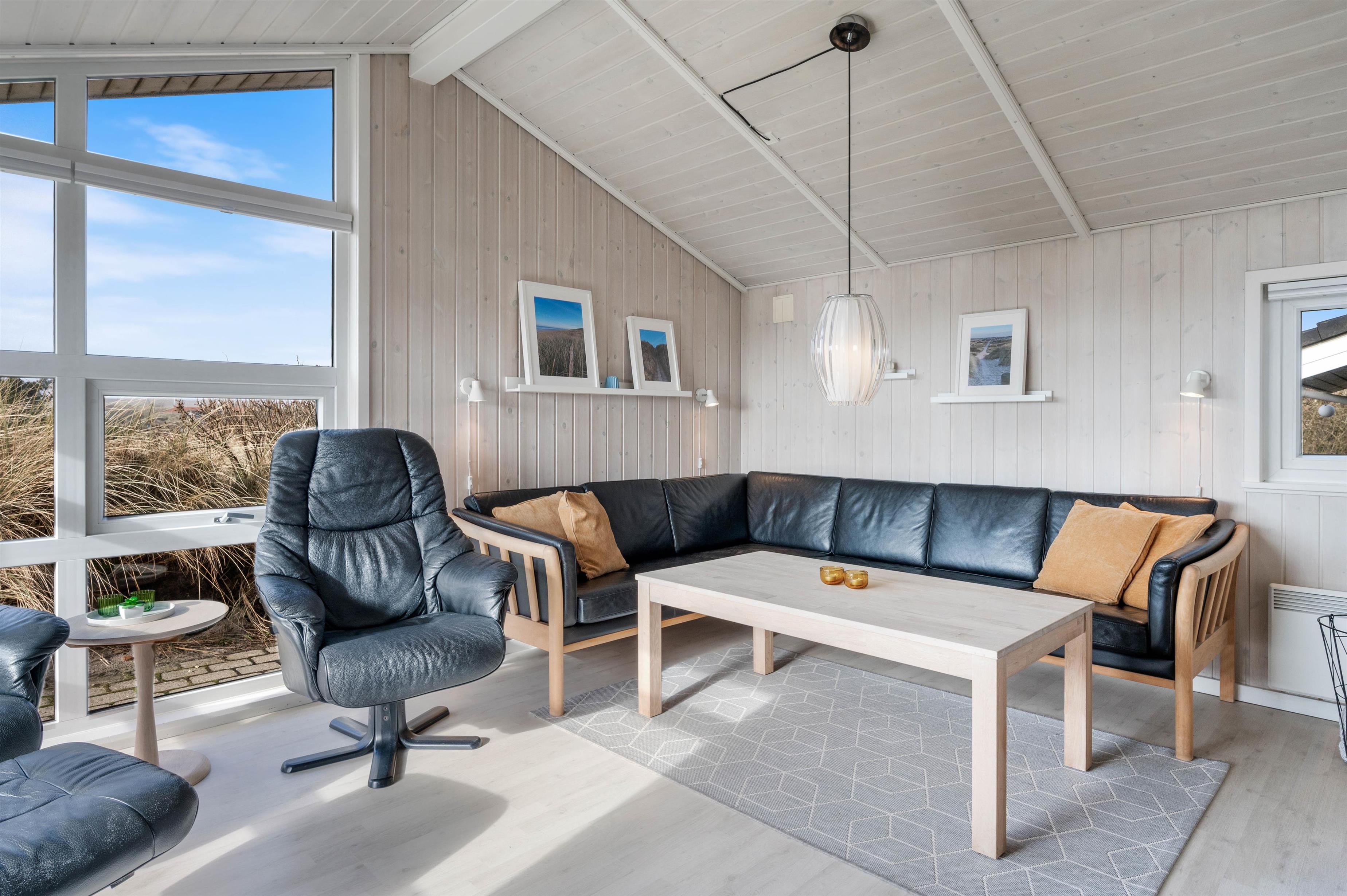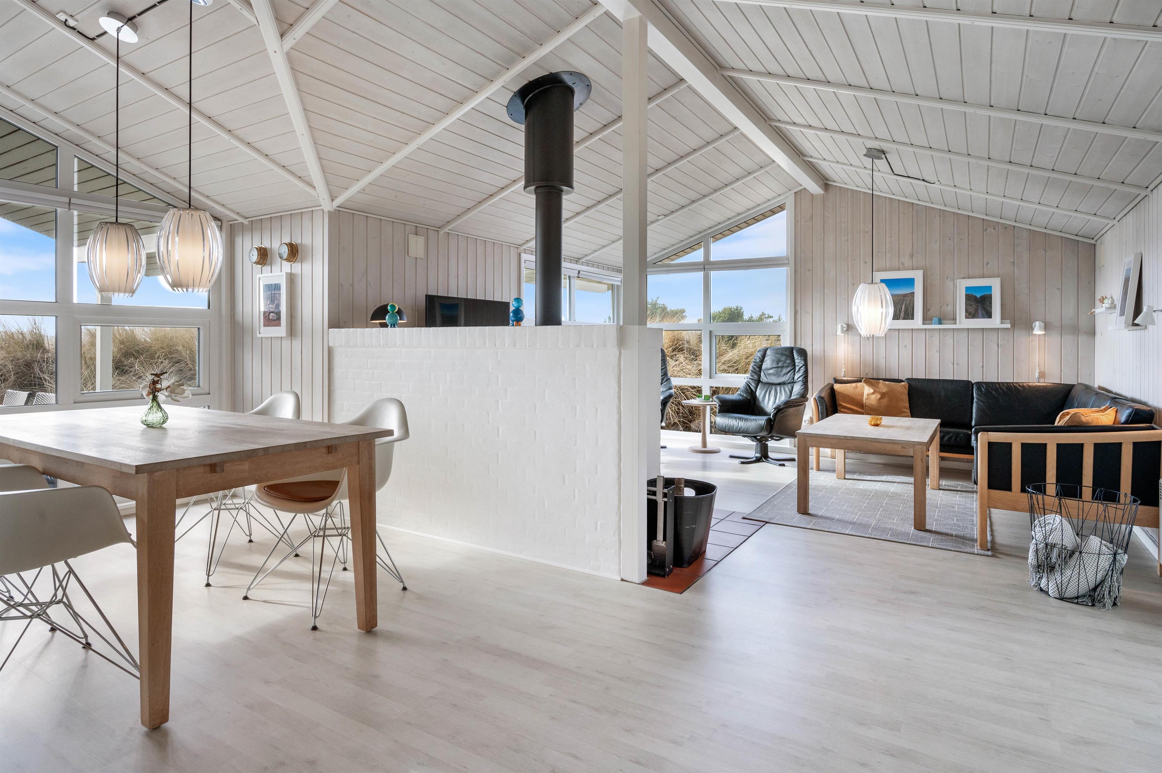 Man betages omgående af den fine indretning, lige fra det lyse og praktiske køkken med alt tænkeligt udstyr, over den elegante spiseafdeling med udsigt til klitafsnit, til den magelige og smagfuldt møblerede opholdsafdeling. Her er der rig mulighed for at slappe af foran brændeovnen eller med TV, stereoanlæg eller evt. opkobling på det trådløse internet (gratis). I kan med fordel benytte jer af den energibesparende varmepumpe i sommerhuset.