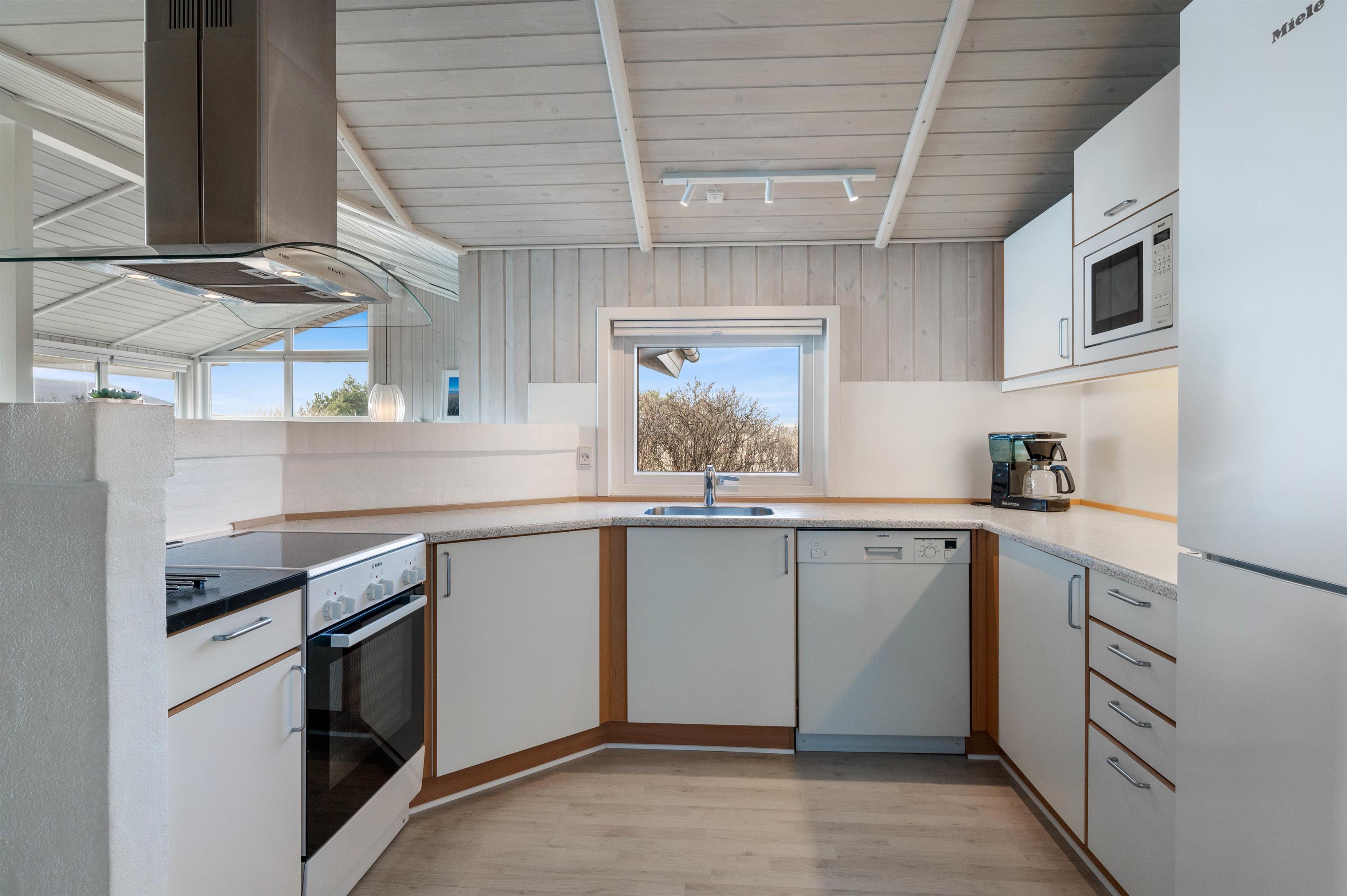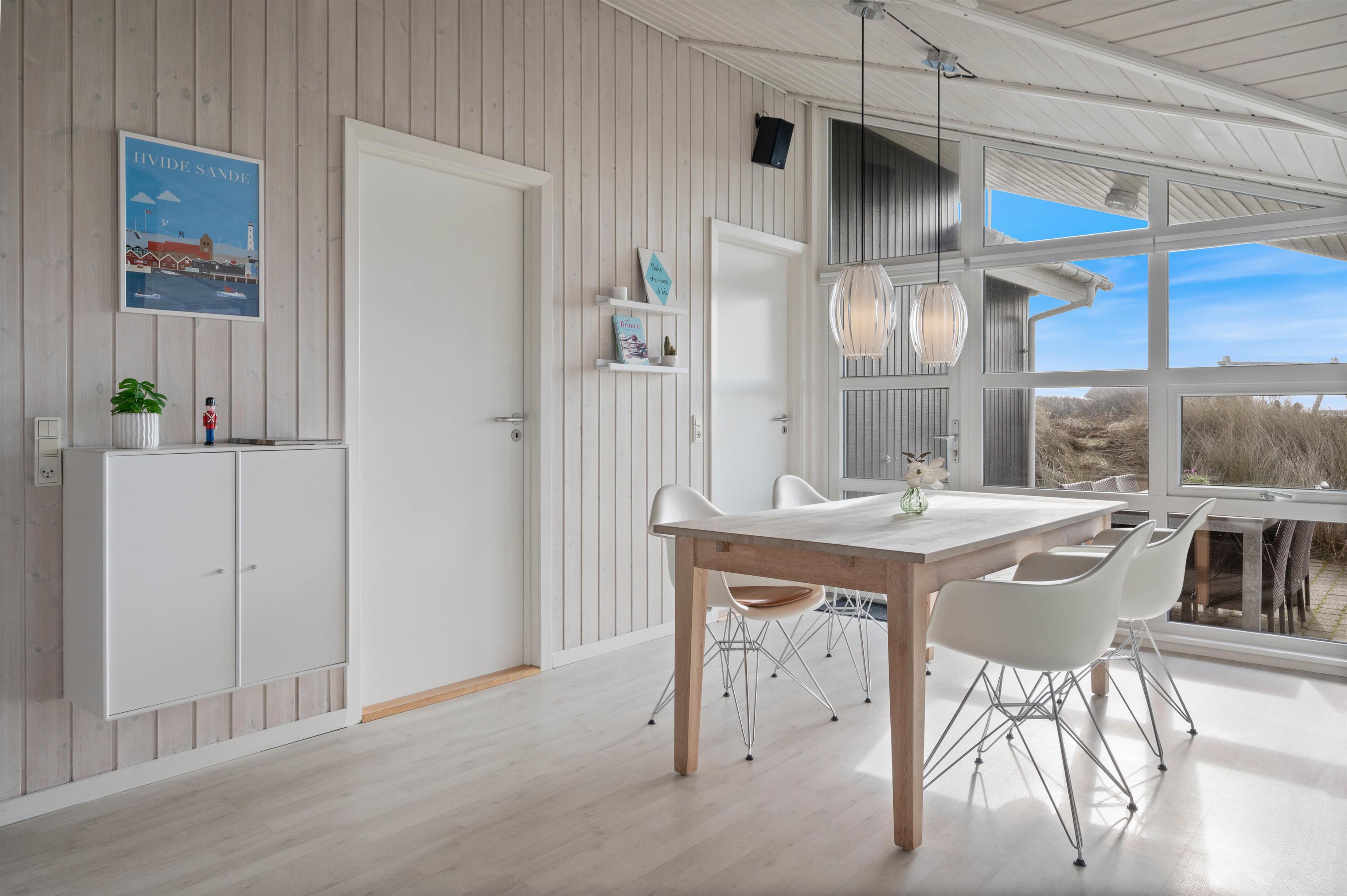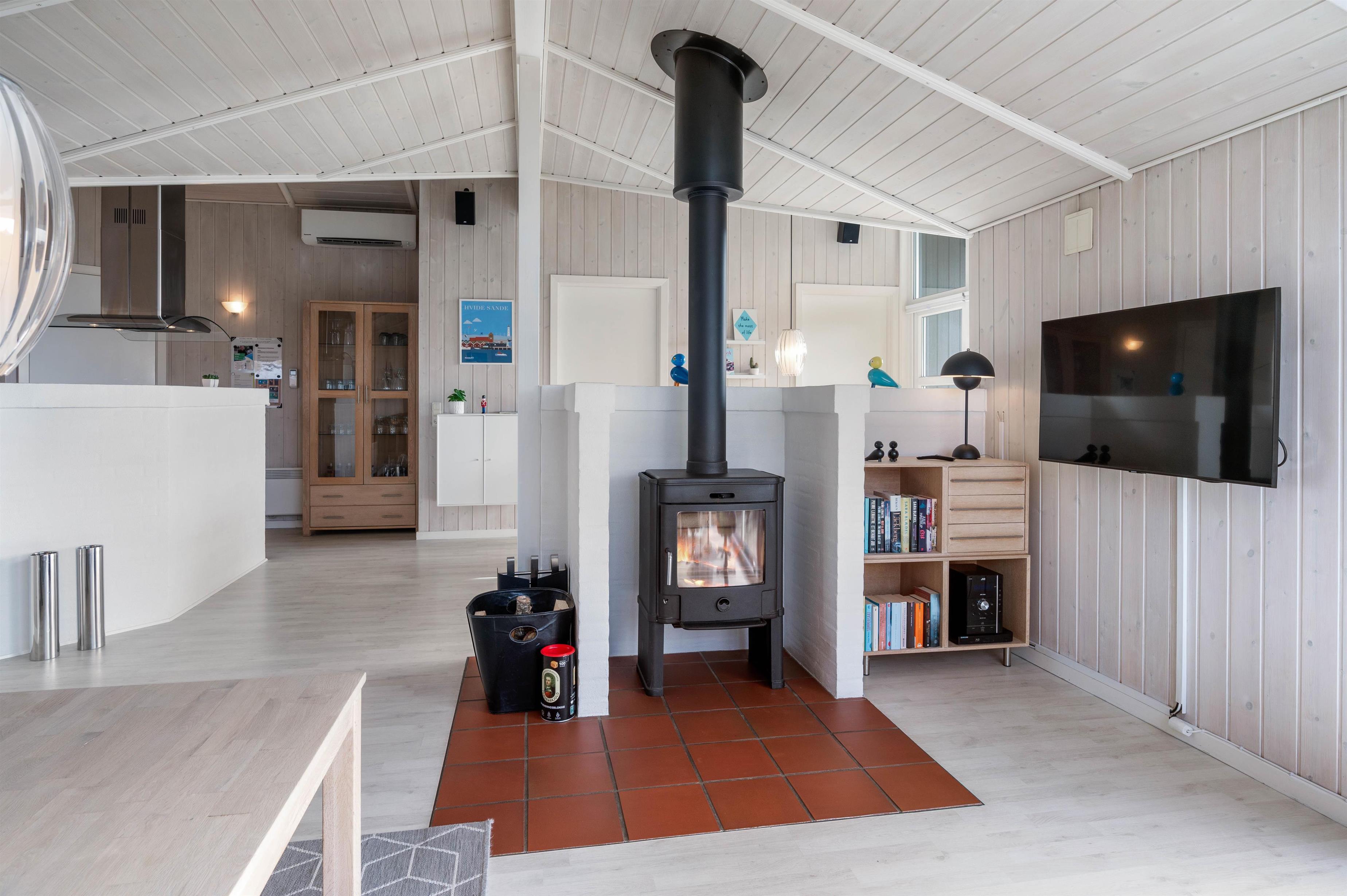 Man betages omgående af den fine indretning, lige fra det lyse og praktiske køkken med alt tænkeligt udstyr, over den elegante spiseafdeling med udsigt til klitafsnit, til den magelige og smagfuldt møblerede opholdsafdeling. Her er der rig mulighed for at slappe af foran brændeovnen eller med TV, stereoanlæg eller evt. opkobling på det trådløse internet (gratis). I kan med fordel benytte jer af den energibesparende varmepumpe i sommerhuset.