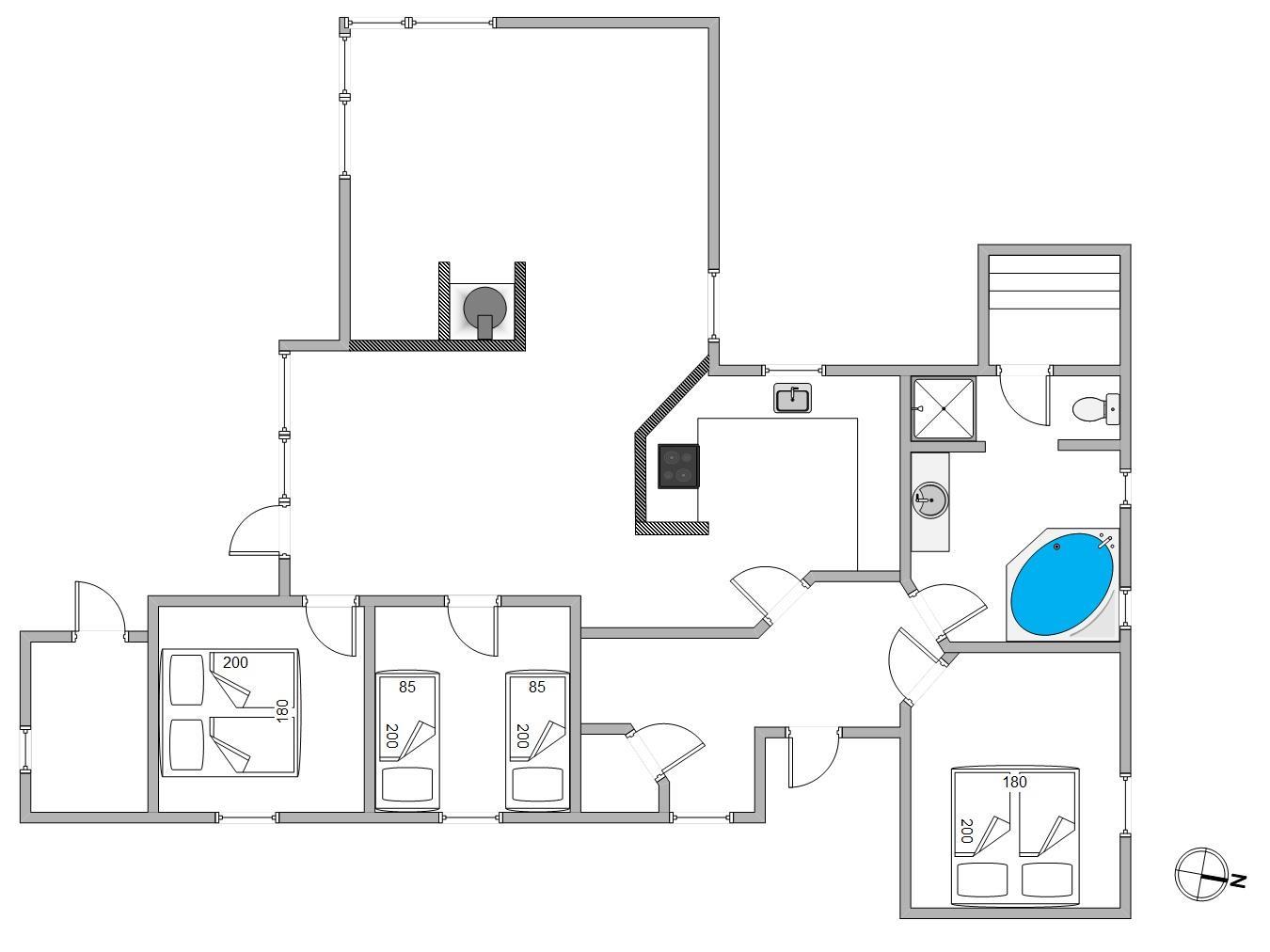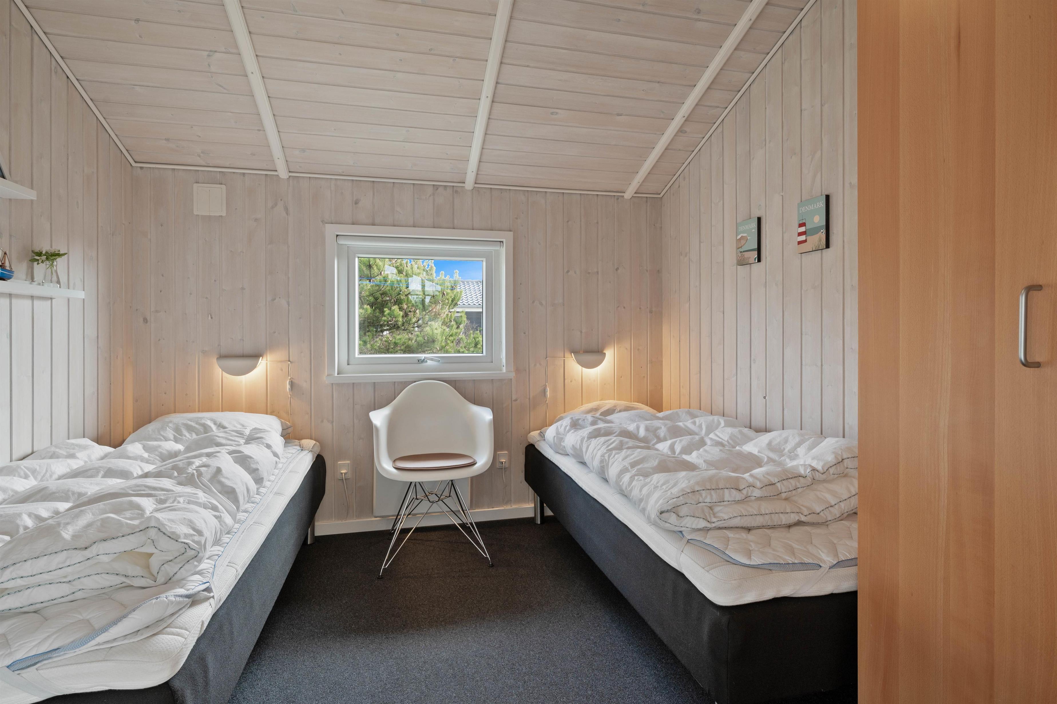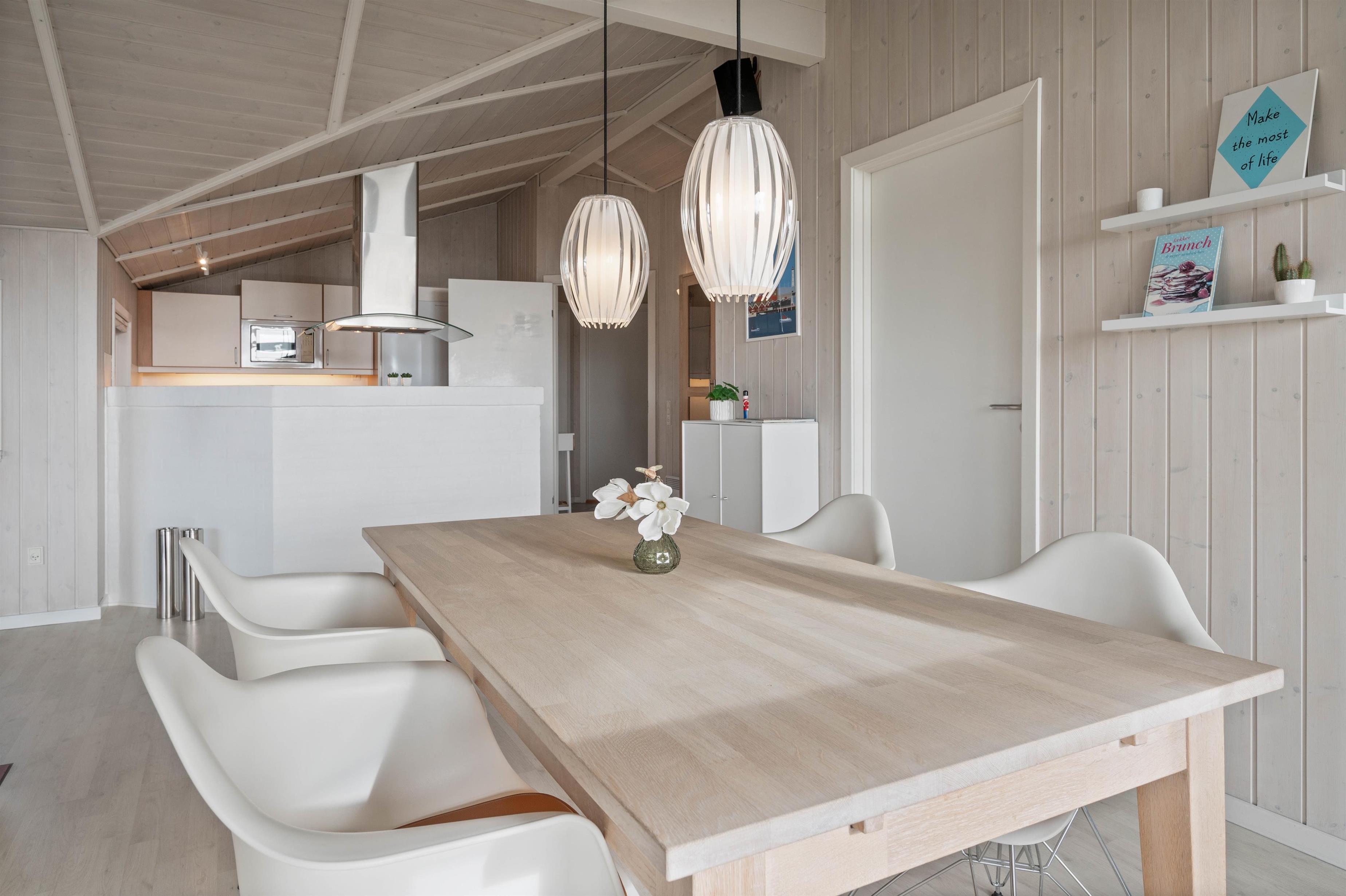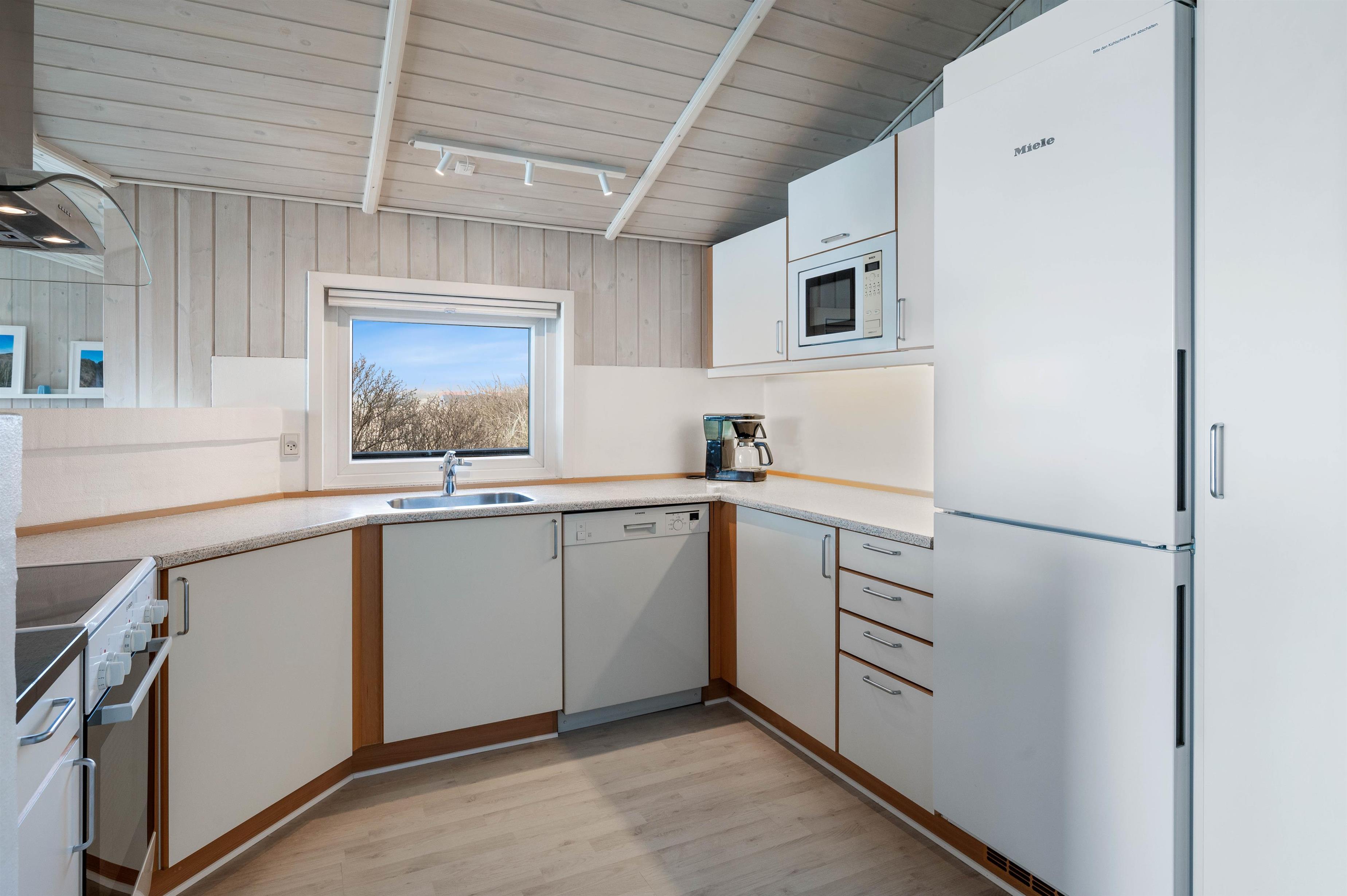 Man betages omgående af den fine indretning, lige fra det lyse og praktiske køkken med alt tænkeligt udstyr, over den elegante spiseafdeling med udsigt til klitafsnit, til den magelige og smagfuldt møblerede opholdsafdeling. Her er der rig mulighed for at slappe af foran brændeovnen eller med TV, stereoanlæg eller evt. opkobling på det trådløse internet (gratis). I kan med fordel benytte jer af den energibesparende varmepumpe i sommerhuset.