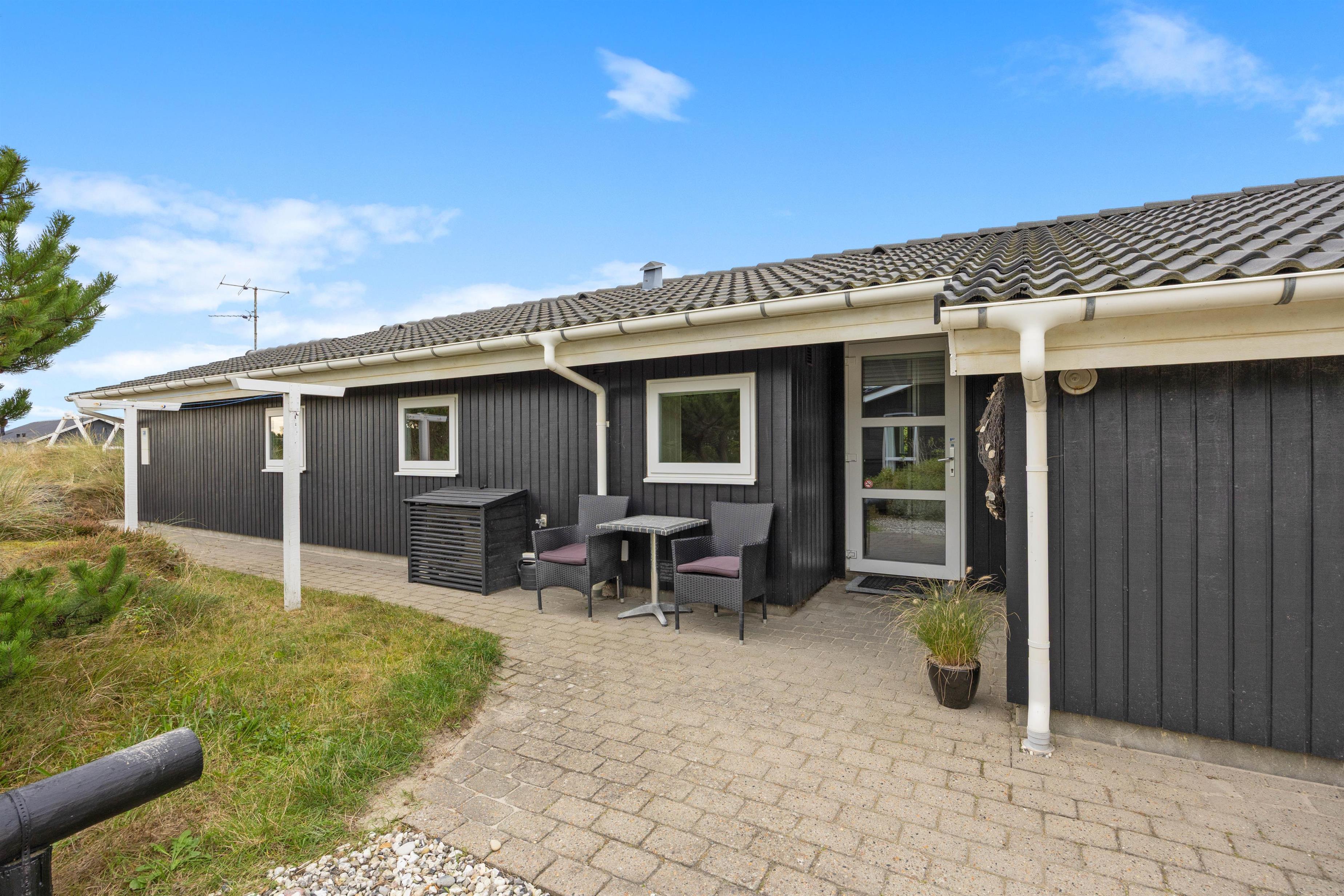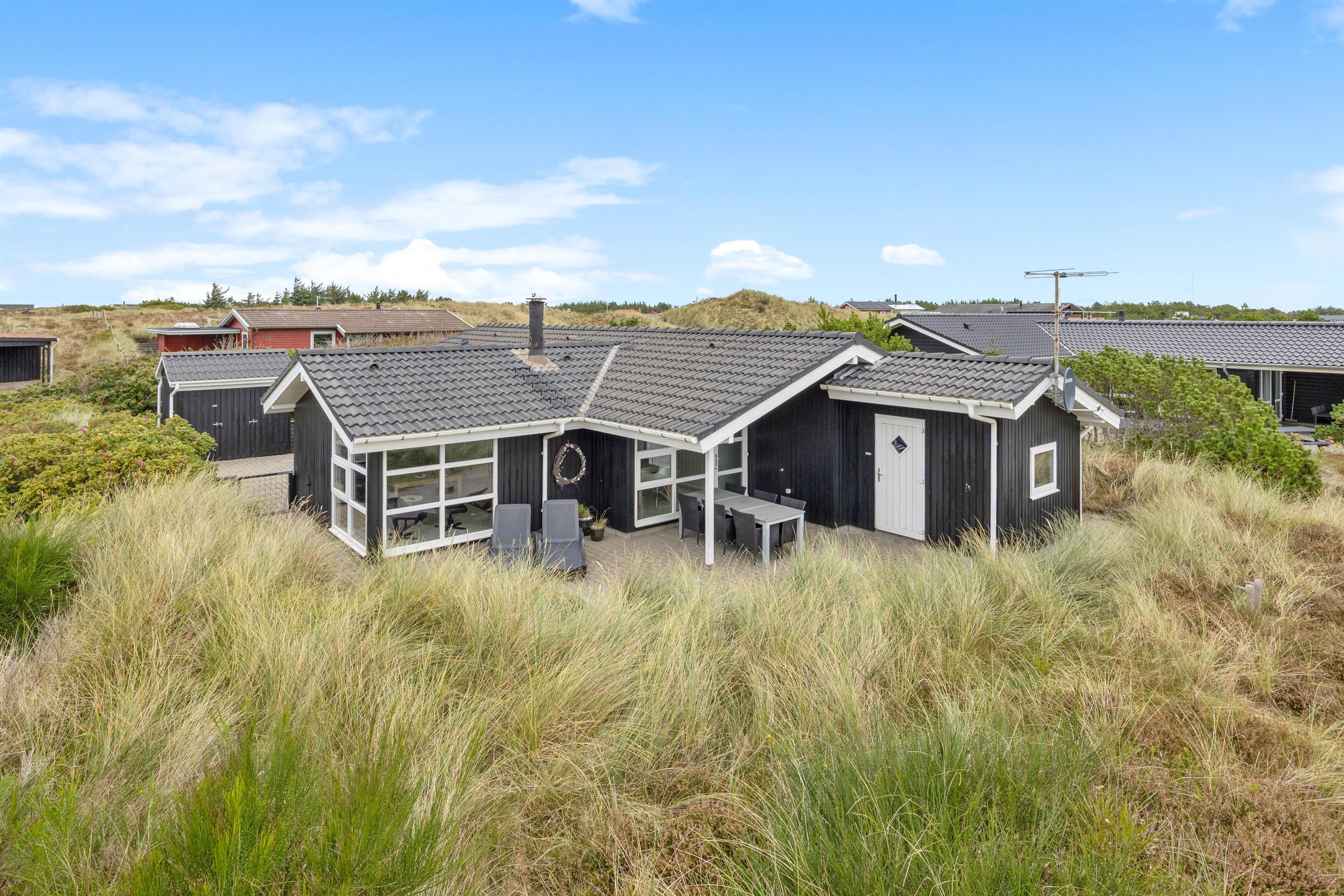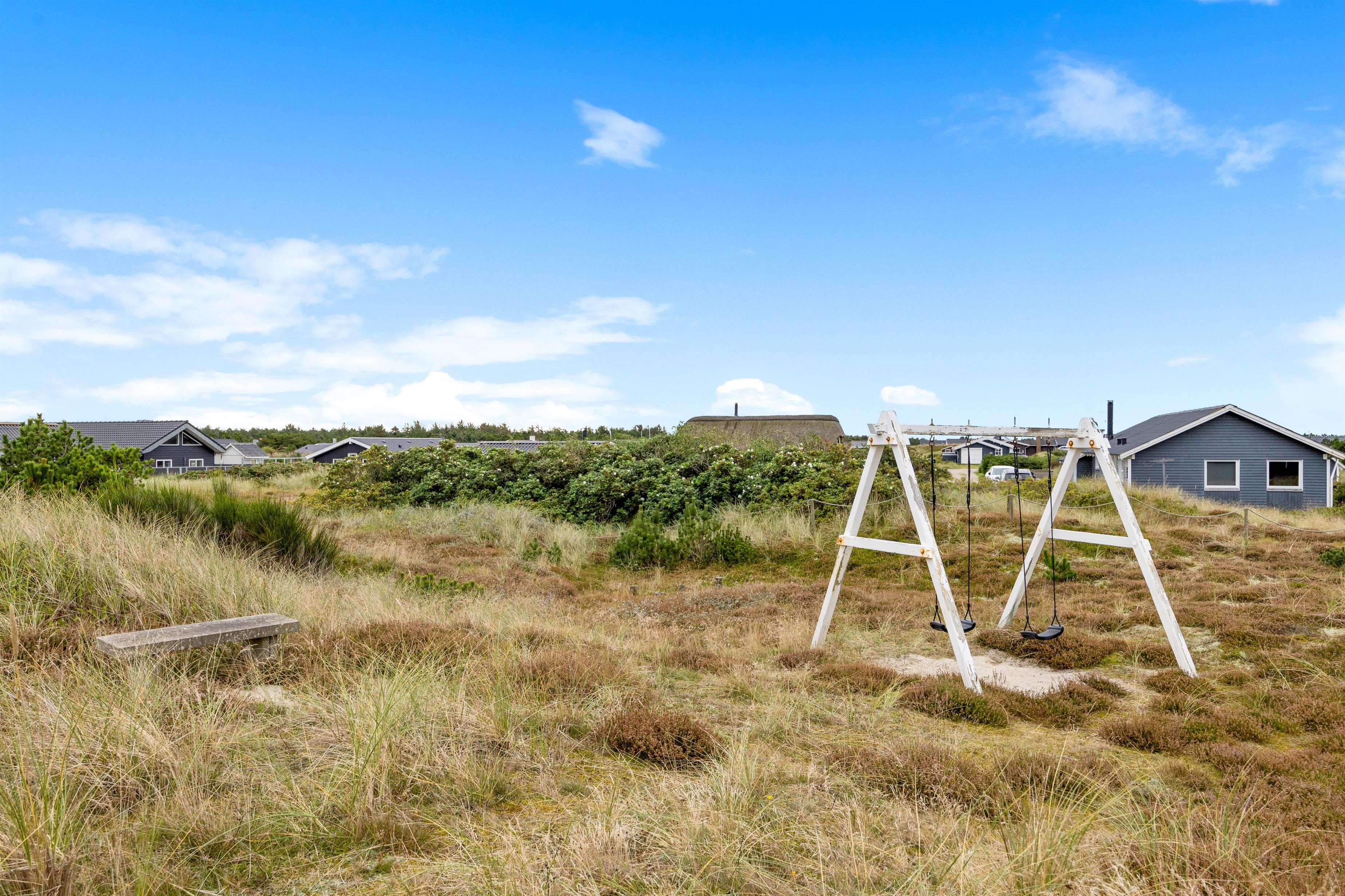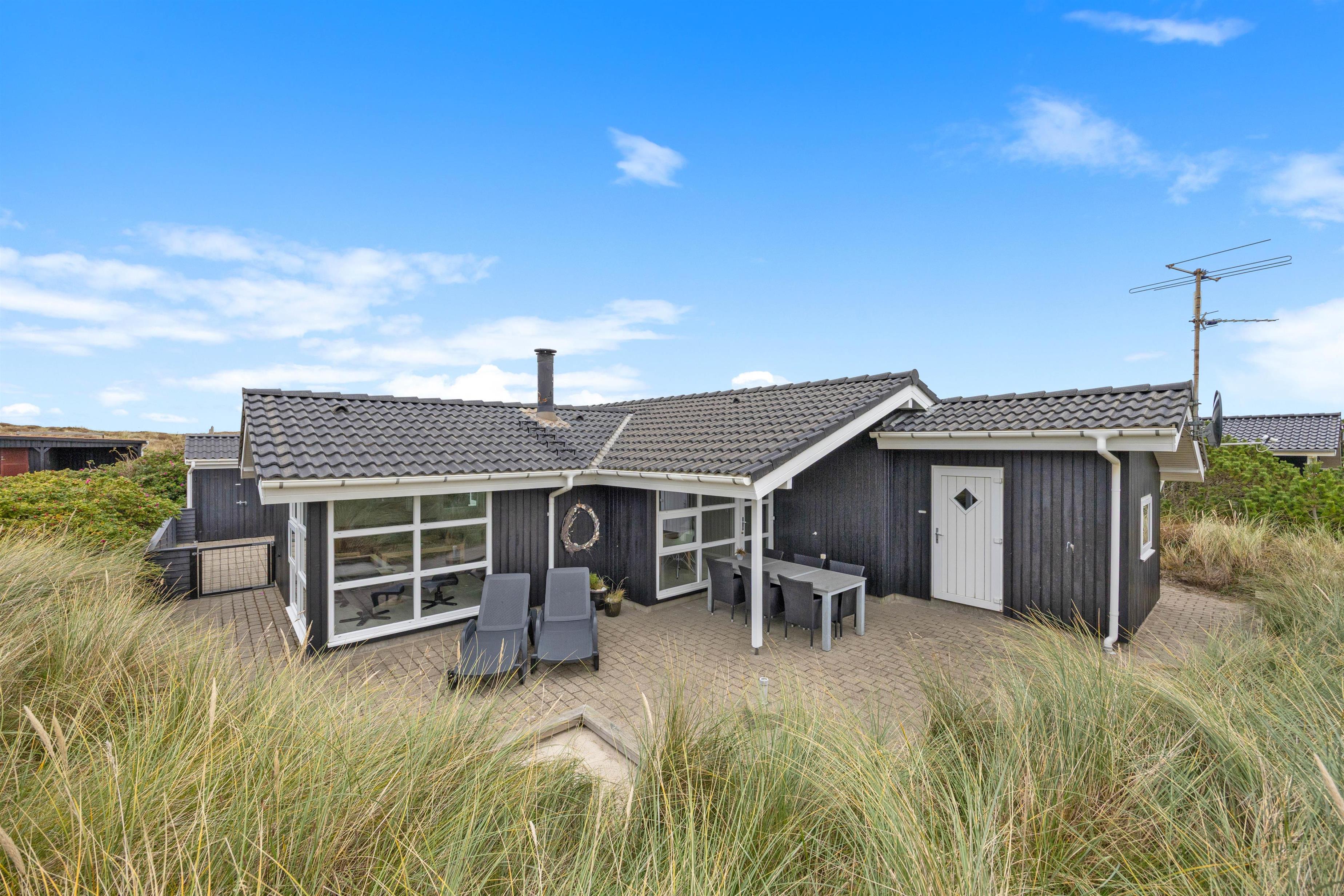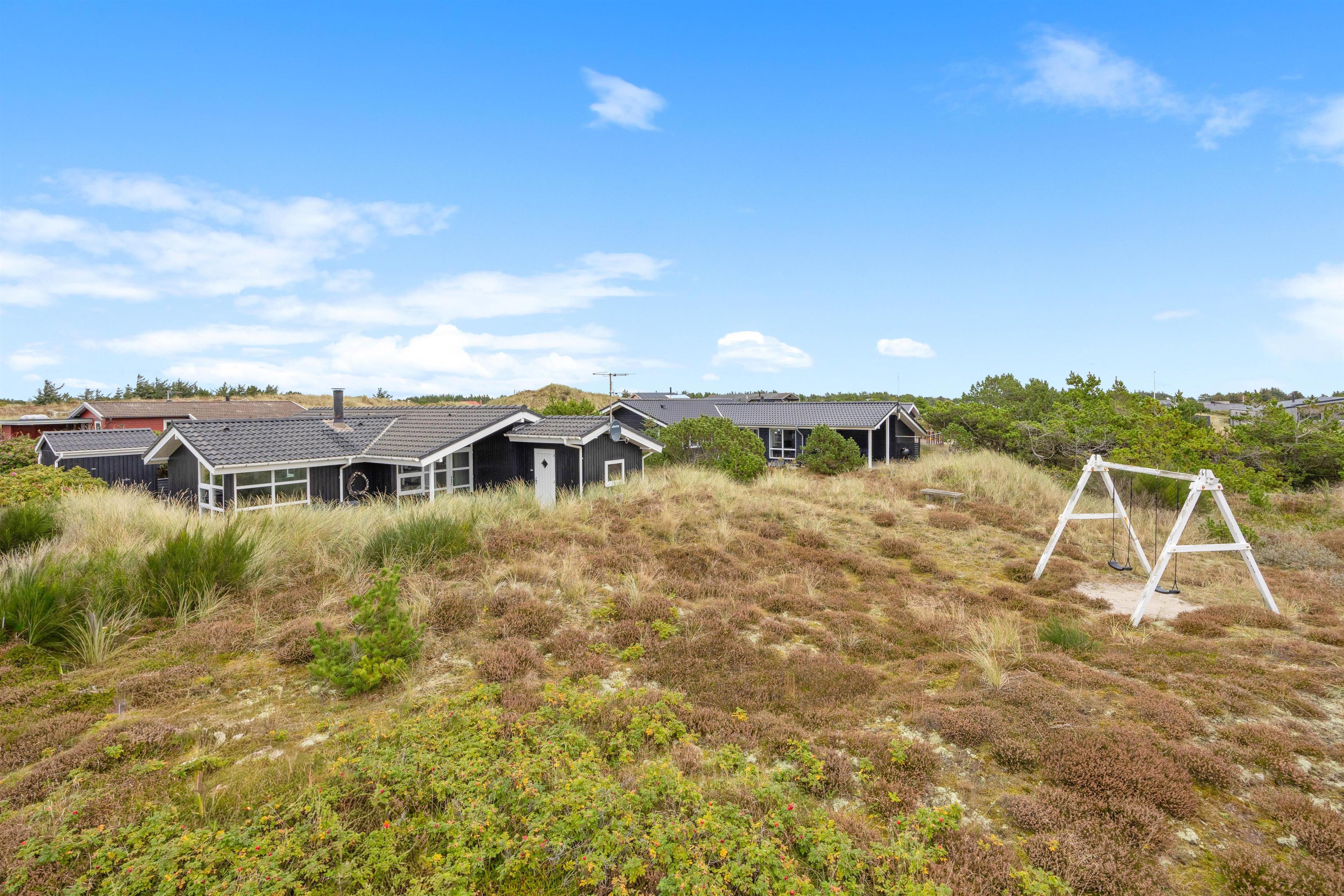På Holmsland Klit mellem hav og fjord i det skønne Vestjylland ligger dette indbydende feriehus. Den kuperede naturgrund gør, at du ugeneret kan slappe af på den store, delvis overdækkede terrasse. Her er naturligvis gode havemøbler og liggestole og det er altid muligt at finde en lækrog til afslapning og kulinariske udfoldelser på grillen. Til familiens yngste er der både sandkasse og gynge på naturgrunden.
