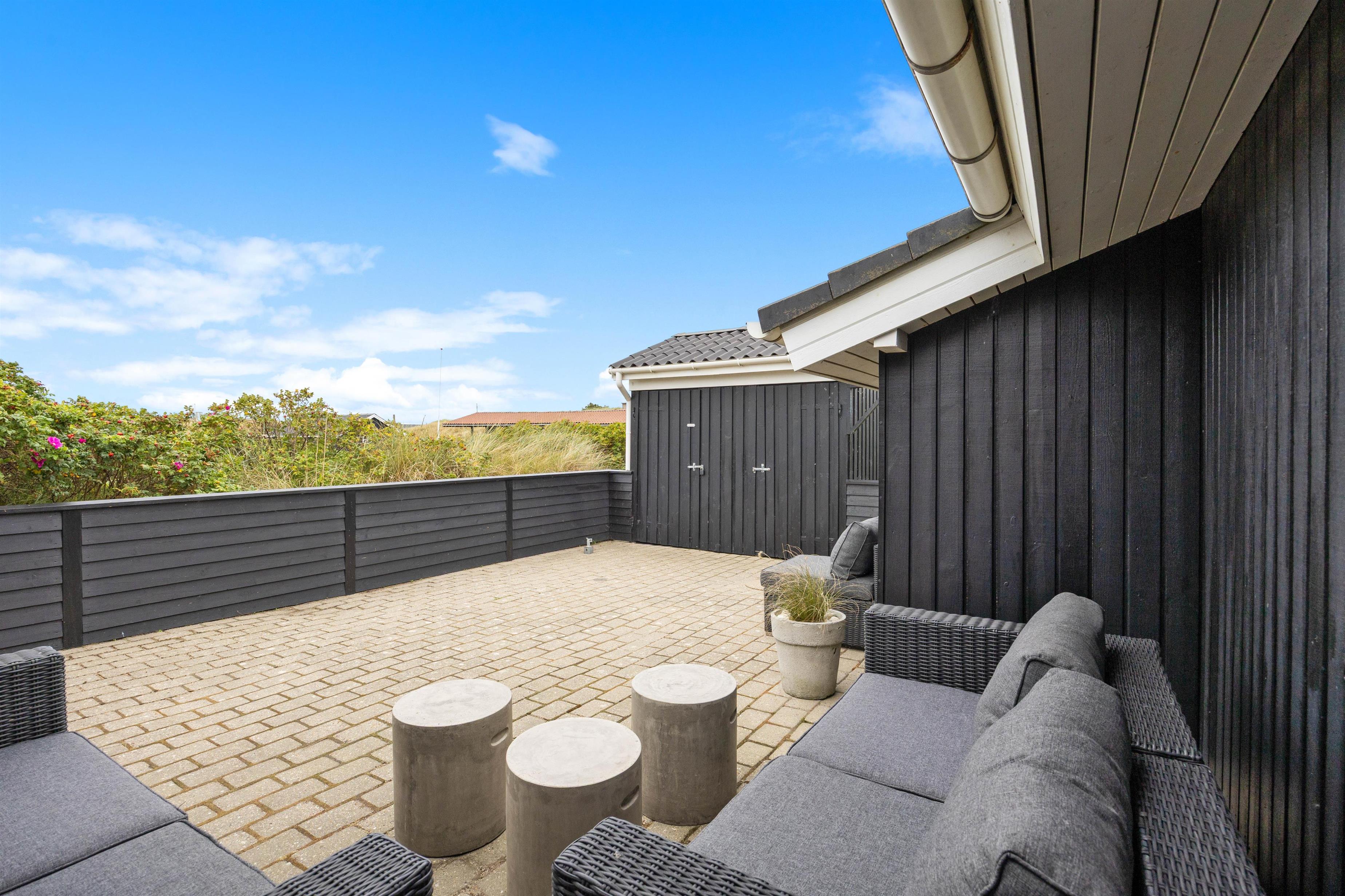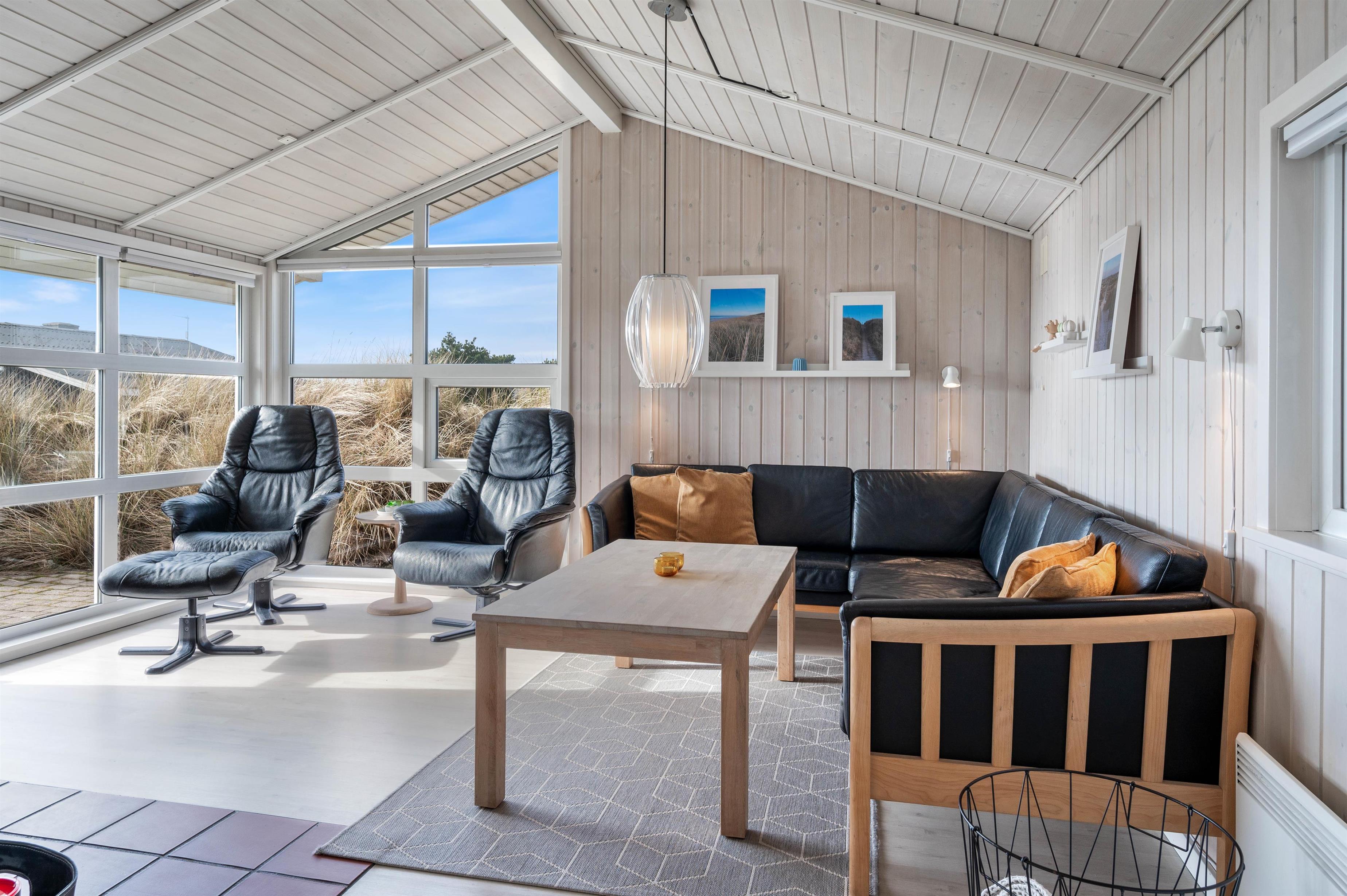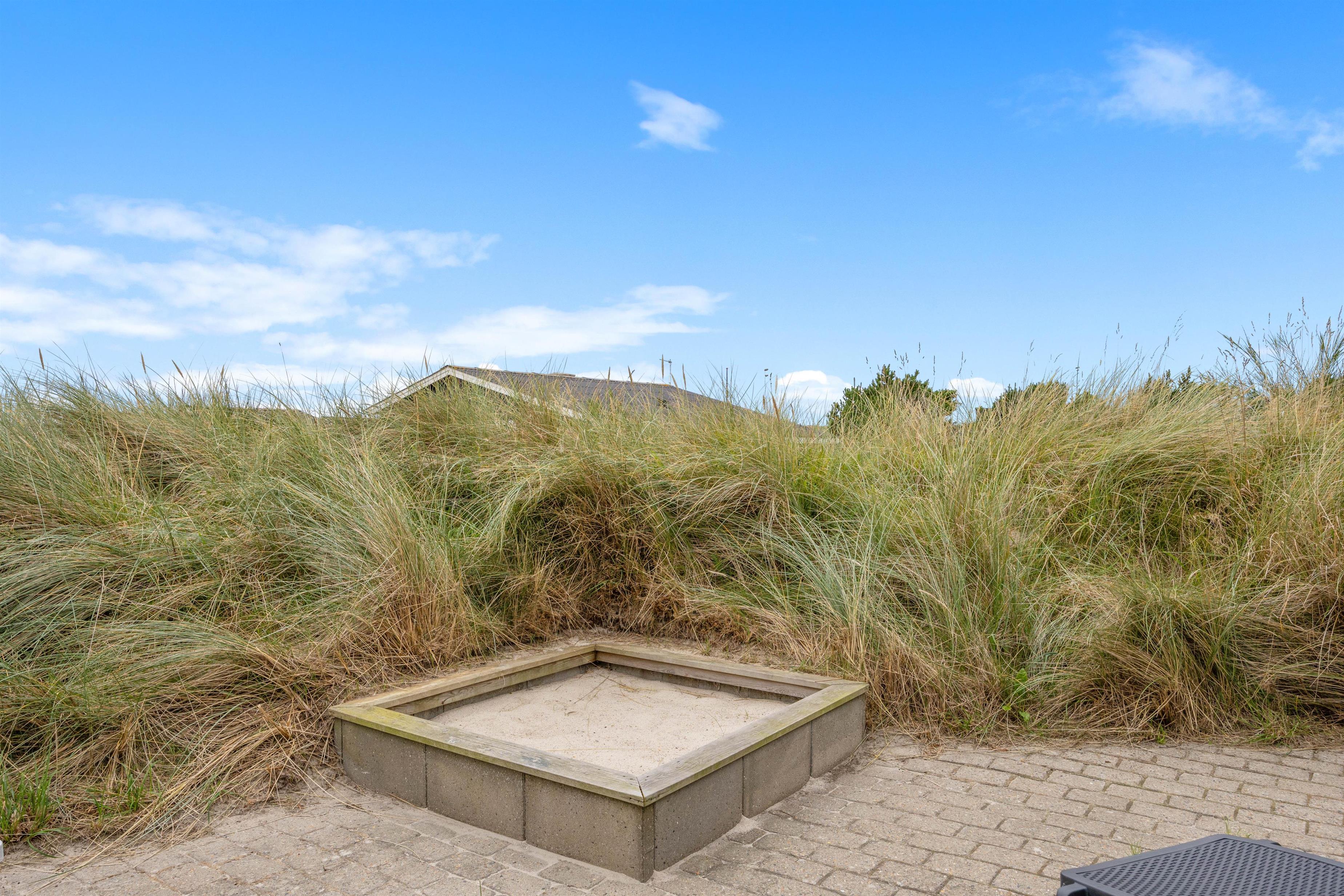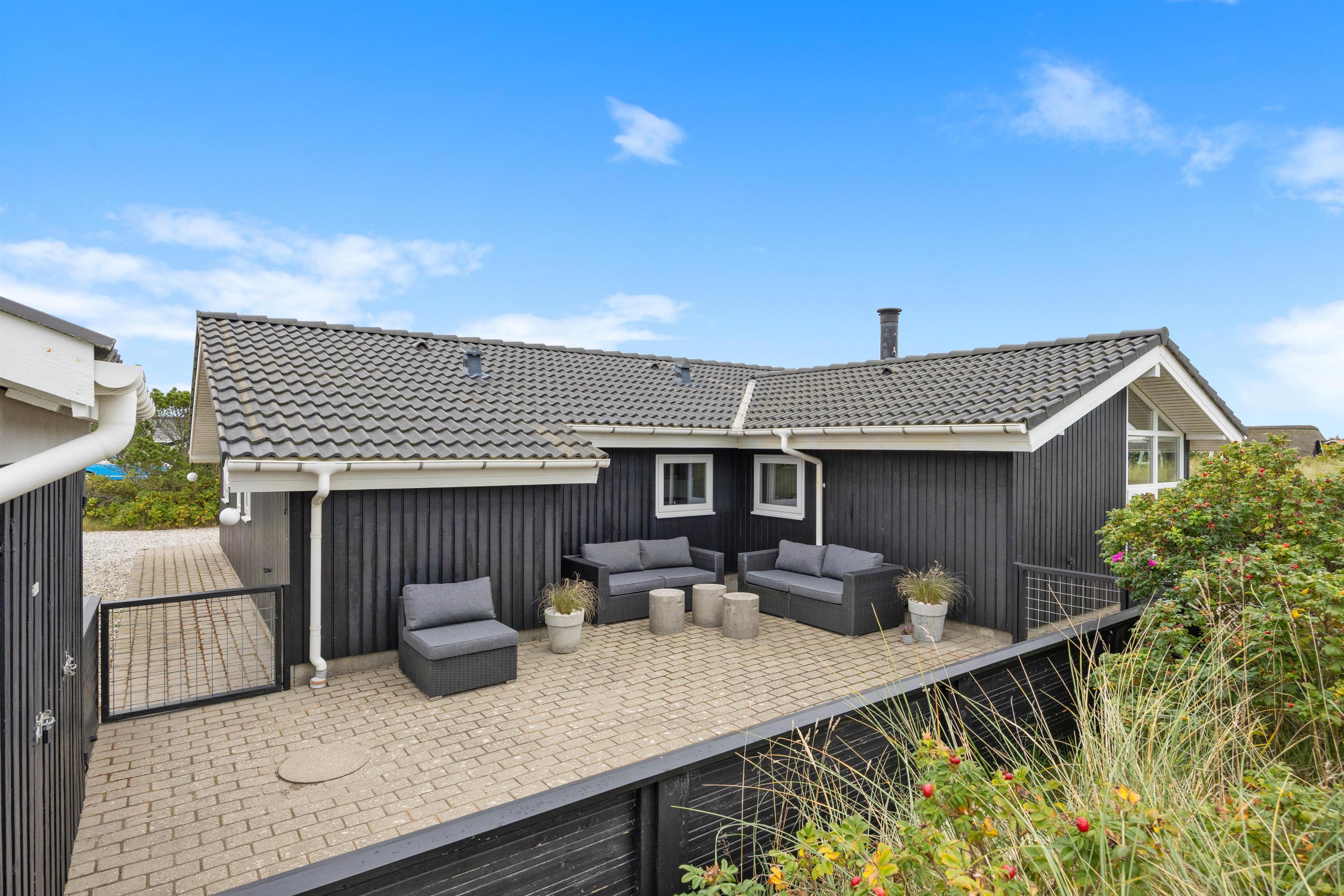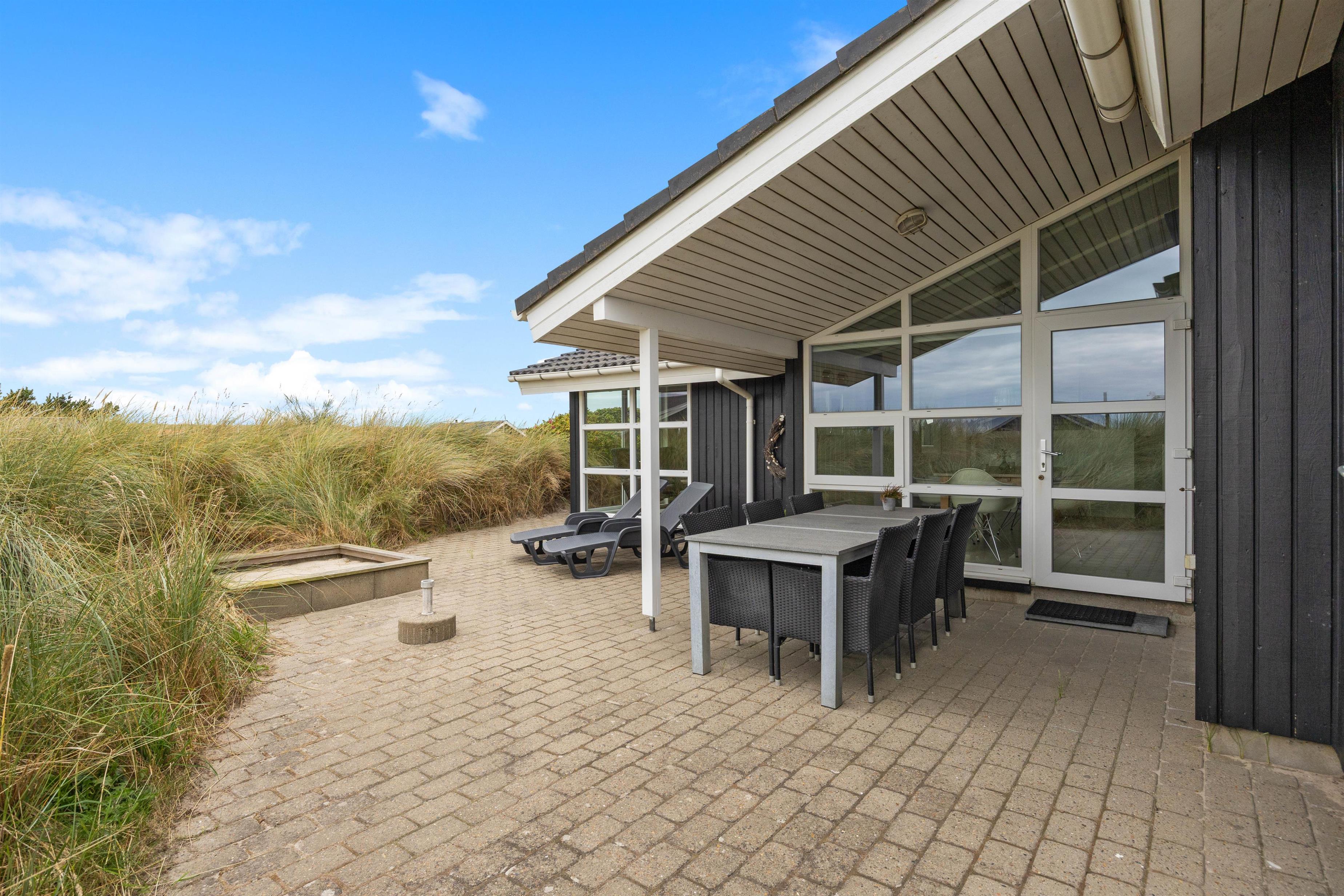 På Holmsland Klit mellem hav og fjord i det skønne Vestjylland ligger dette indbydende feriehus. Den kuperede naturgrund gør, at du ugeneret kan slappe af på den store, delvis overdækkede terrasse. Her er naturligvis gode havemøbler og liggestole og det er altid muligt at finde en lækrog til afslapning og kulinariske udfoldelser på grillen. Til familiens yngste er der både sandkasse og gynge på naturgrunden.