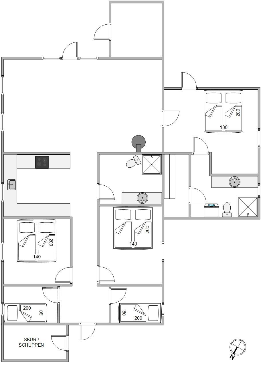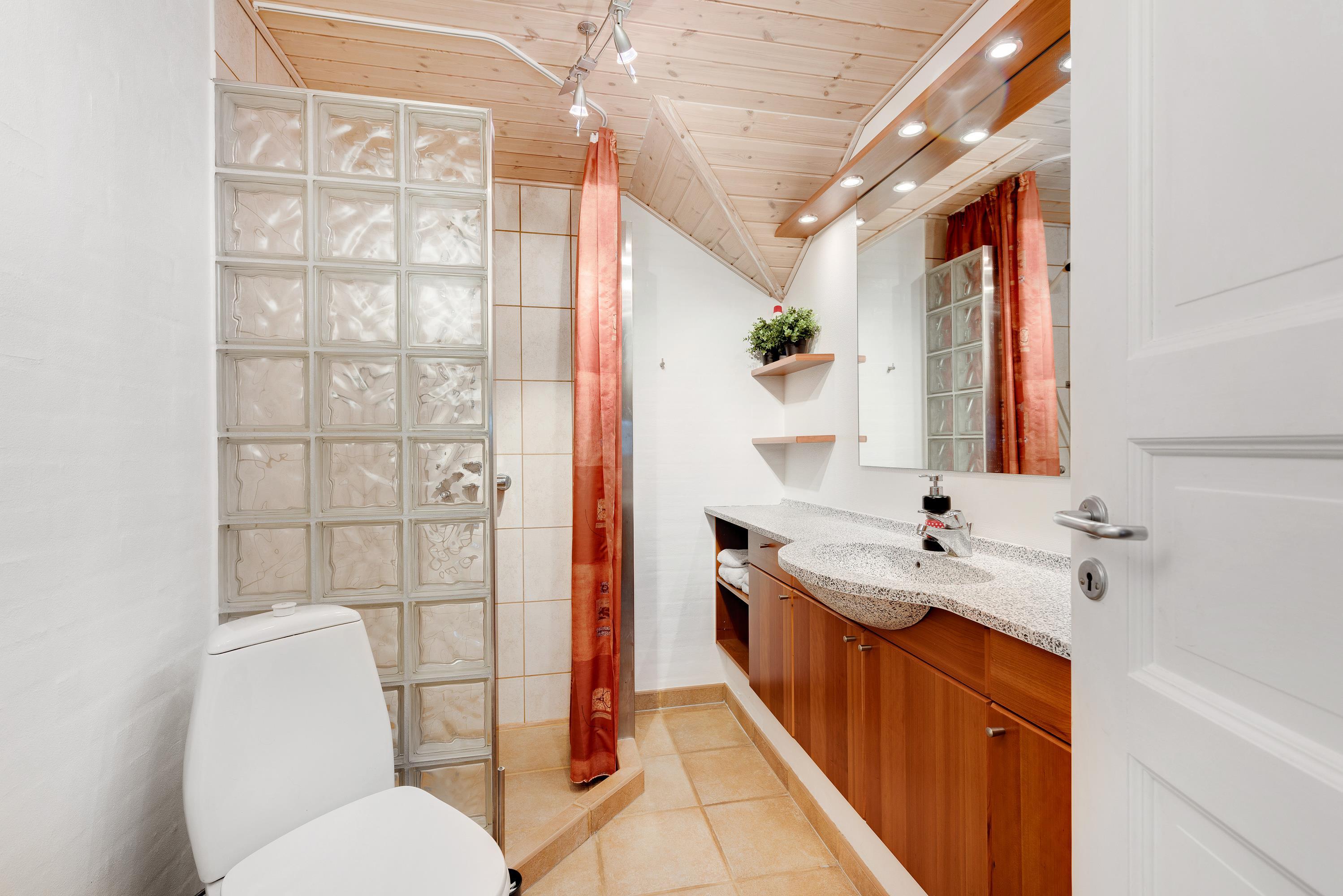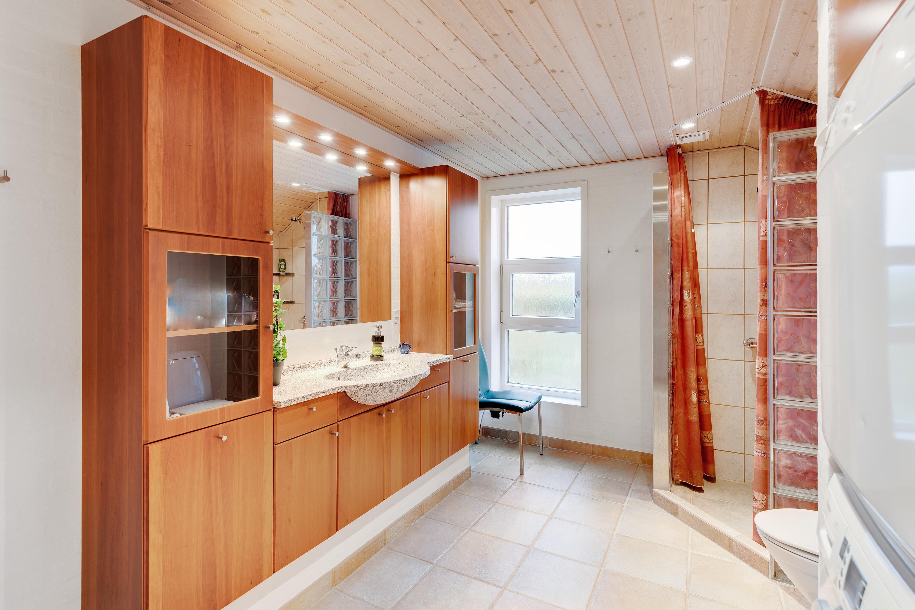 I sommerhuset forefindes 2 badeværelser, begge med bruseniche og behagelig gulvvarme, som er dejligt at betræde en kold morgen med de bare fødder. I det ene badeværelse er der direkte adgang til saunaen, hvor der er rigeligt med plads til jer.