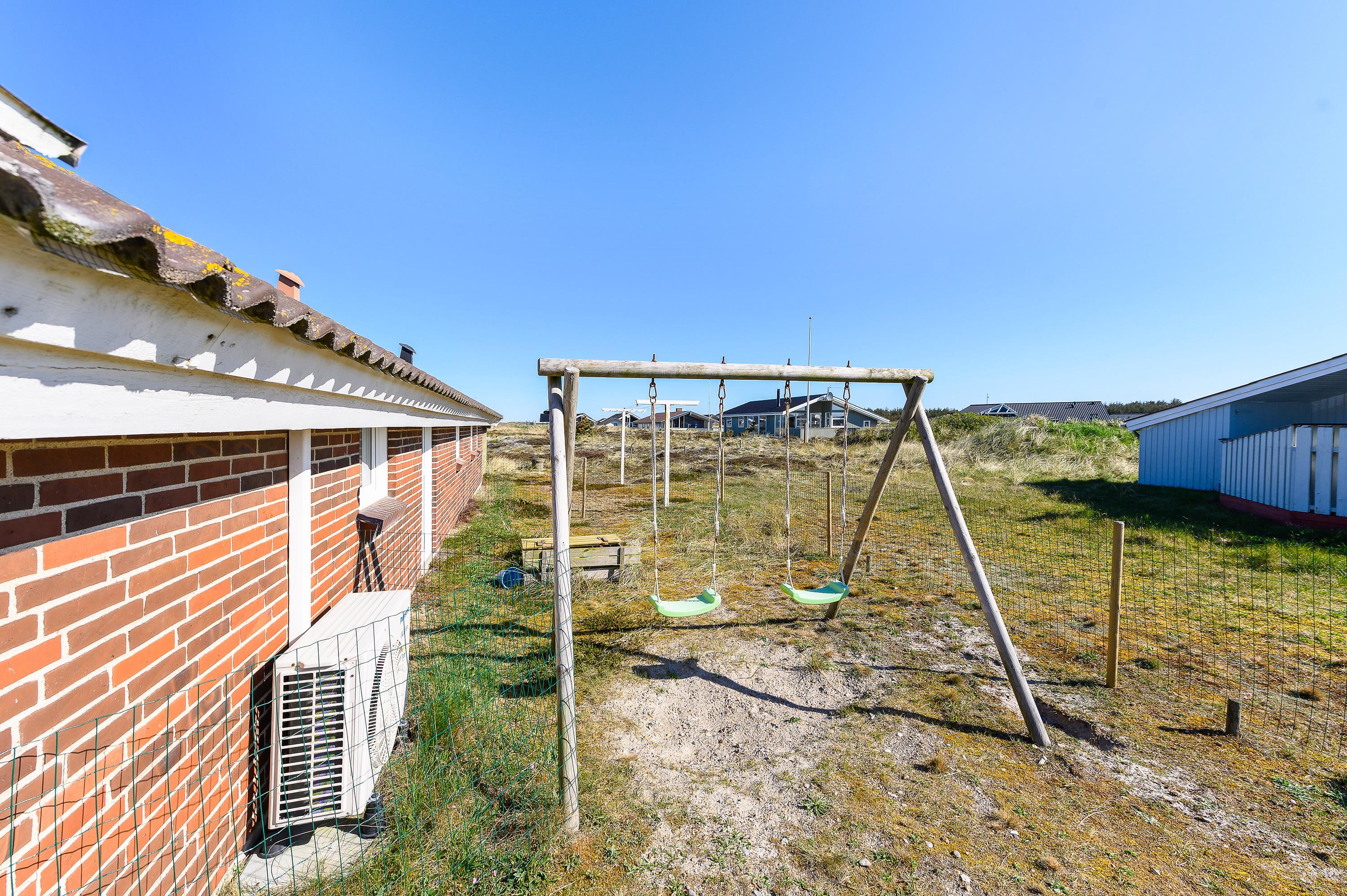 Feriehuset har en hyggelig, lukket terrasse og er beliggende på en naturgrund. Der er sandkasse og gynger til familiens mindste, så læg jer i liggestolene og nyd ferien, mens børnene leger.