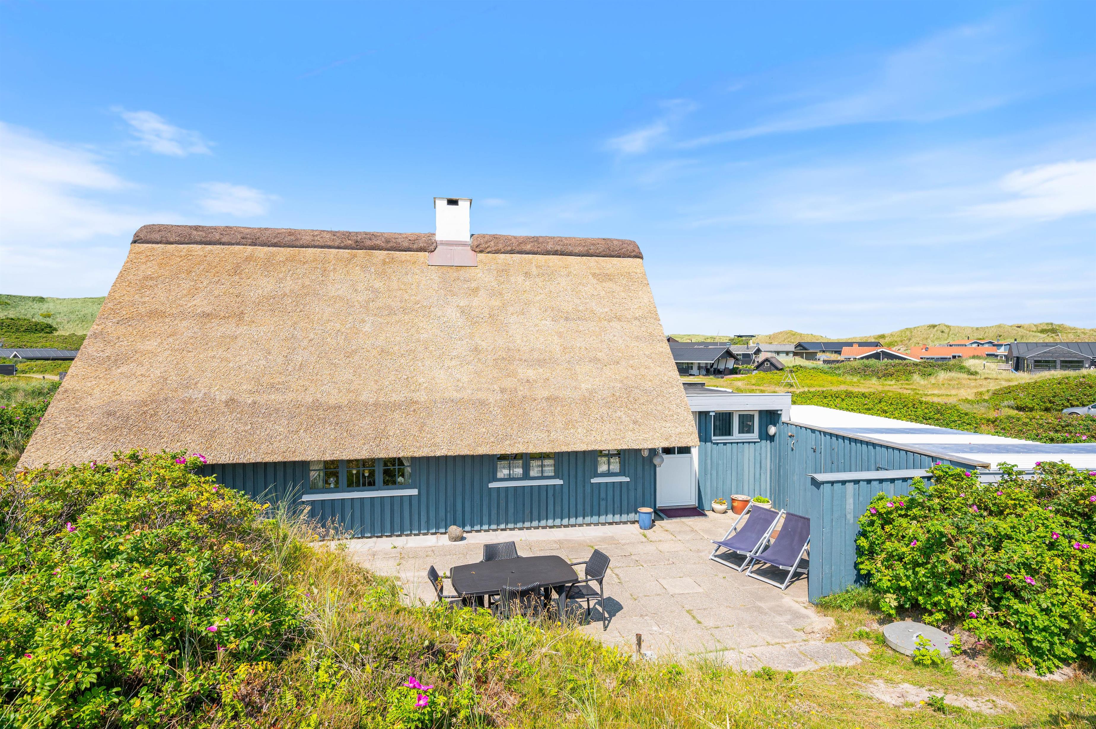 Julianevej 142 ligger kun 150 meter fra Vesterhavet og den kilometerlange hvide sandstrand. Den delvist afskærmede og overdækkede terrasse inviterer til afslapning i solen i komfortable havemøbler. Eller I kan tilberede og nyde et lækkert grillmåltid i den friske luft.