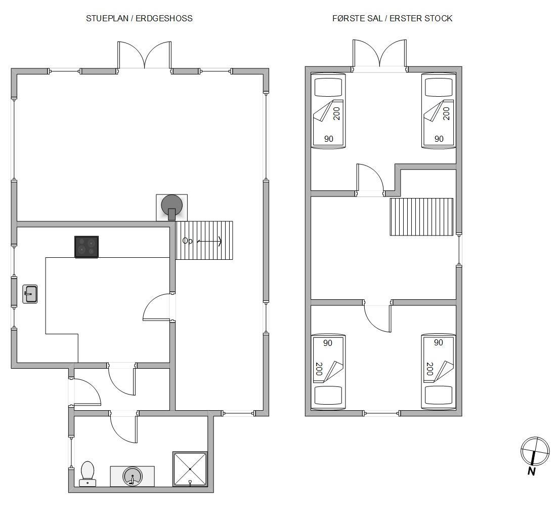 Førstesalen indeholder 2 soveværelser og en charmerende repos med et par gode stole, hvor du kan sidde med en god bog og en kop te. Fra det ene soveværelse er der endvidere udgang til en lille svalegang, hvor I kan nyde udsigten over det betagende klitlandskab.