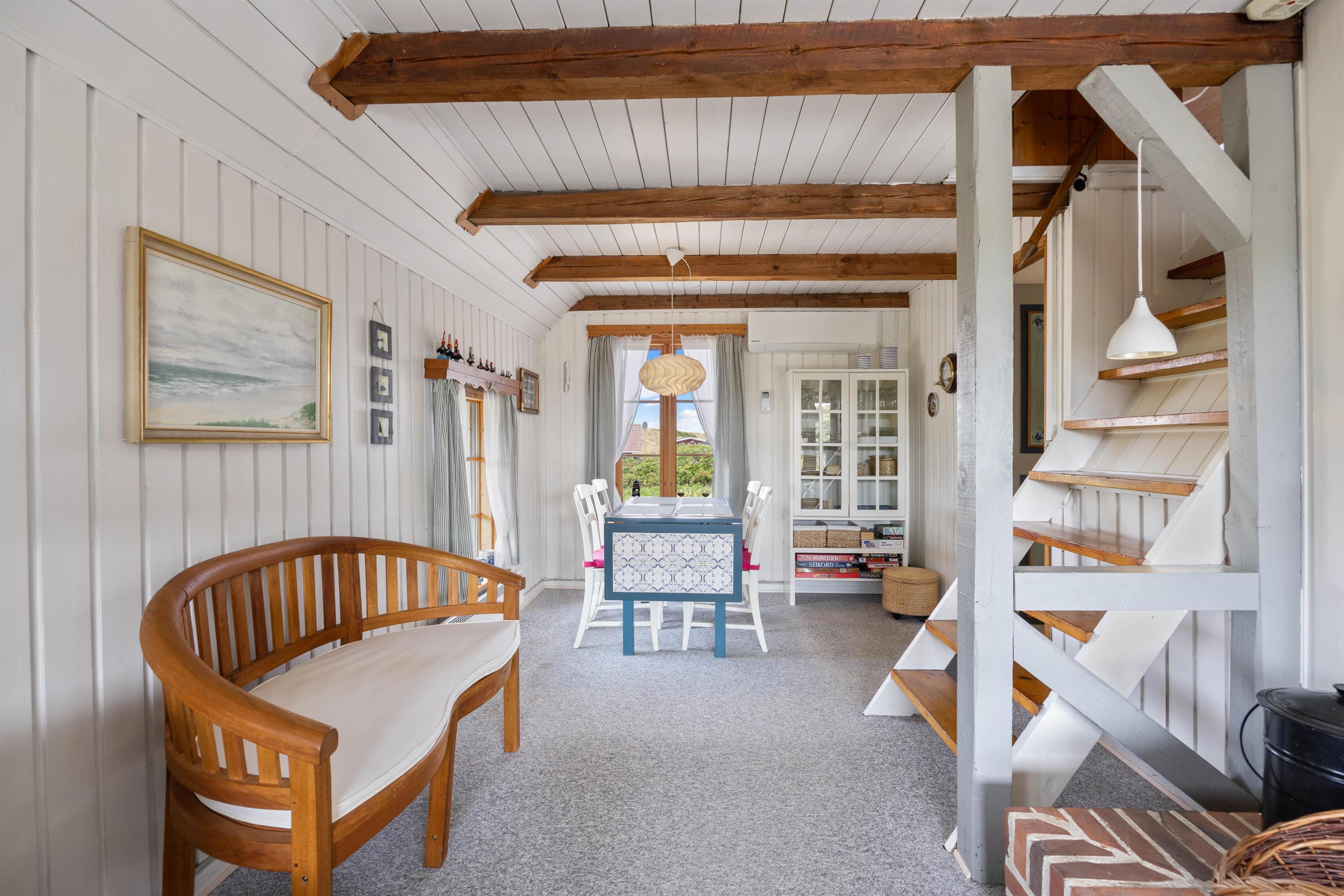Feriehuset er dekorativt indrettet med personlig stemning og charme. I stueetagen er der hvidmalede trævægge i kombination med murstensvægge. På gulvene er der klinker, træ og tæpper, og de synlige bjælker i loftet fremhæver sommerhusets stil. Møblerne er tilpasset stilen med retro træmøbler, fletstole og sofa. Her finder I et badeværelse med bruser, et lyst og praktisk indrettet køkken og stue med spiseplads, brændeovn, fladskærms-TV og en hyggelig sofagruppe.