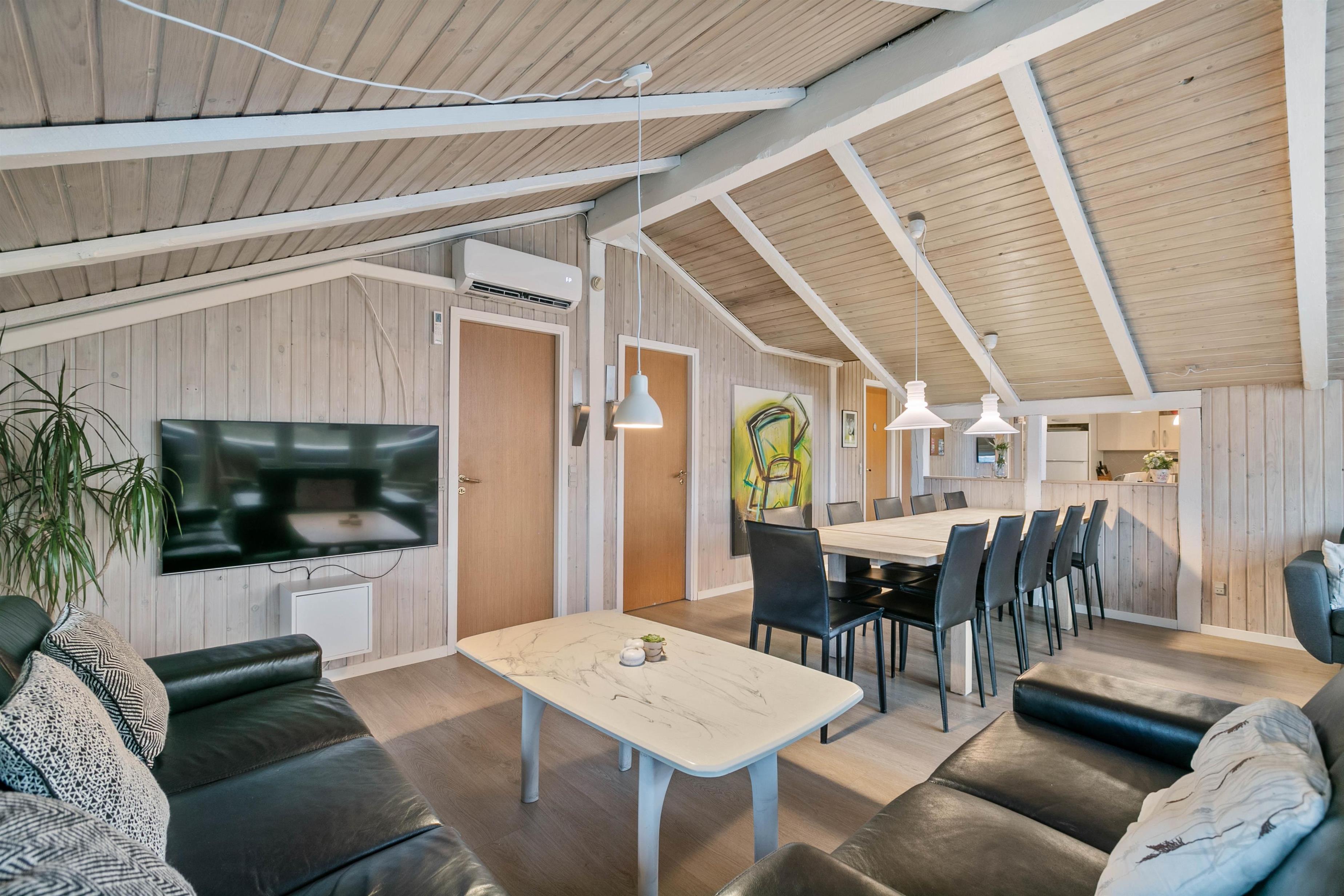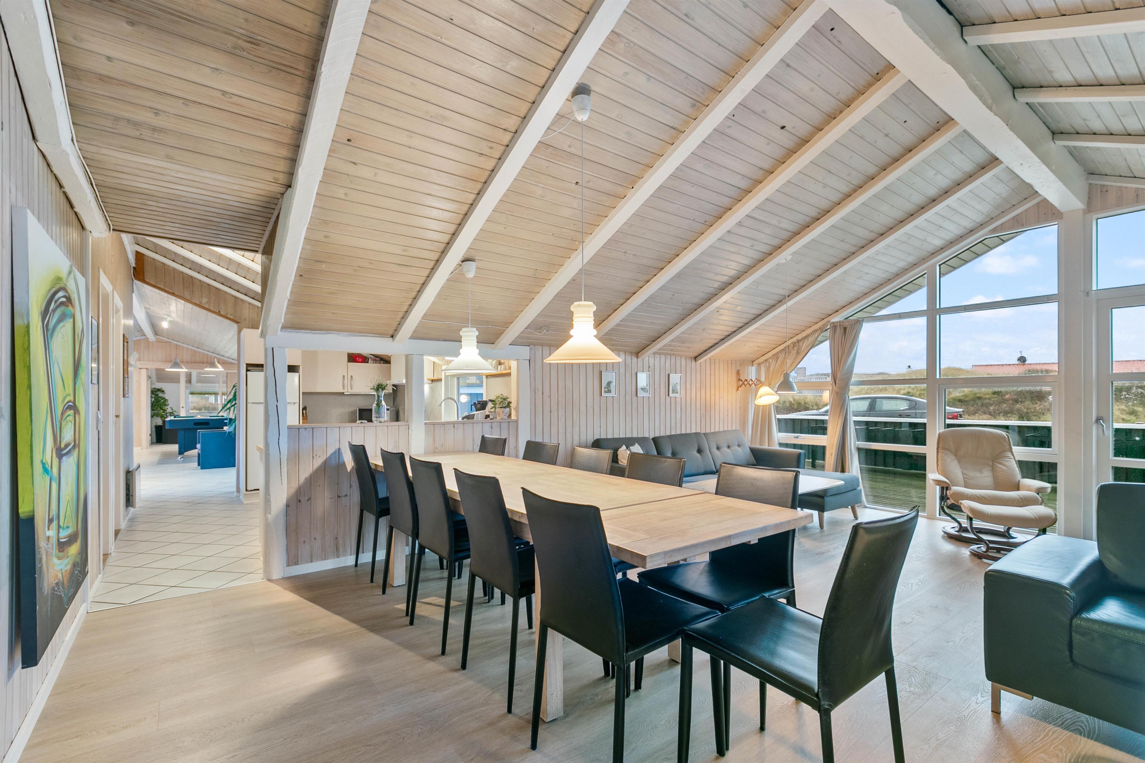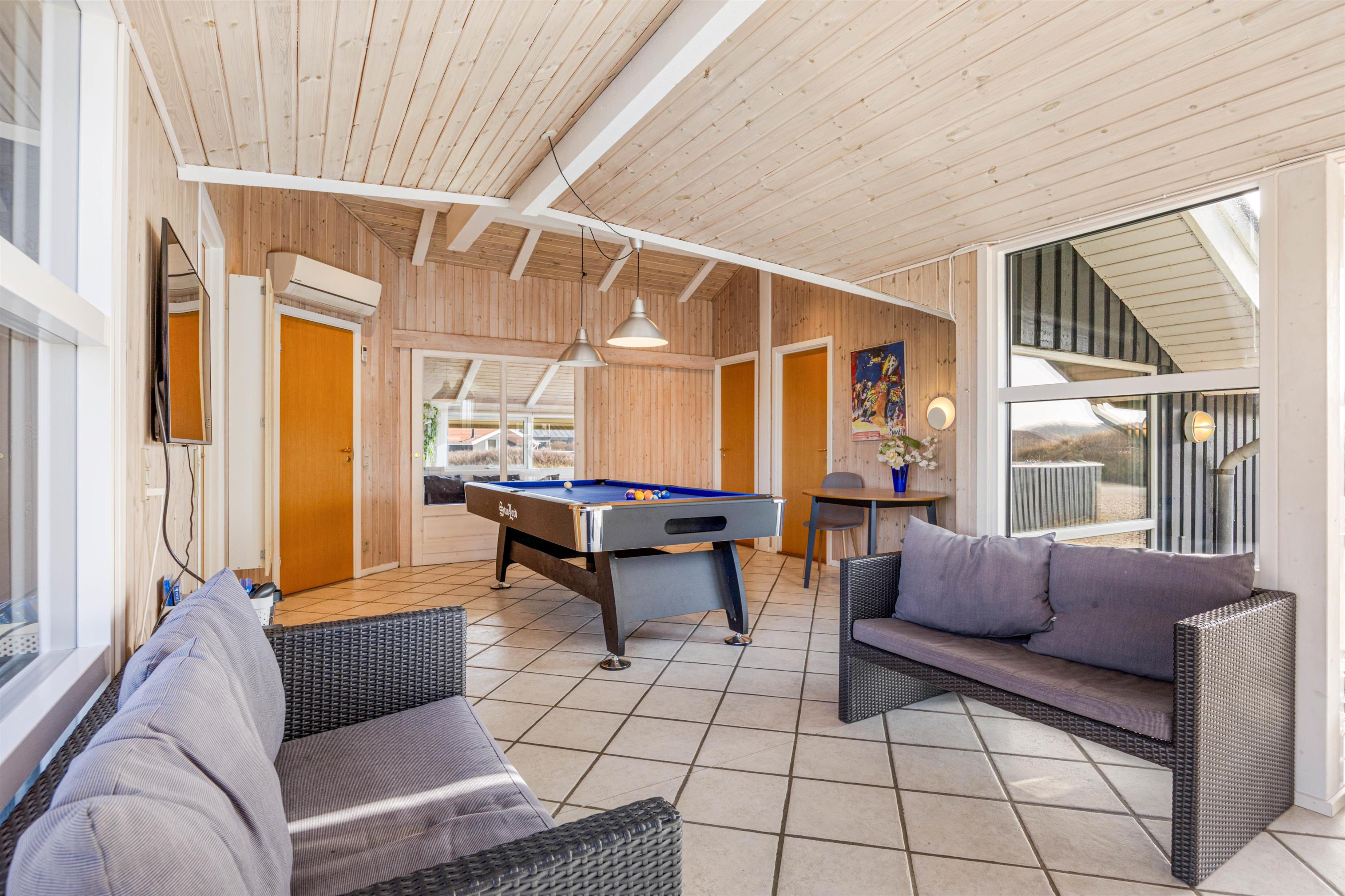 Det store feriehus har 2 opholdsrum, forbundet af køkkenafdelingen. Det ene opholdsrum har et billardbord i centrum – her kan familiedysten afgøres. Der er ligeledes plads til at hygge med kort- eller brætspil.