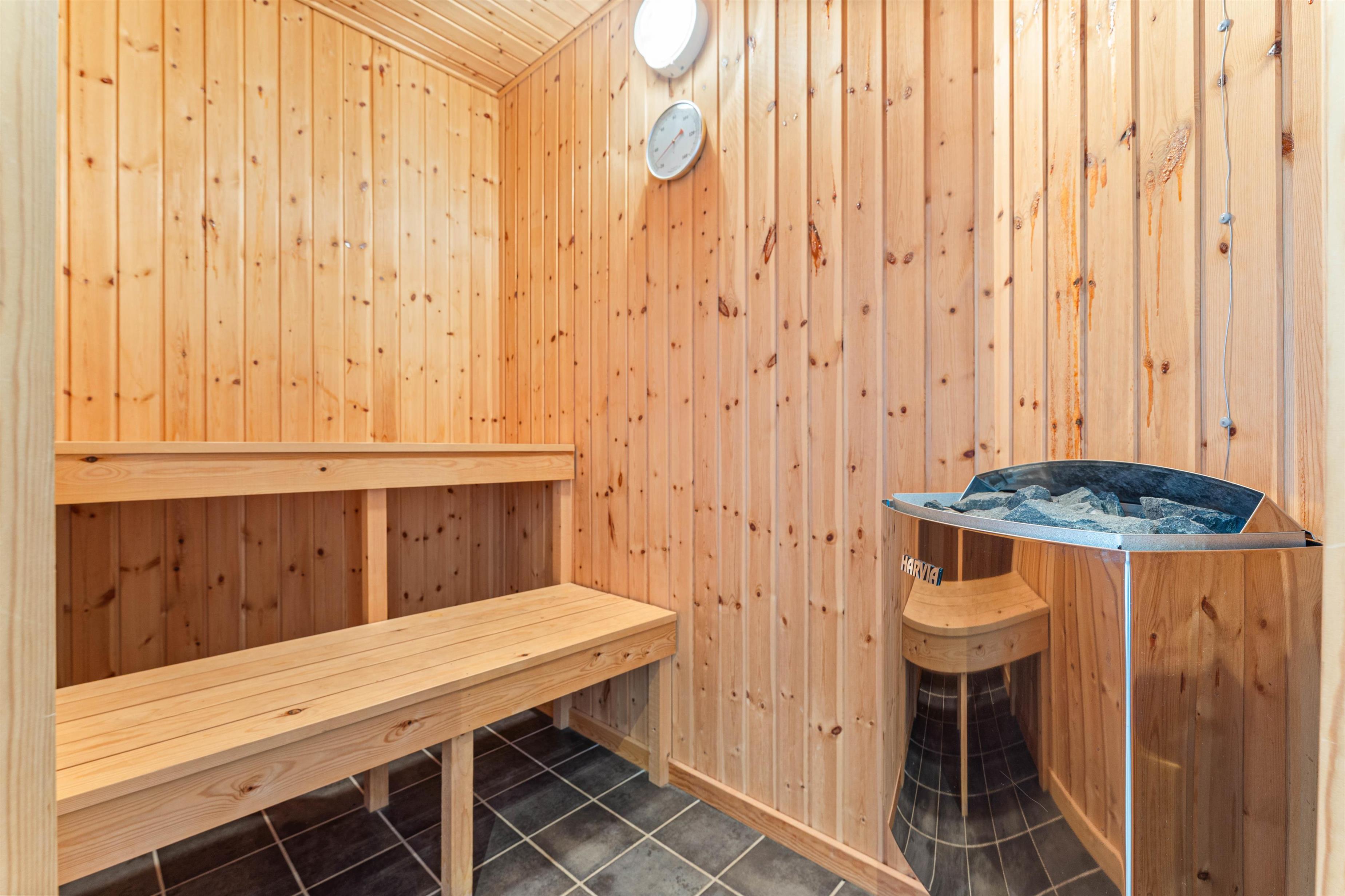 Her er et rigtig flot badeværelse med bruseniche, spa og indgang til sauna, hvor I rigtig kan få slappet af i løbet af ferien.