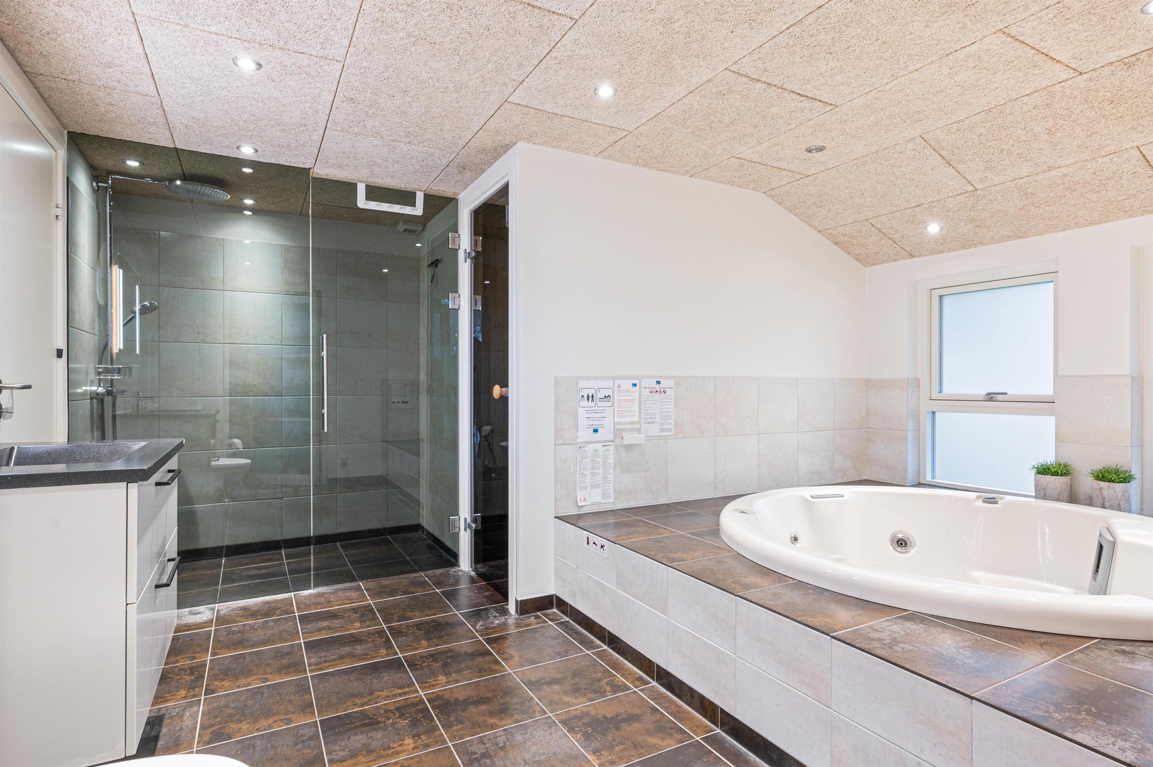 På det ene badeværelse er der en dejlig sauna og et stort spabad, der indbyder til afslappende stunder, hvor du virkelig mærker, det er ferie. Og som prikken over i'et er der en udendørs spa på terrassen, hvilket giver mulighed for lidt wellness under den smukke stjernehimmel.