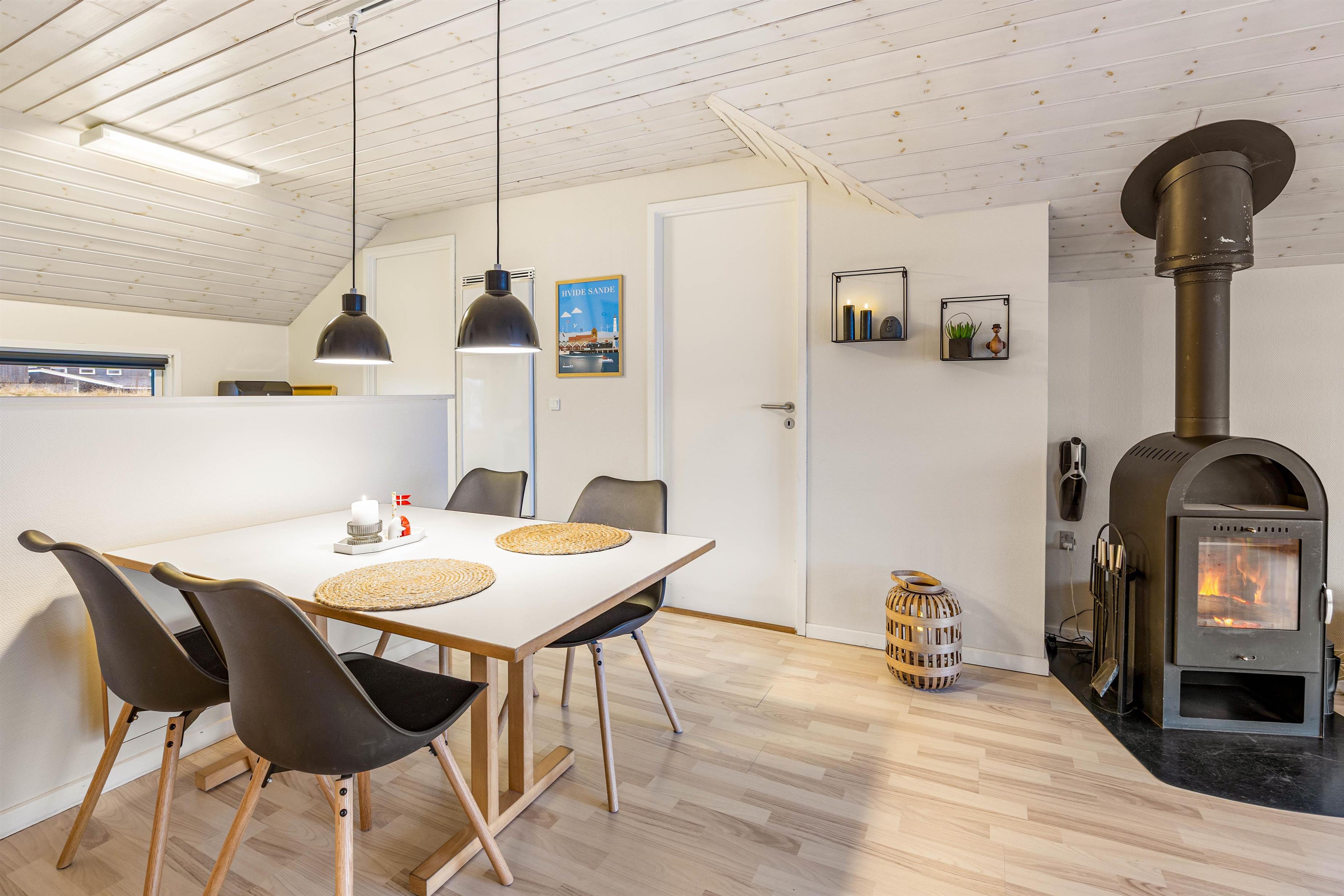 På kølige dage sørger brændeovnen for både hygge og varme i stuen, og der er også installeret en energibesparende varmepumpe, som hjælper med at holde el-forbruget nede.