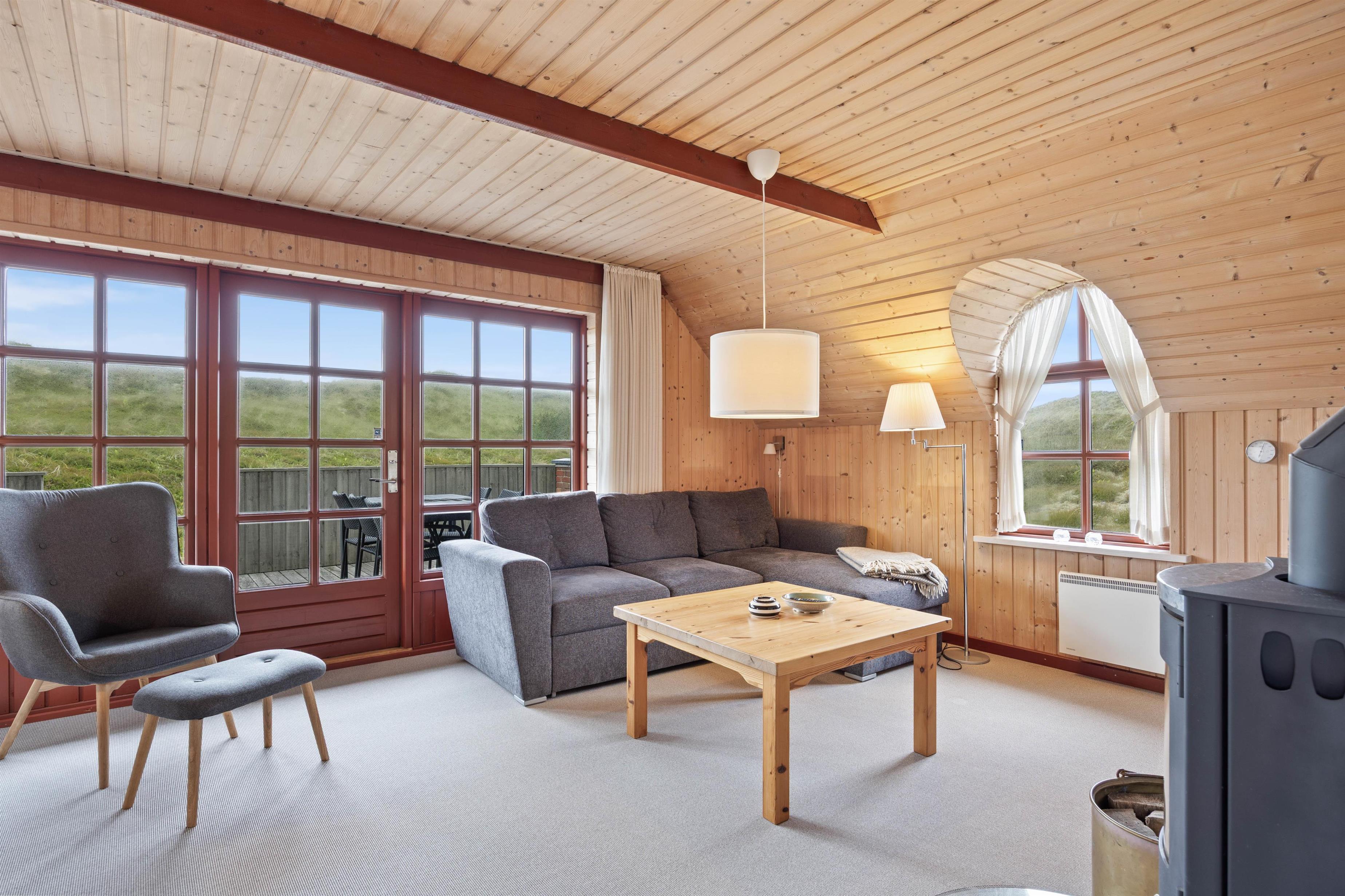 Indenfor mærker man straks feriestemningen med den knitrende ild i brændeovnen. Det store vinduesparti giver et fint lysindfald og åbner op for panoramaudsigten over det omkringliggende klitlandskab. Varmepumpen sikrer et behageligt indeklima året rundt, mens du hygger dig i sofaen.