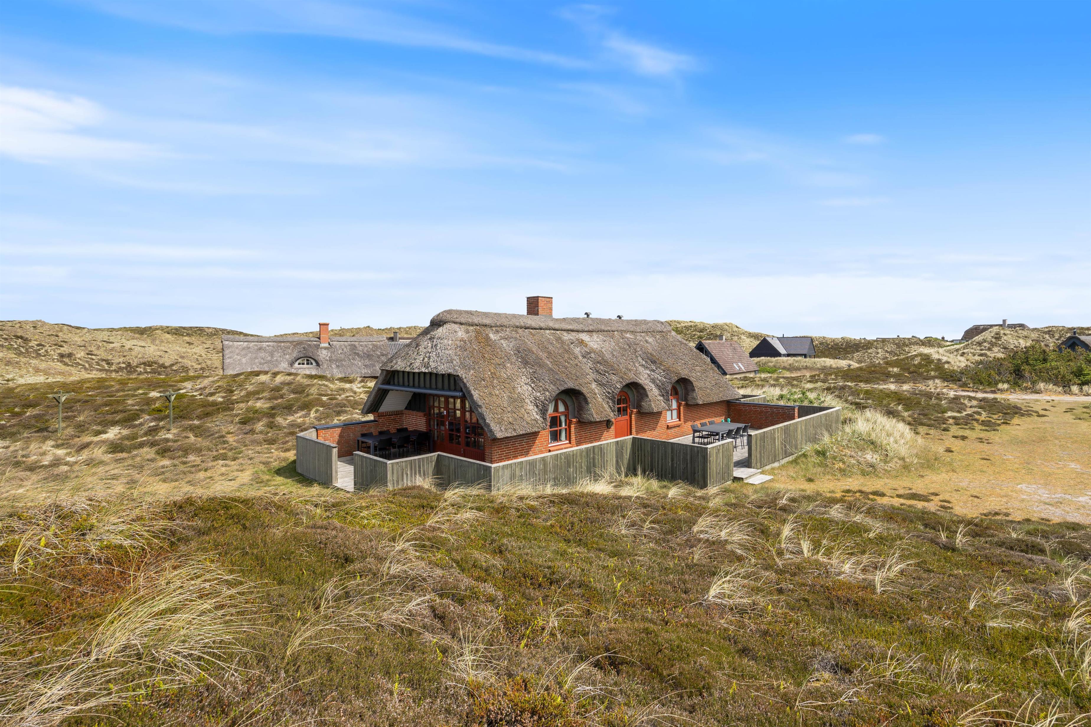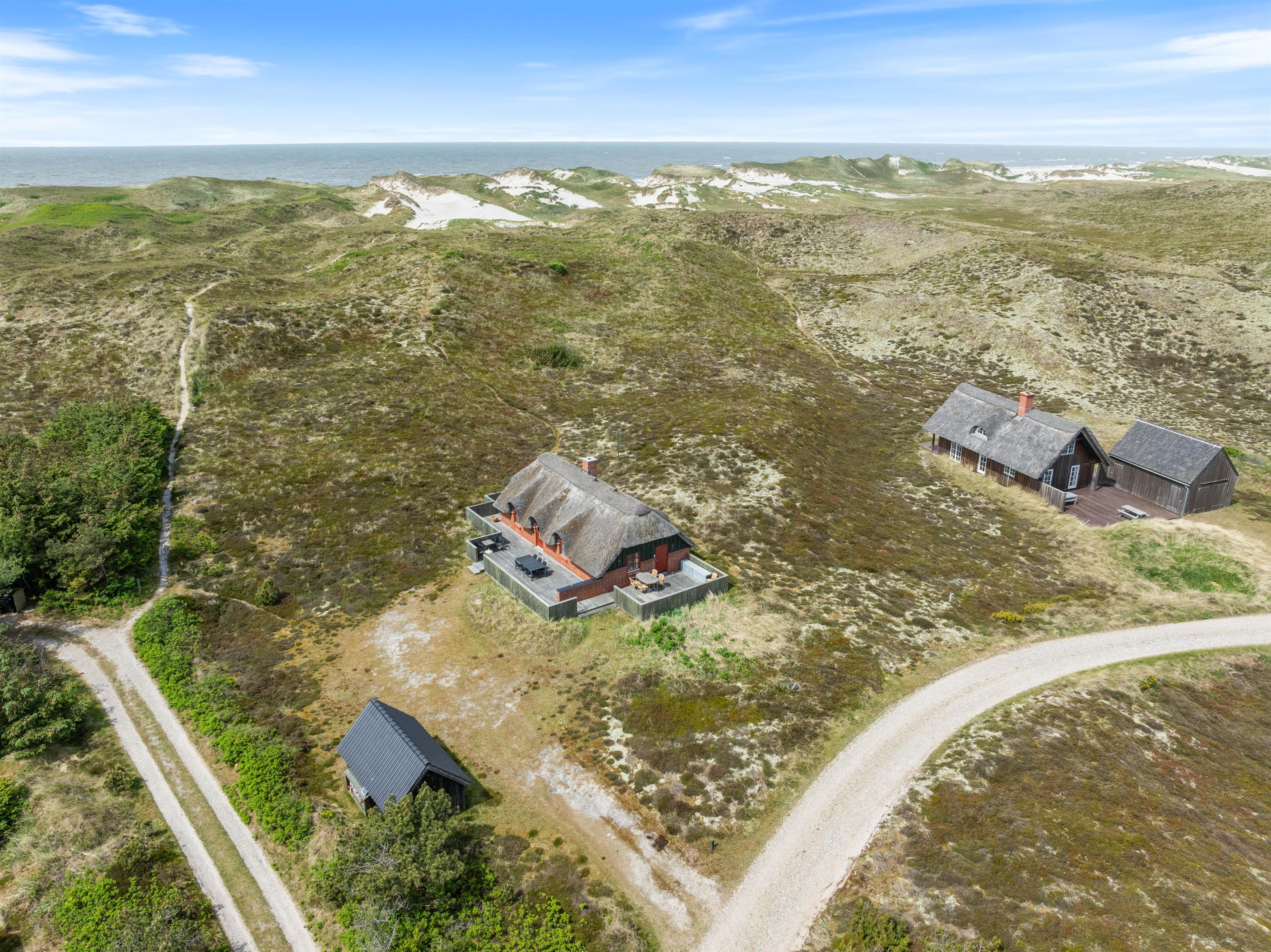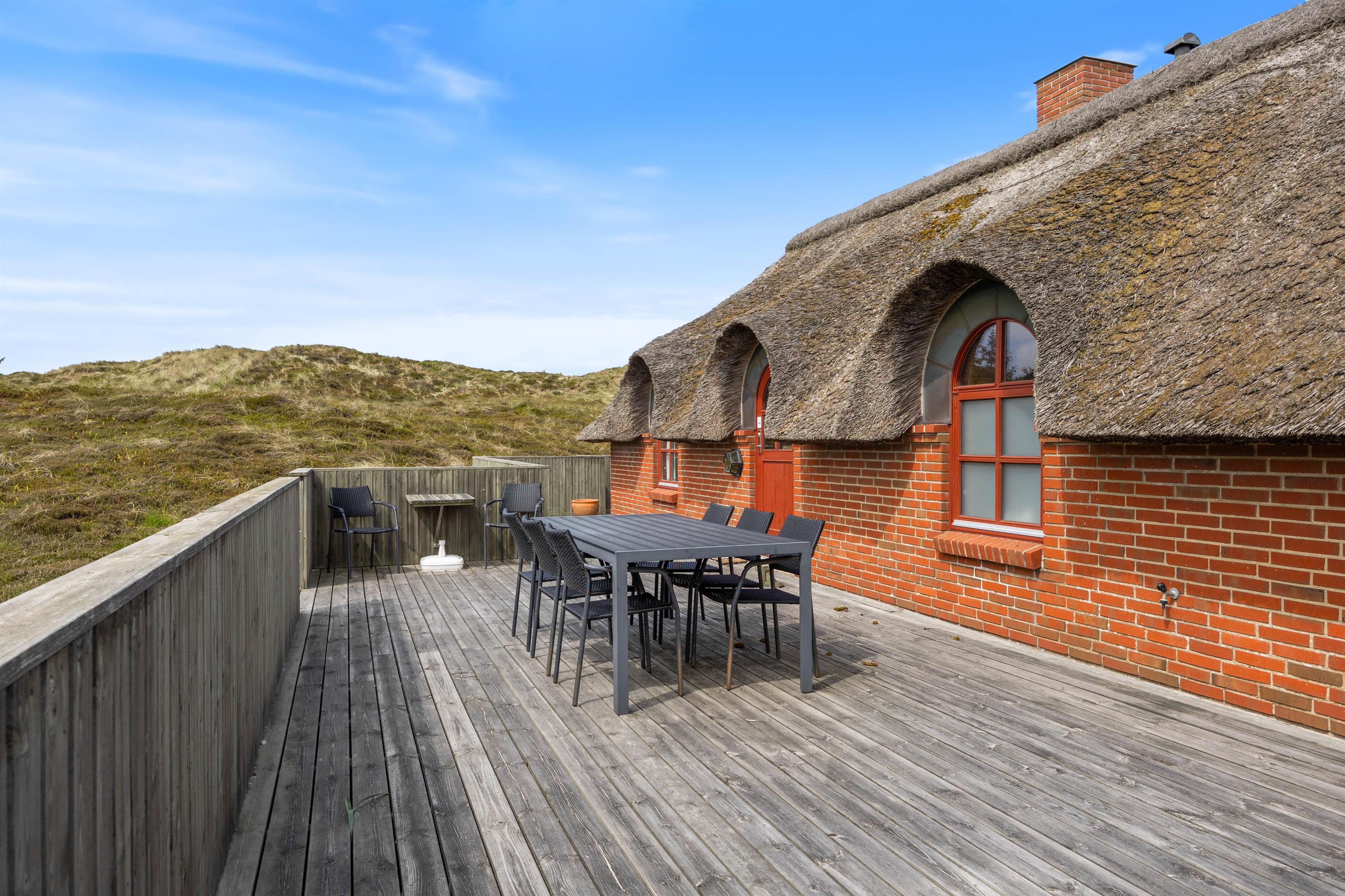 Terrassen er opdelt i to dele, som begge er åbne og afskæremede. De indbyder jer til at nyde solen og den friske Vesterhavsluft, og er ideele til rolige timer udendørs. Her begynder jeres dag med en kop kaffe og slutter med et glas vin ved solnedgang. Der er masser af plads på den rummelige naturgrund til at opleve den uspolerede følelse af vestjysk natur midt i klitlandskabet.