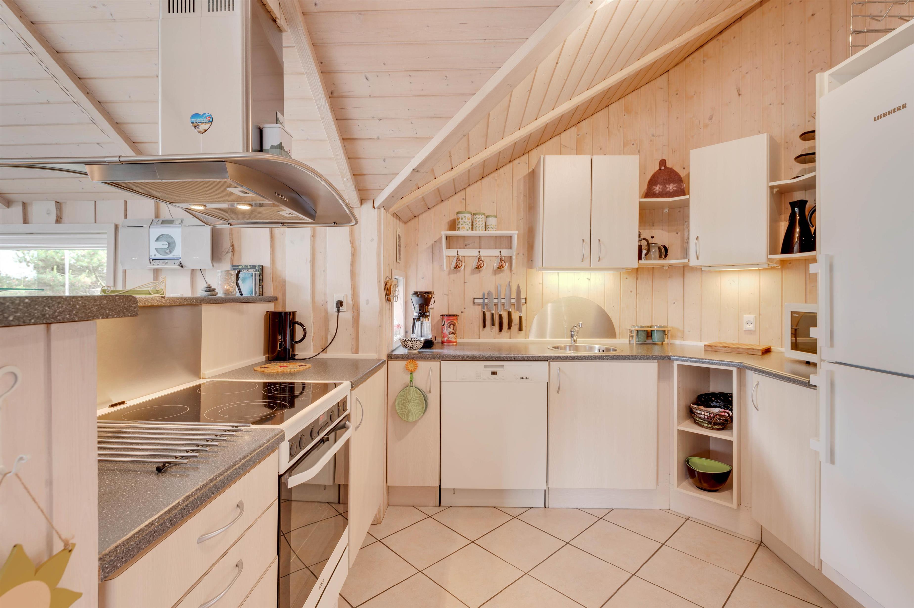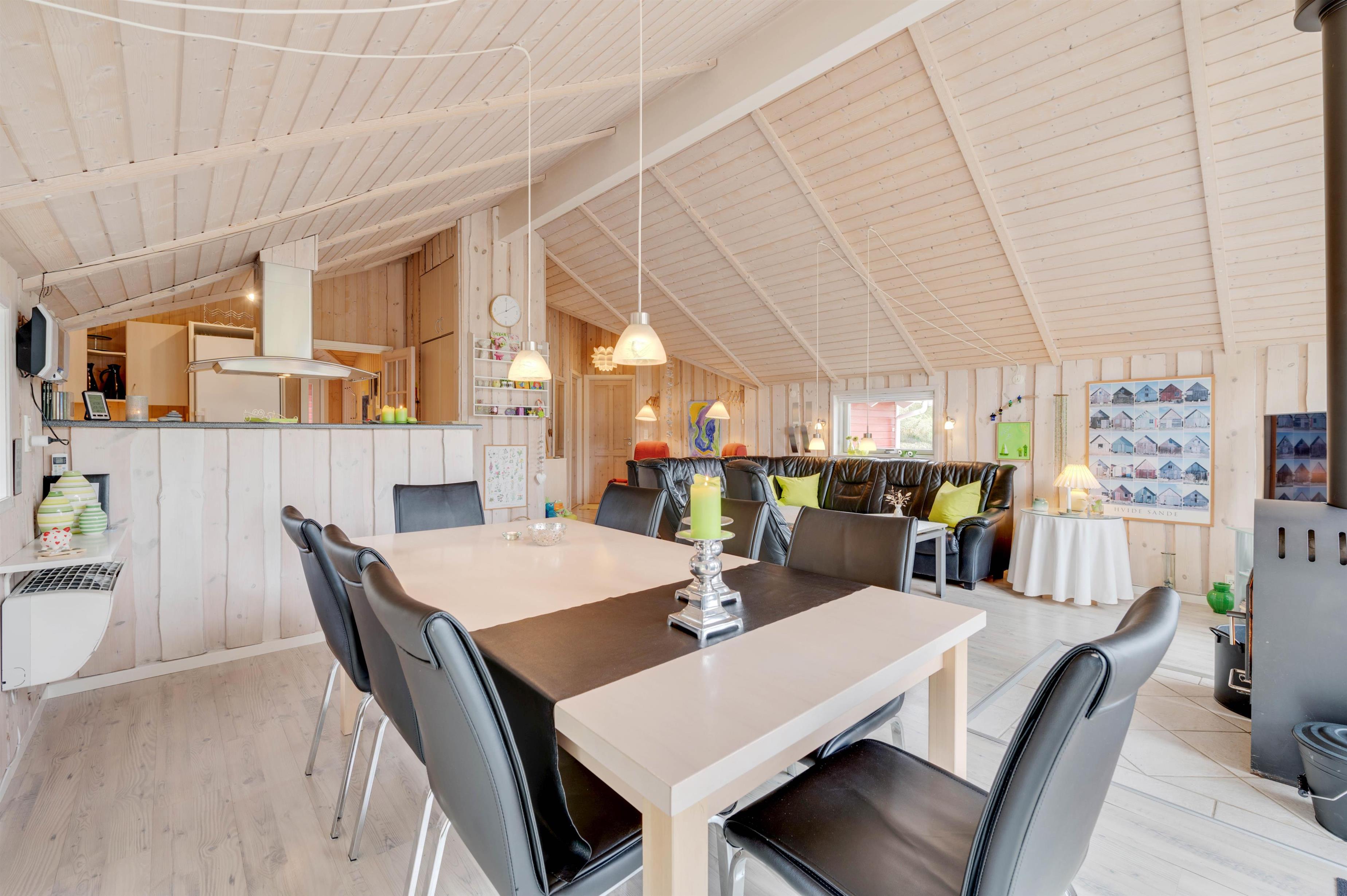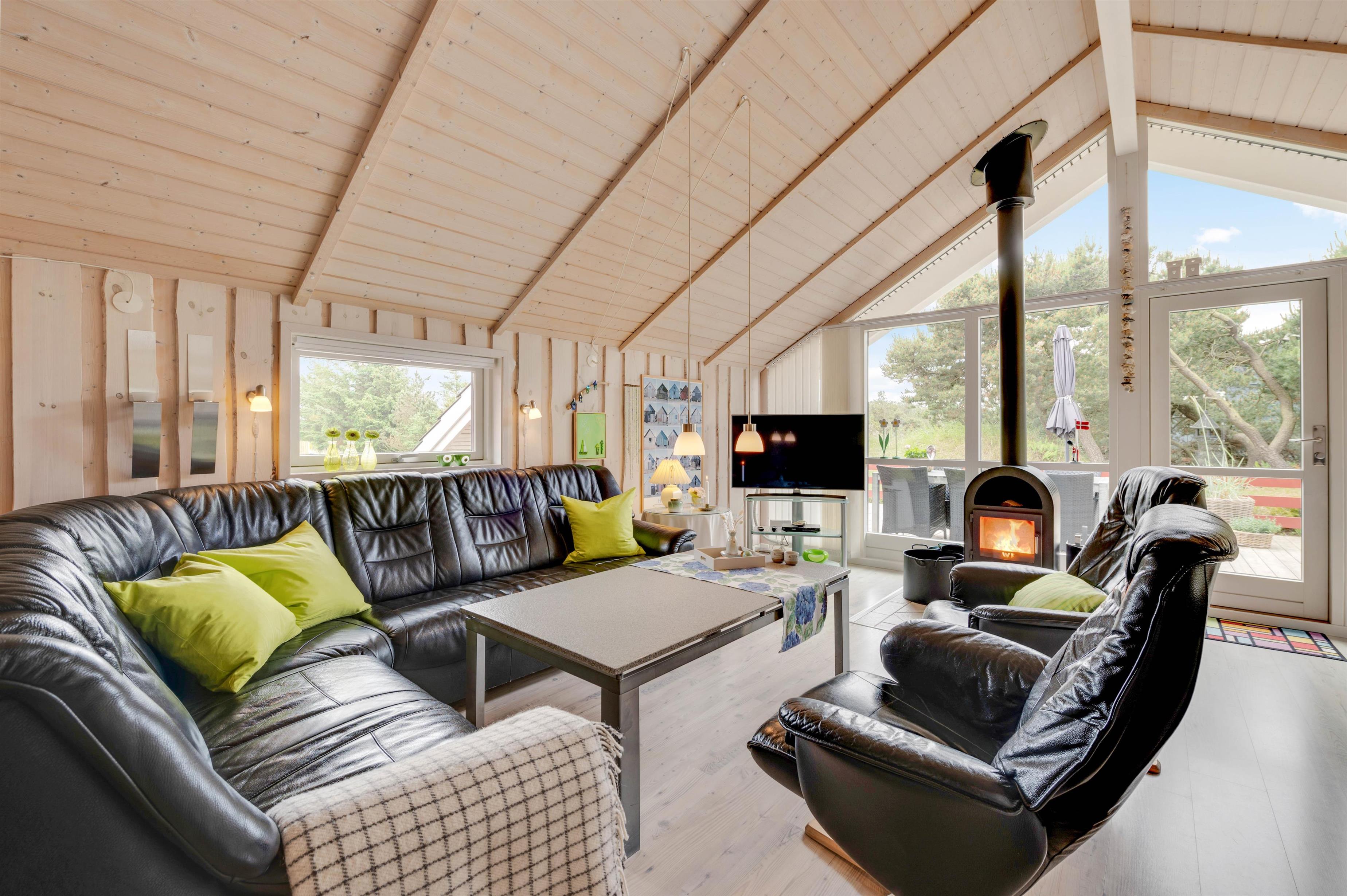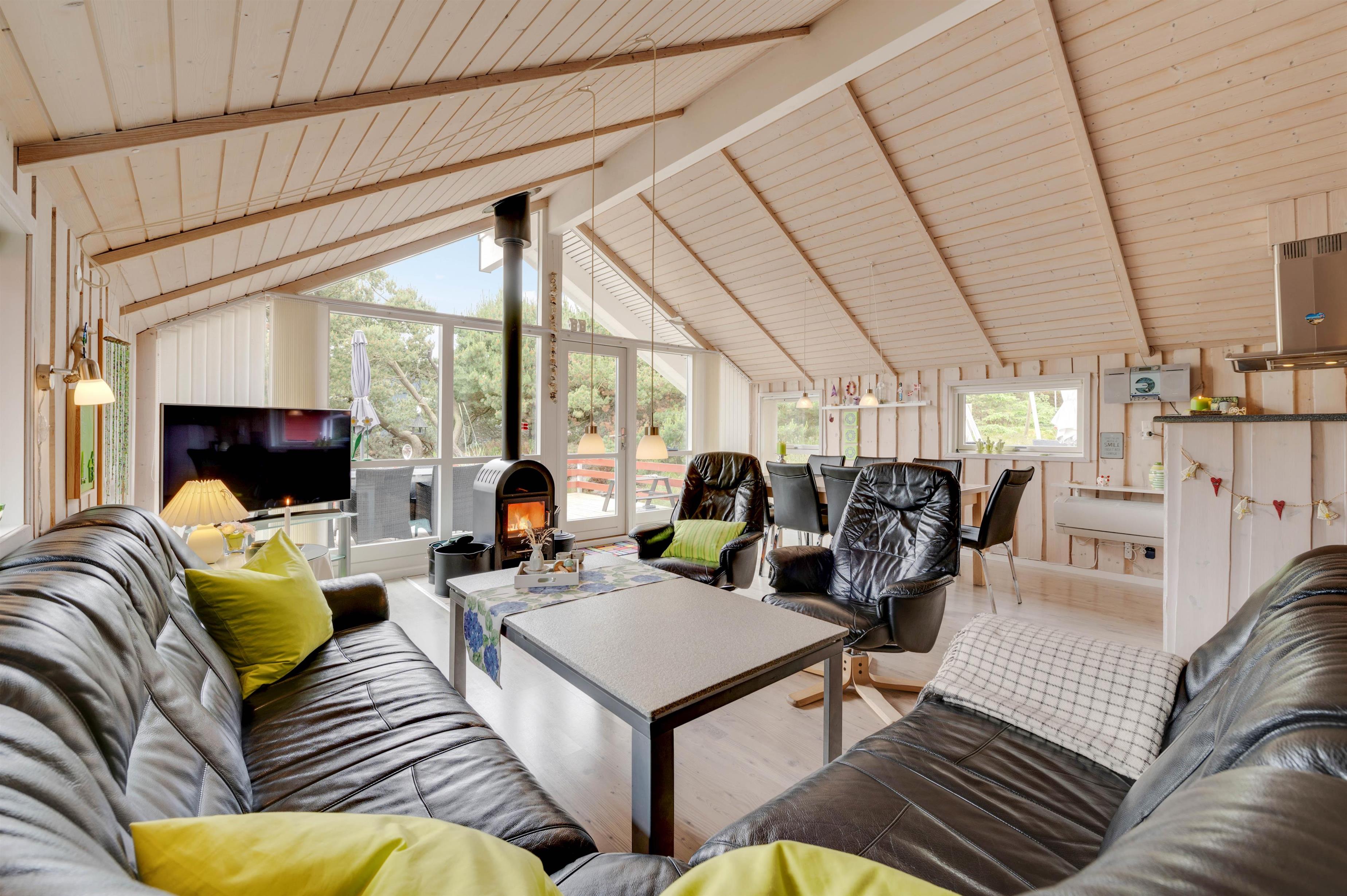 Det veludstyrede køkken ligger i åben forbindelse med den hyggelige stue. Her kan du slappe af i sofaen foran fjernsynet, mens brændeovnen varmer dig, eller hygge dig med familie og venner med et spil kort og et glas rødvin. Der er et ekstra fjernsyn med DVD i et værelse, og i sommerhuset har I også gratis trådløst internet.