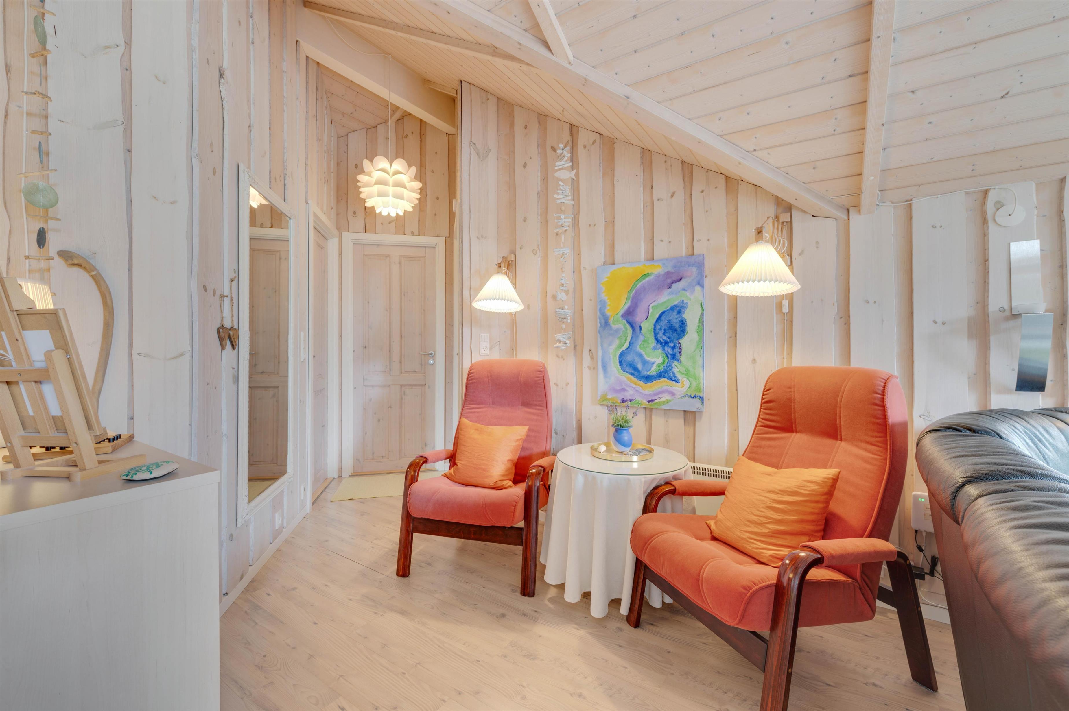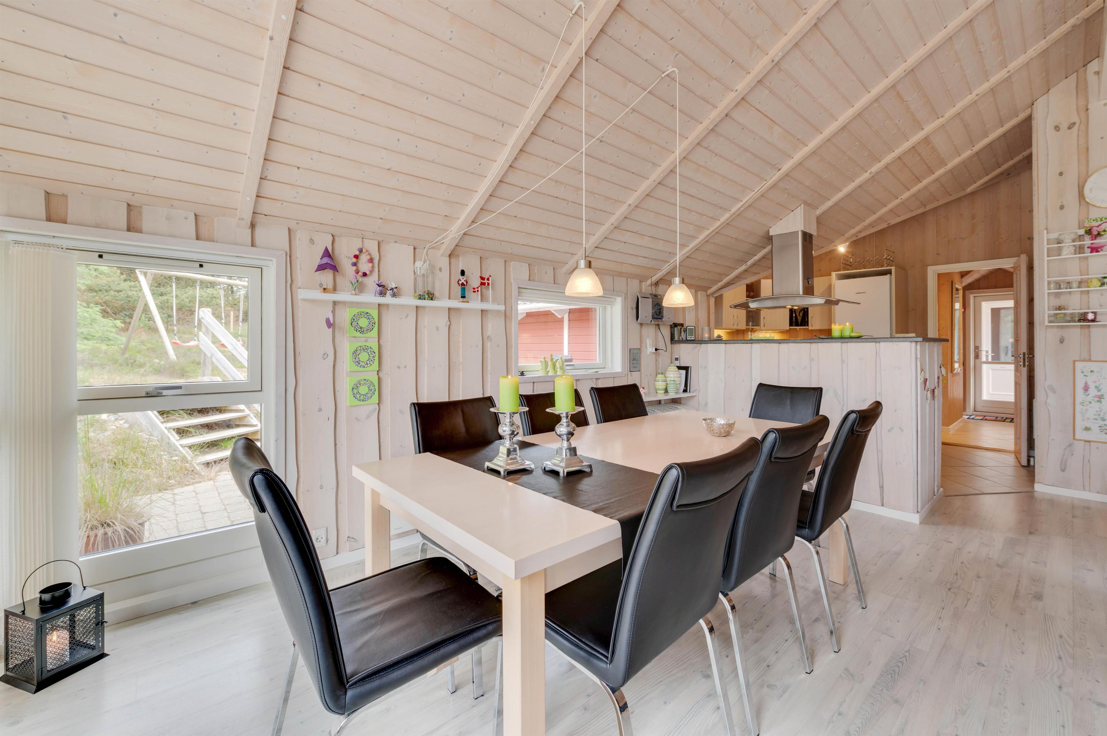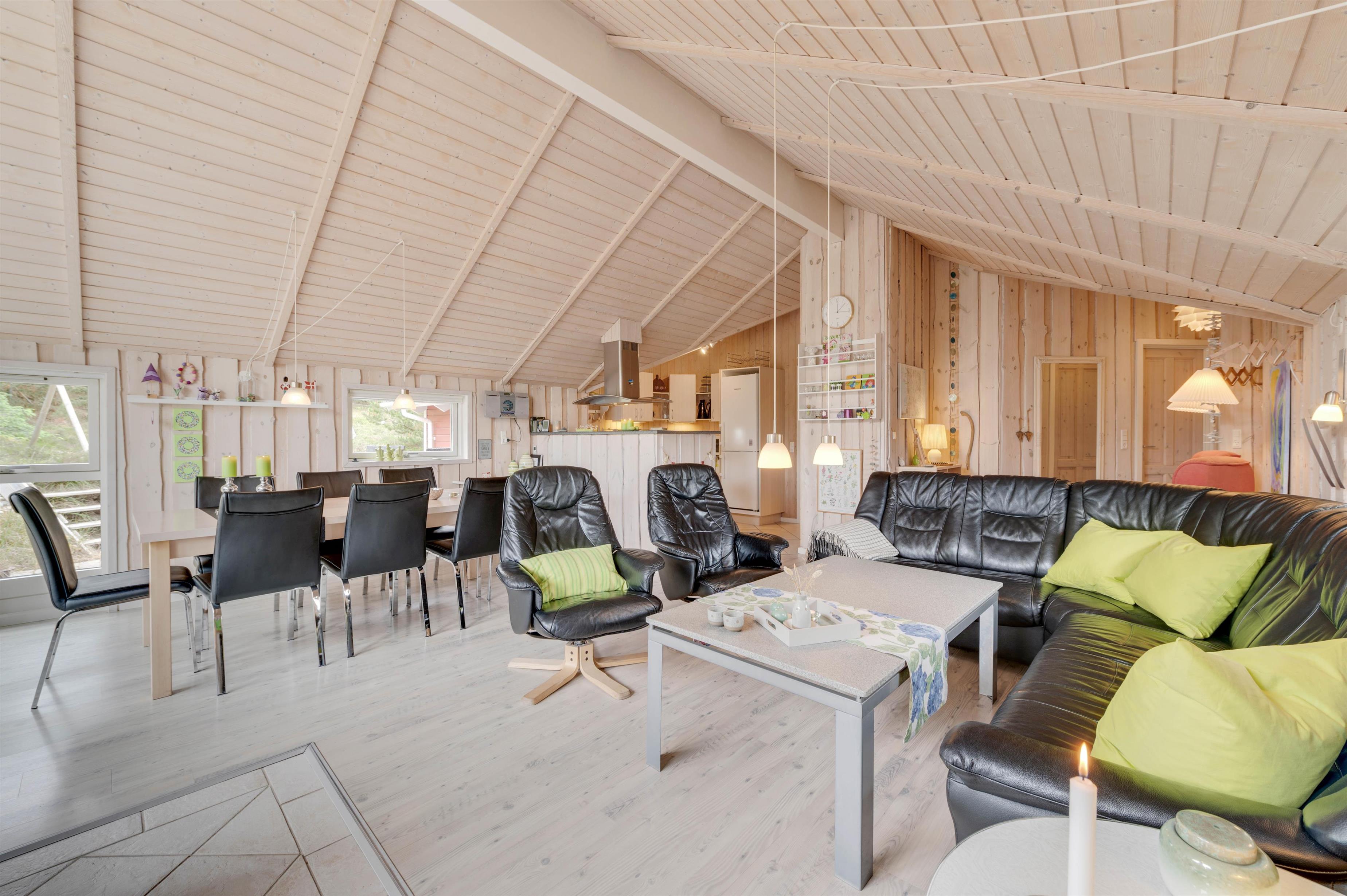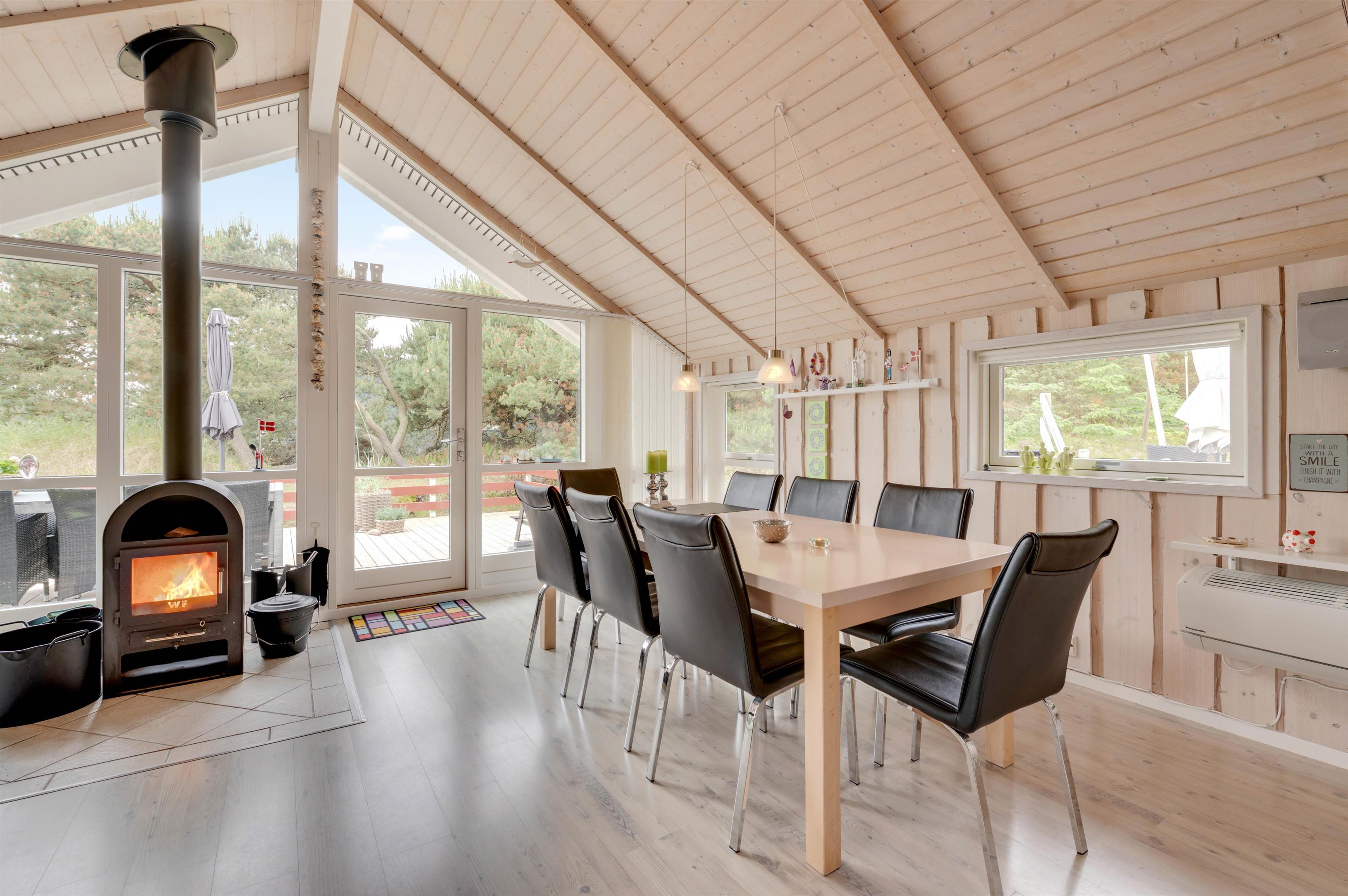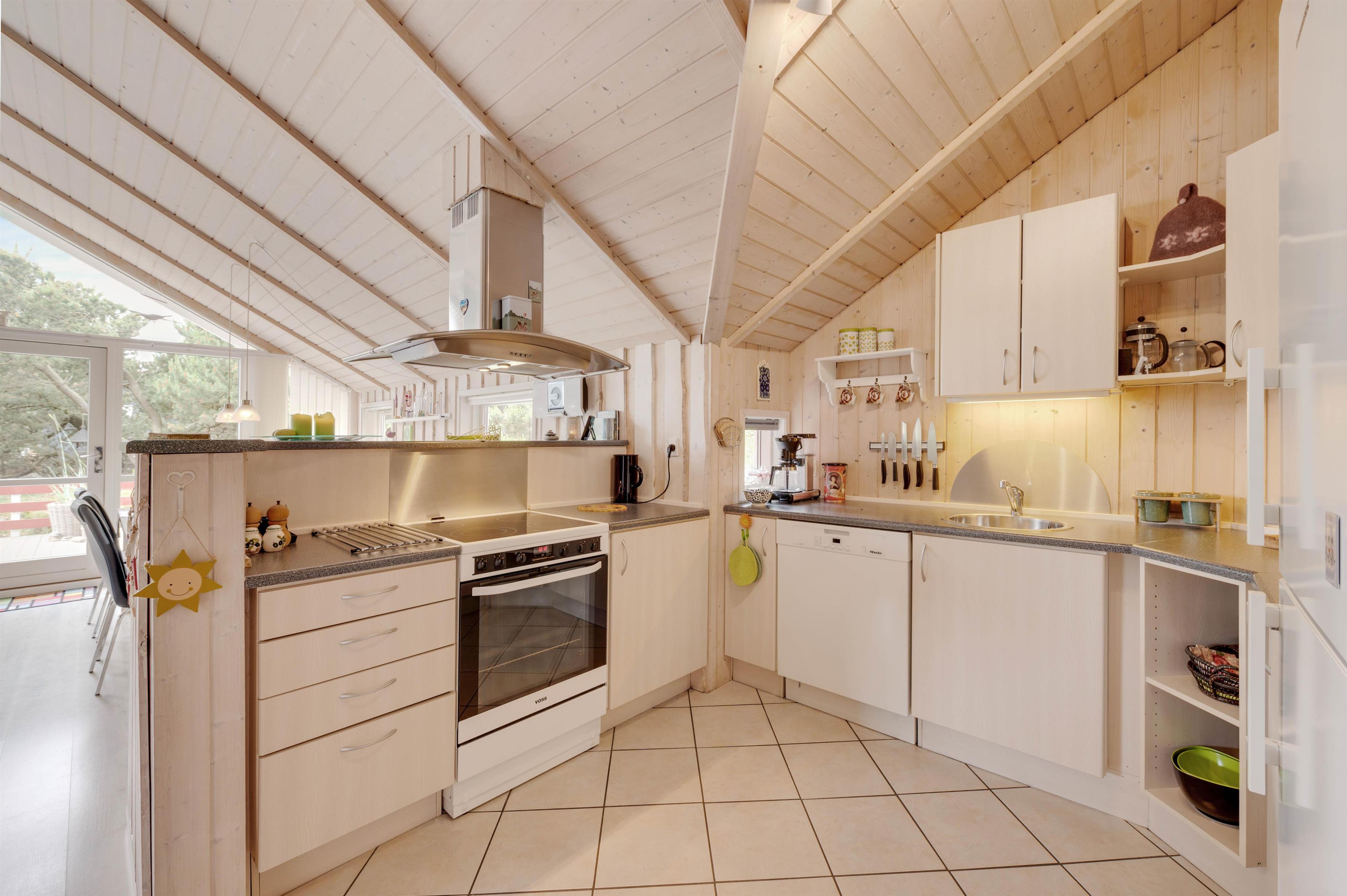 Det veludstyrede køkken ligger i åben forbindelse med den hyggelige stue. Her kan du slappe af i sofaen foran fjernsynet, mens brændeovnen varmer dig, eller hygge dig med familie og venner med et spil kort og et glas rødvin. Der er et ekstra fjernsyn med DVD i et værelse, og i sommerhuset har I også gratis trådløst internet.