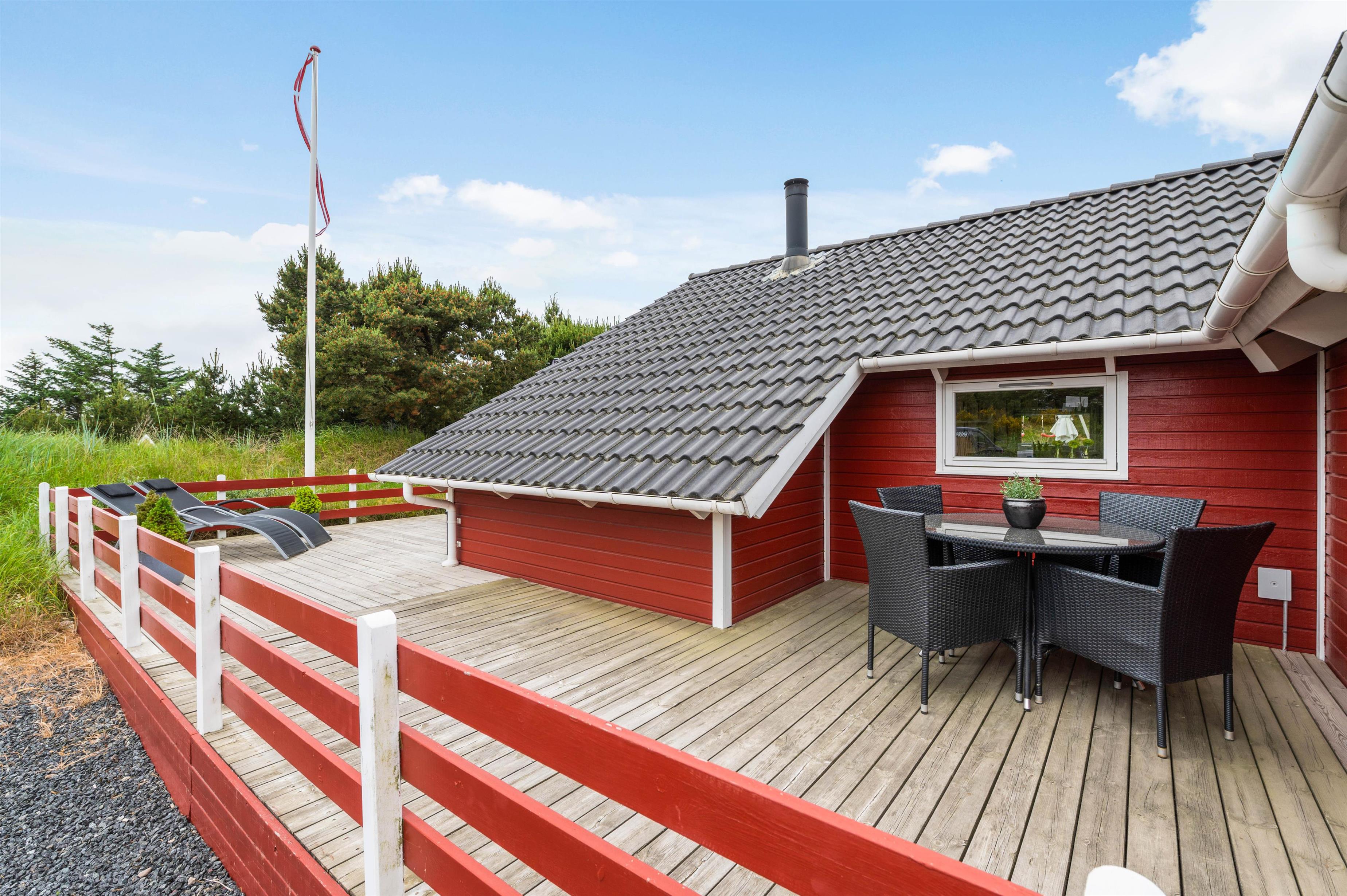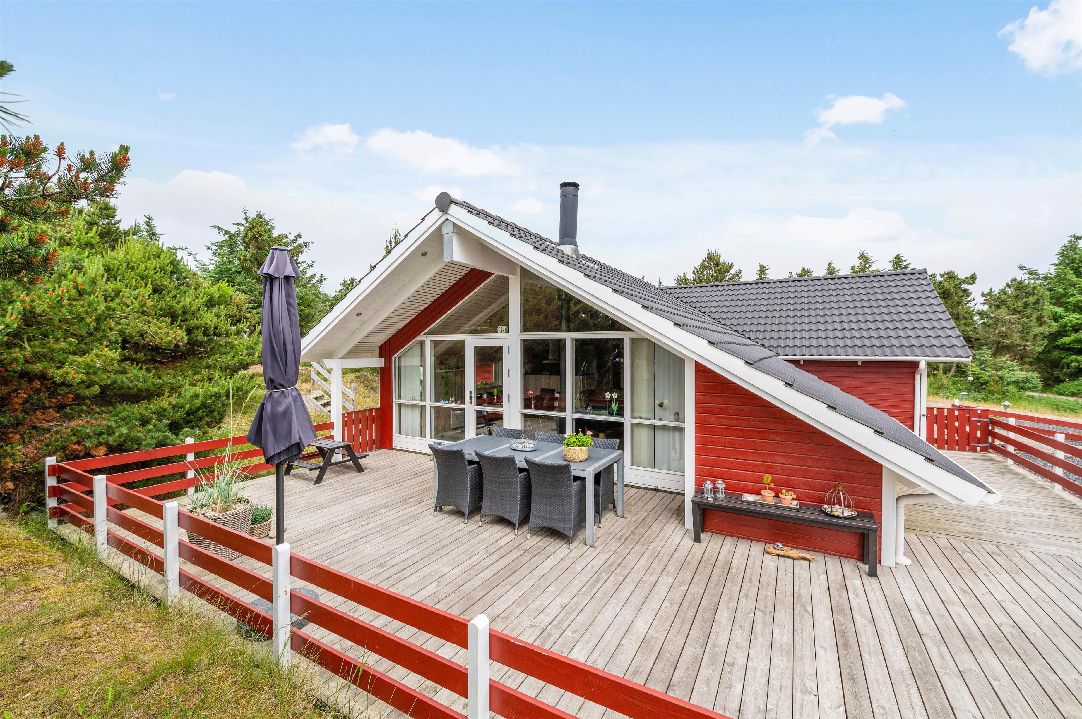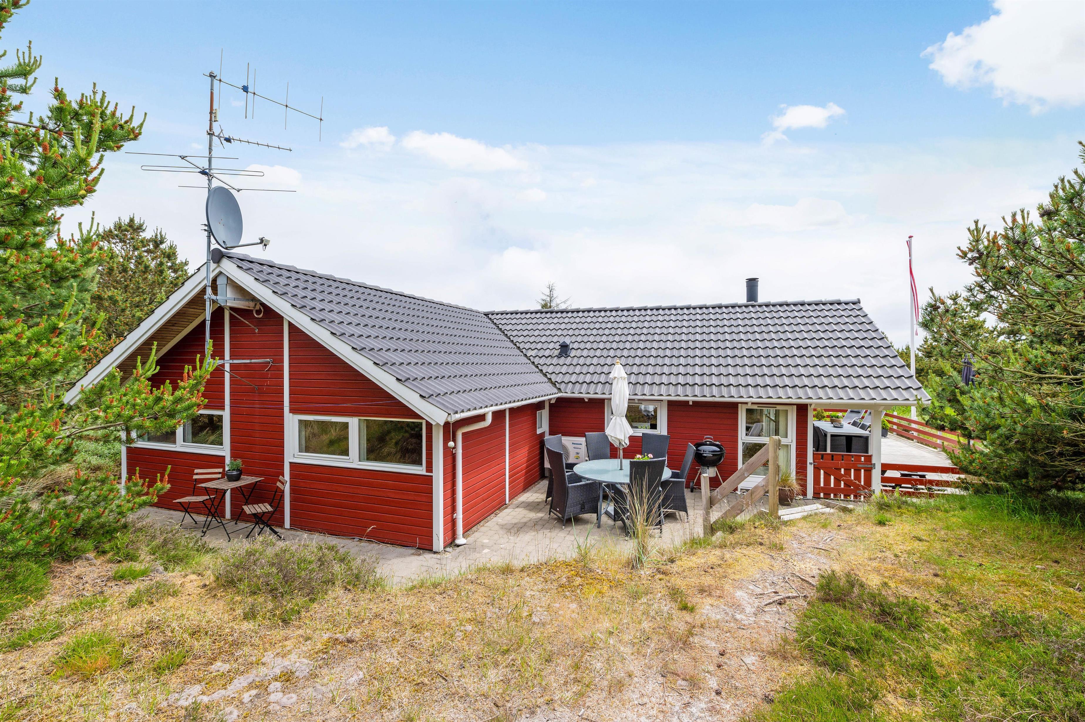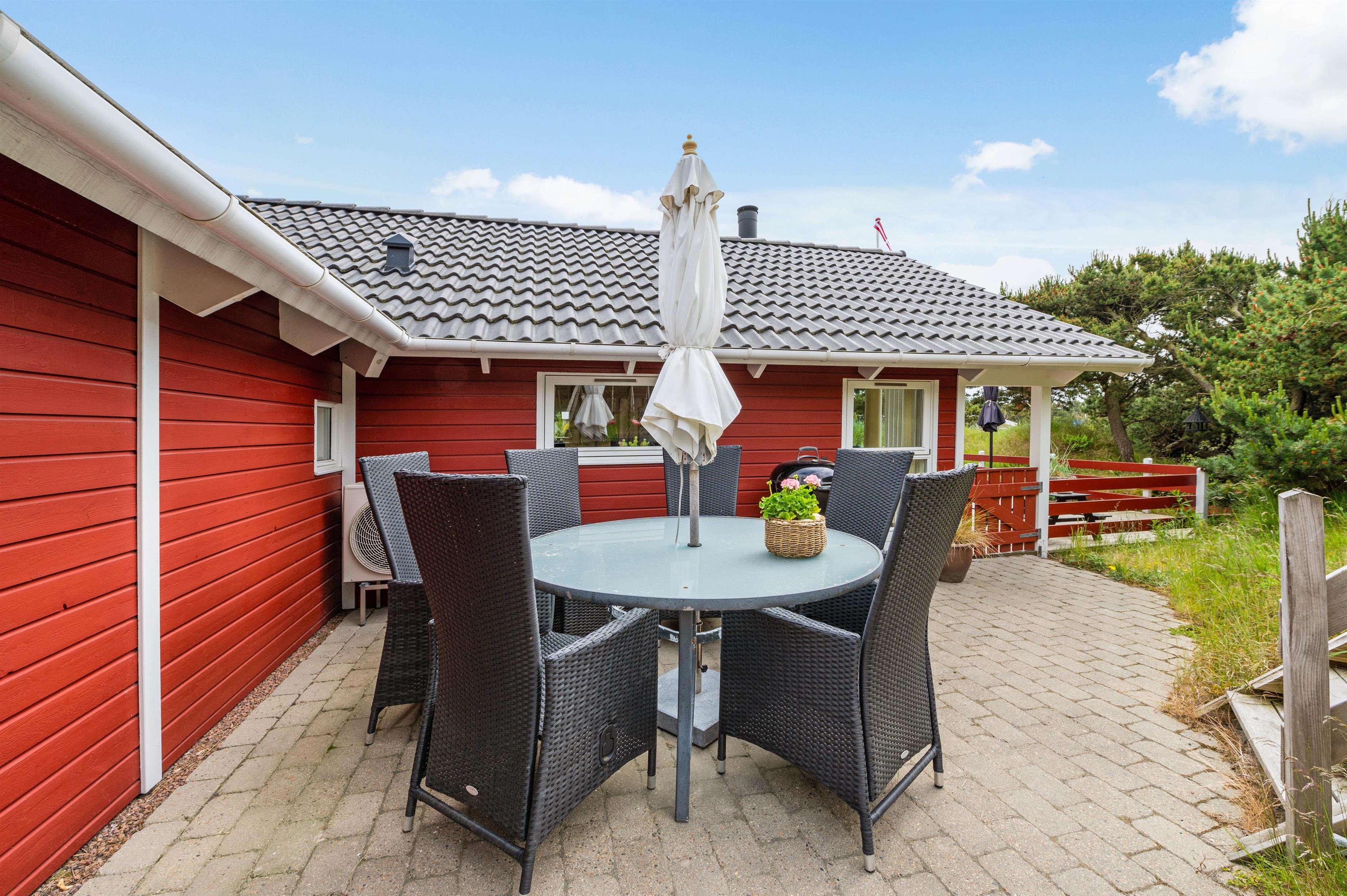 Sommerhuset ligger 700 meter fra Vesterhavet og den kilometerlange sandstrand, mens I blot har 400 meter til den lokale købmand, hvor I kan købe alt fra nybagte rundstykker til lækkert grillkød.