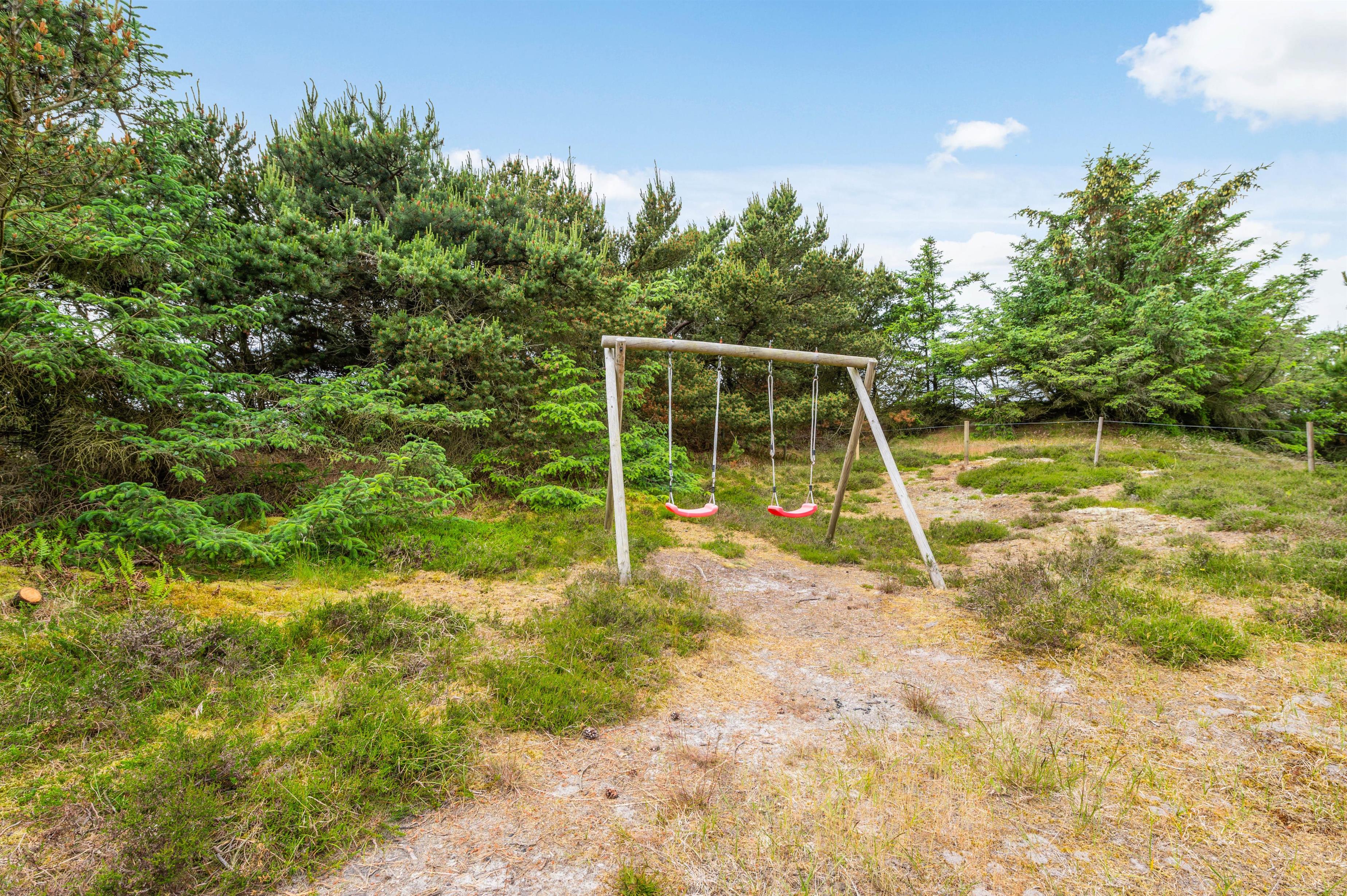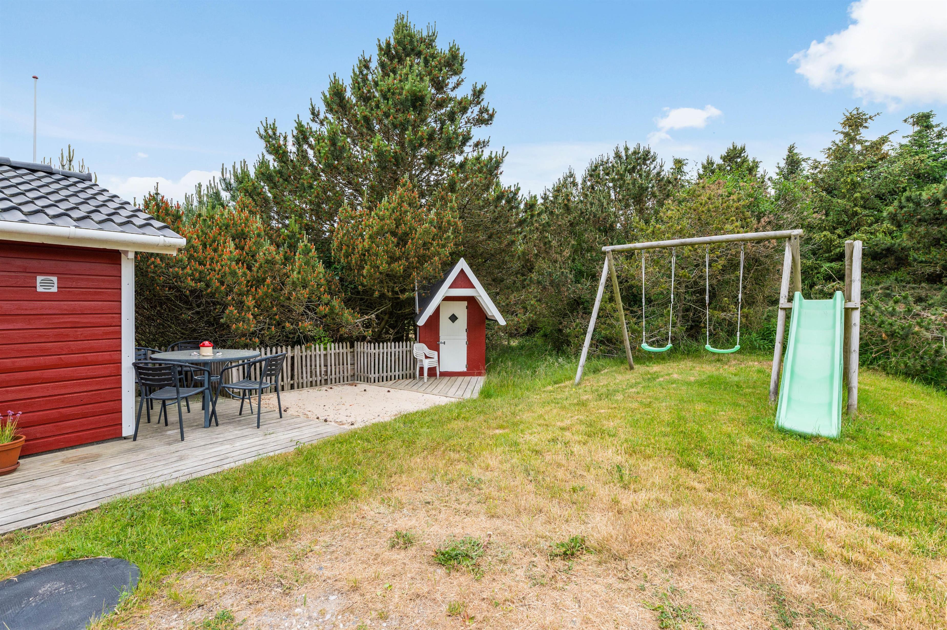 Til familiens yngste er der både gynge og en stor sandkasse, hvor de kan lege trygt, mens de voksne slapper af.