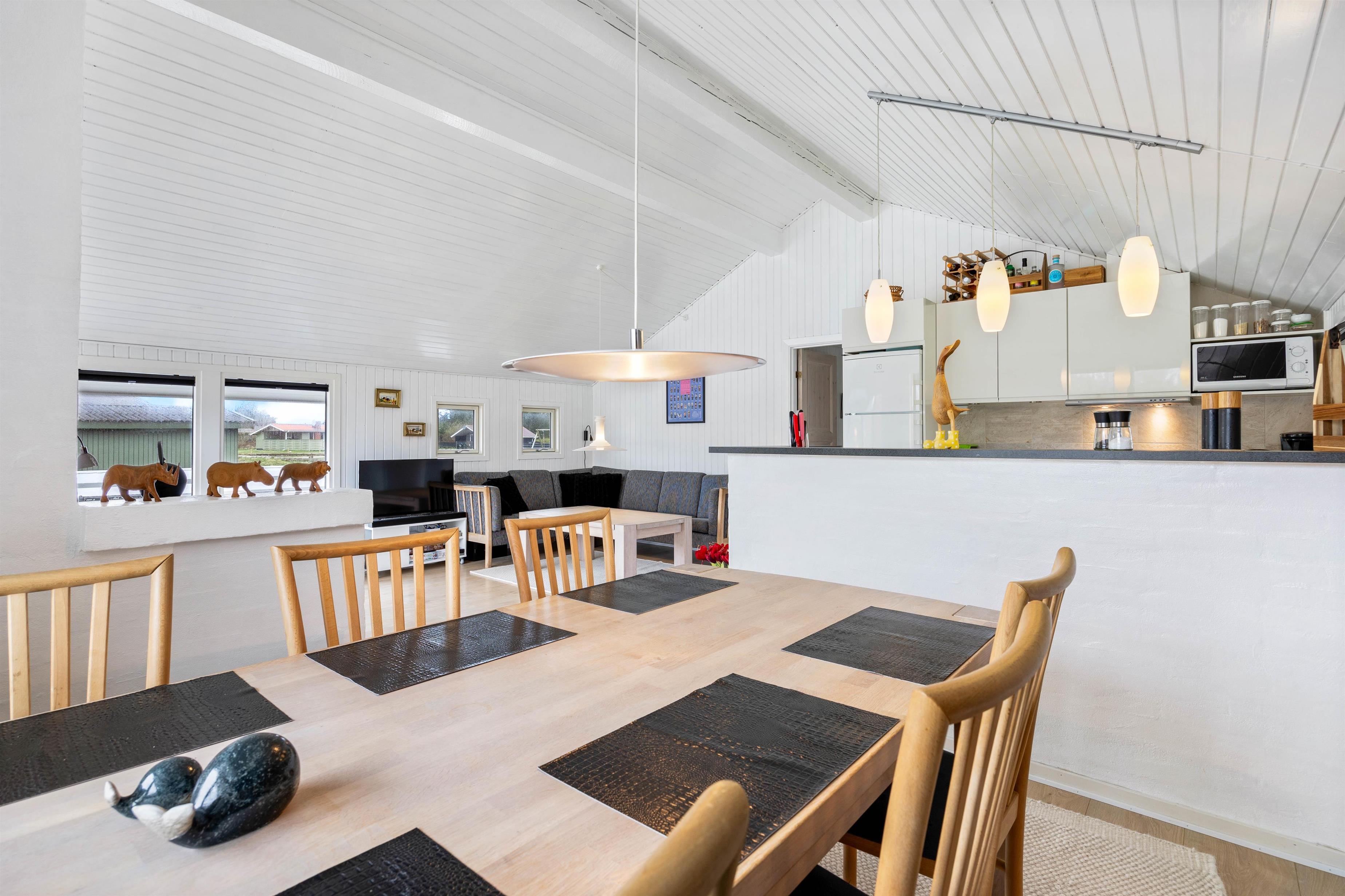 Sommerhuset fremstår lyst og indbydende, og der er trælofter til kip i stue og køkken. Køkkenet er godt indrettet med bl.a. opvaskemaskine, mikroovn og en fryser på 50 L. Stuen ligger i forbindelse med køkkenet, det er velmøbleret og med trælaminat på gulvene. Desuden er der en hyggelig alkove, brændeovn, en fladskærm, DVD og gratis fibernet.