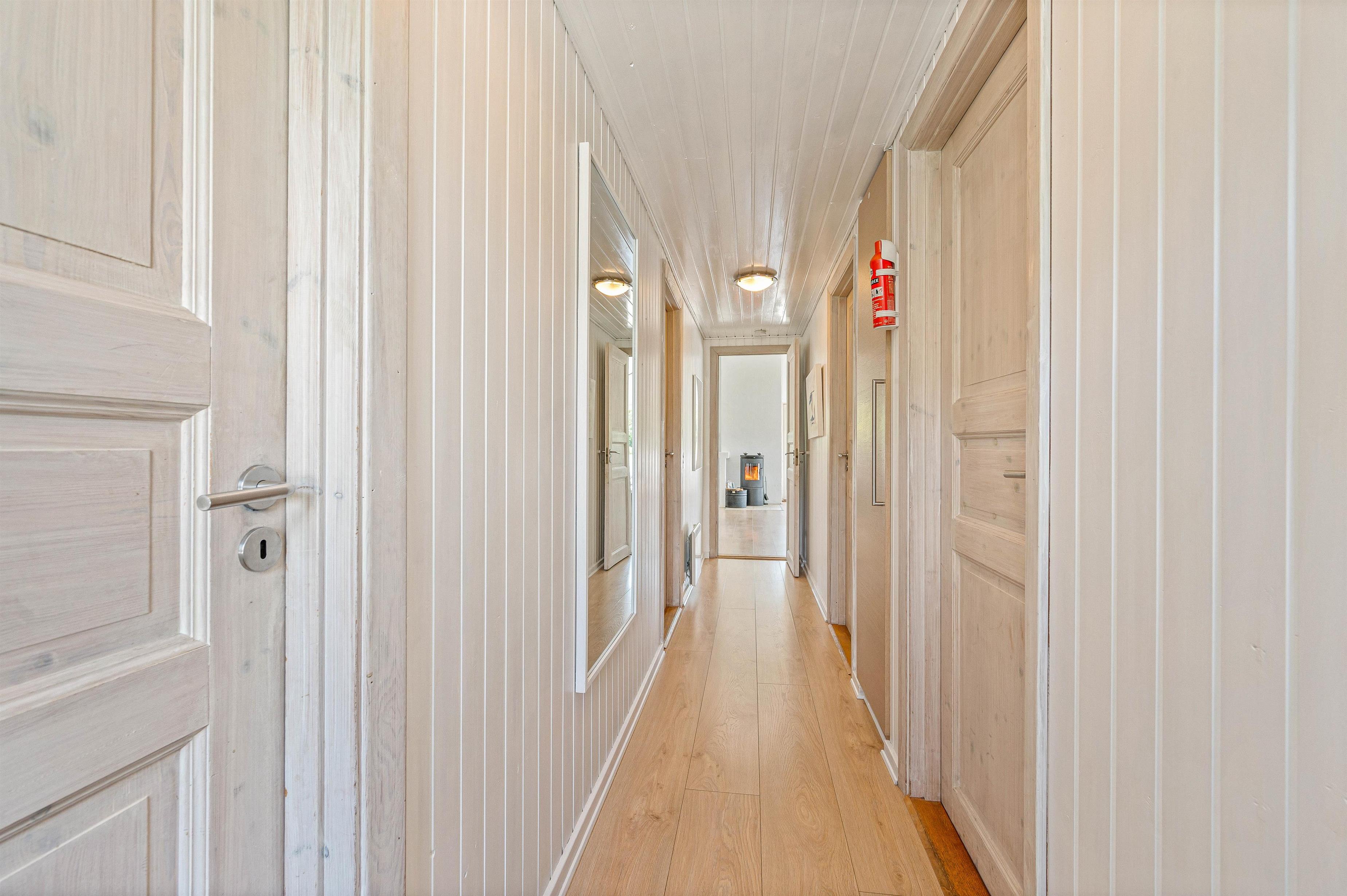 Der er 3 soveværelser, hvoraf de 2 værelser har dobbeltseng og det sidste 2 enkeltsenge. I badeværelset er der gulvvarme, bruseniche, hjørnespa og indgang til sauna. Derudover er der vaskemaskine i sommerhuset, så I kan vaske lidt tøj, hvis det skulle blive en nødvendighed.
