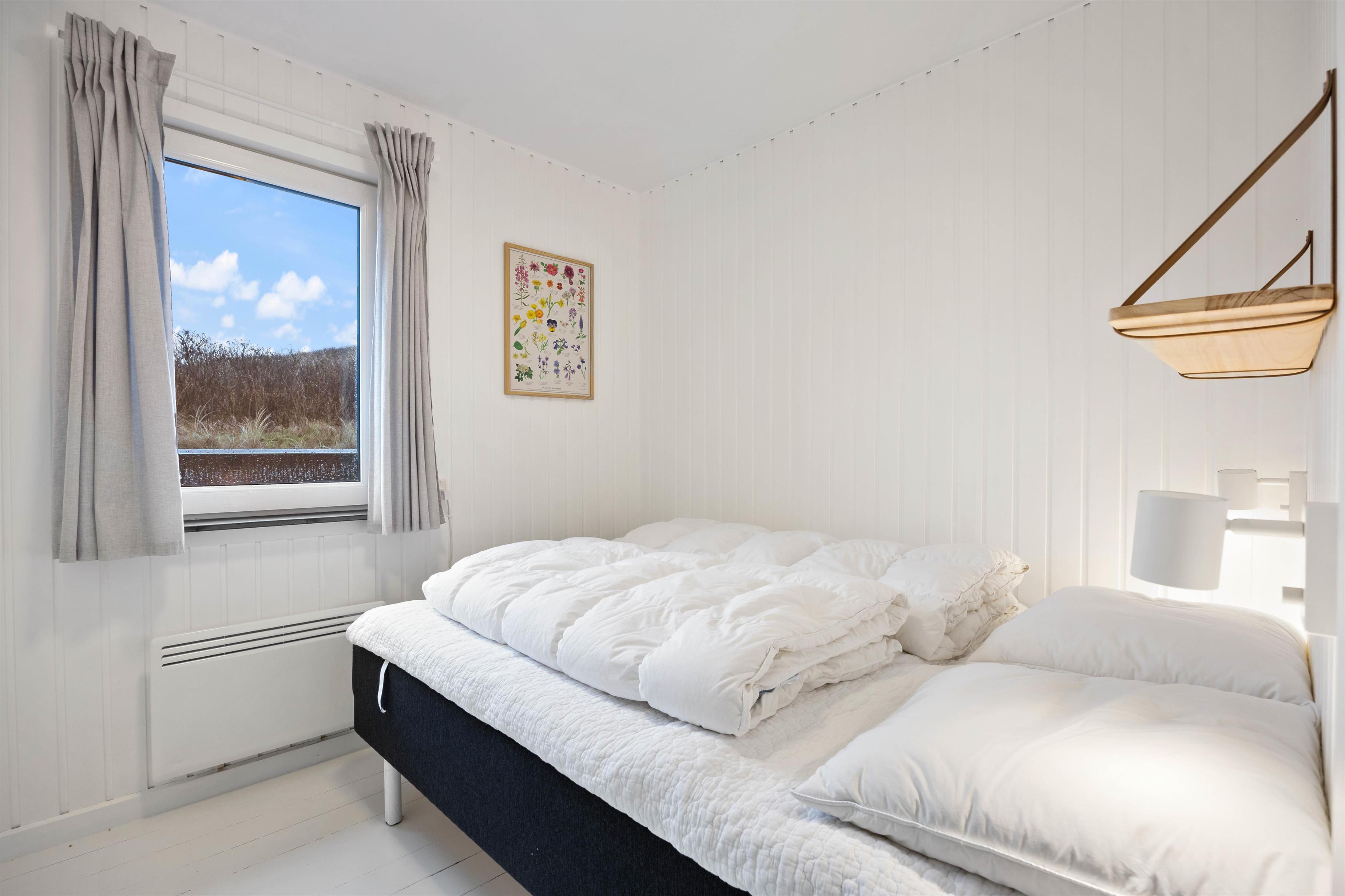 Dette skønne sommerhus på Julianevej er blevet gennemgribende renoveret i 2023, og fremstår indbydende og lækkert. Der er 4 soveværelser i sommerhuset. Et værelse med dobbeltseng, to værelser med en ¾ seng og et værelse med 2 enkeltsenge. Alle værelser har trægulve og hvidmalede vægge.