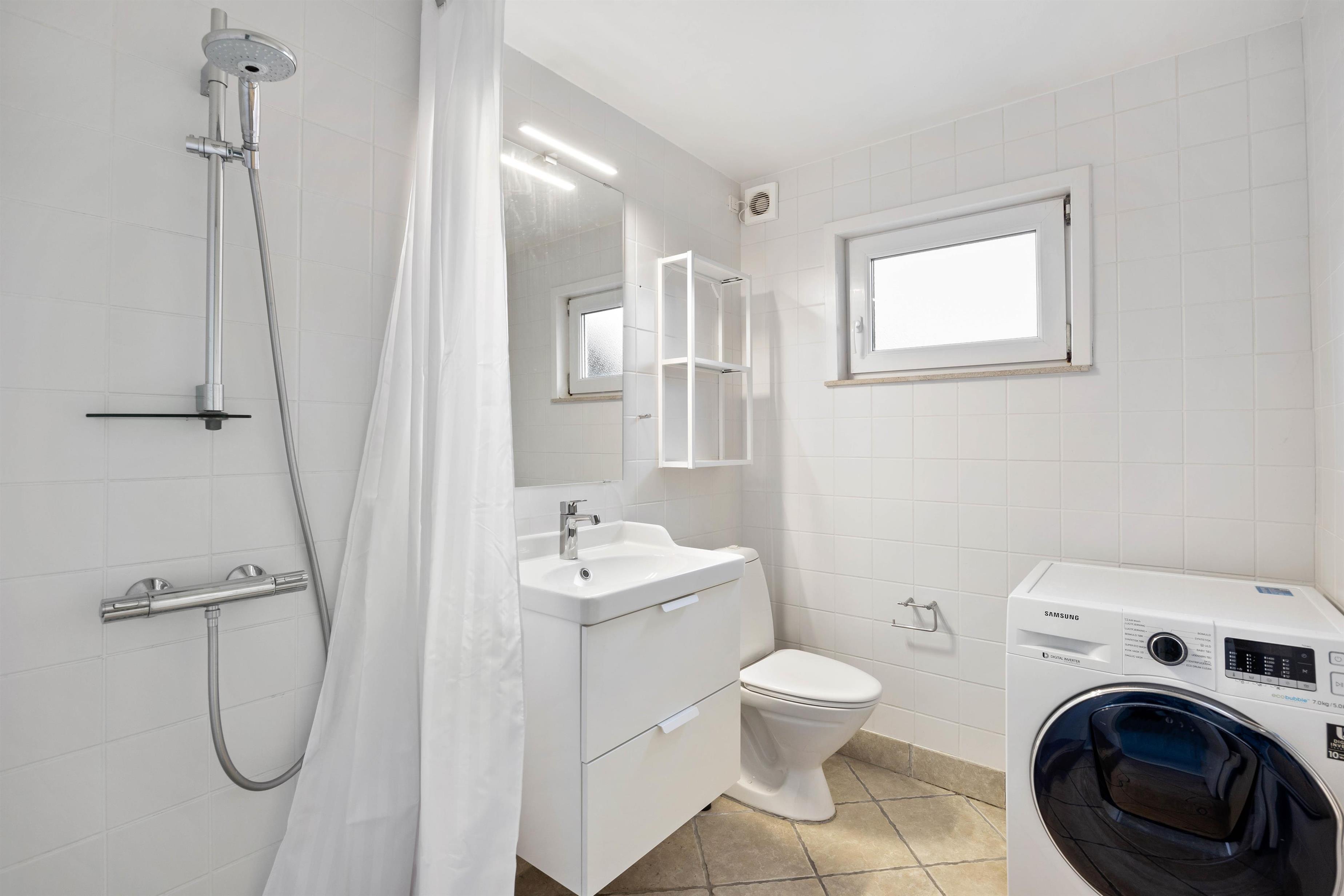 Der er 2 badeværelser i sommerhuset, begge med bruseniche og gulvvarme. I det ene badeværelse er der en skøn sauna, og på terrassen en udendørsbruser, som er perfekt til afkøling efter en tur i saunavarmen. Denne kan benyttes fra april til november.
