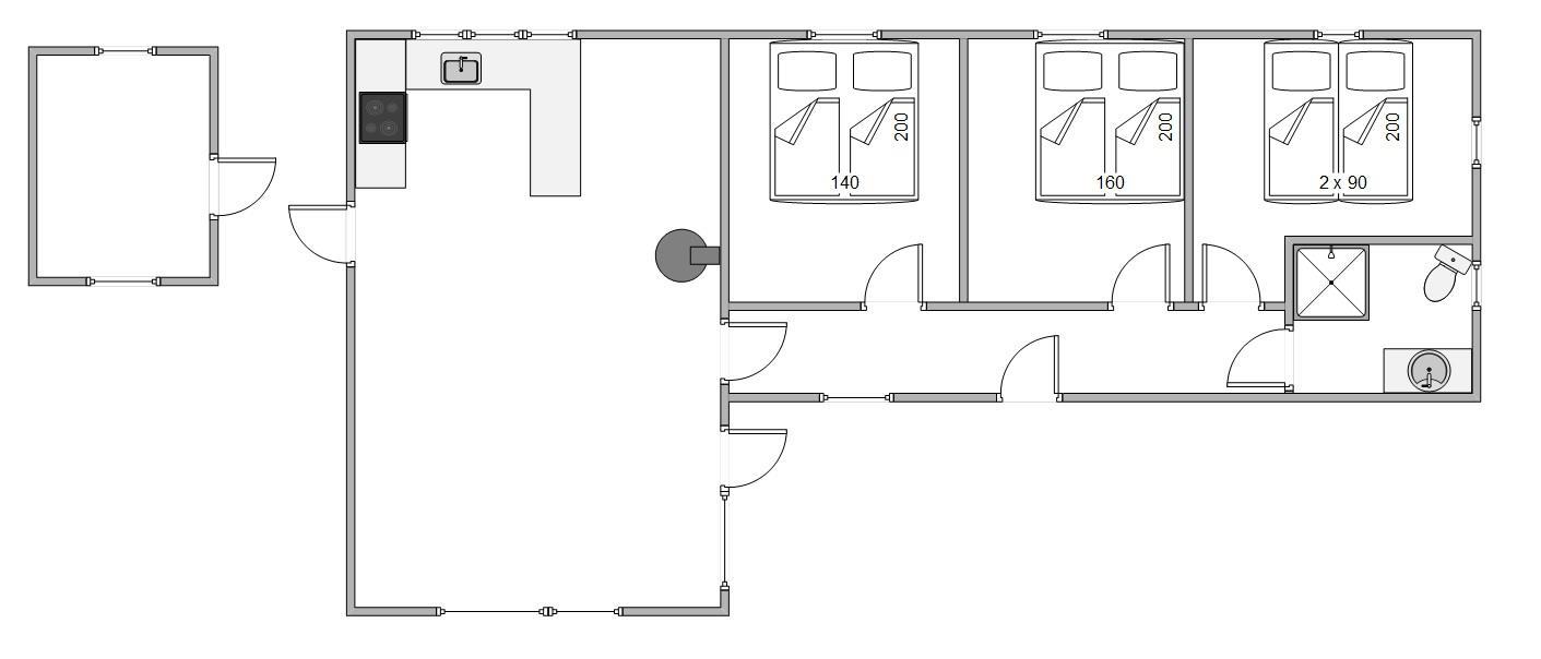 Når mørket falder på, og sengen kalder, kan I fordele jer på de 3 værelser. Her er der 2 med dobbeltseng, mens det sidste værelse er indrettet med 2 enkeltsenge.