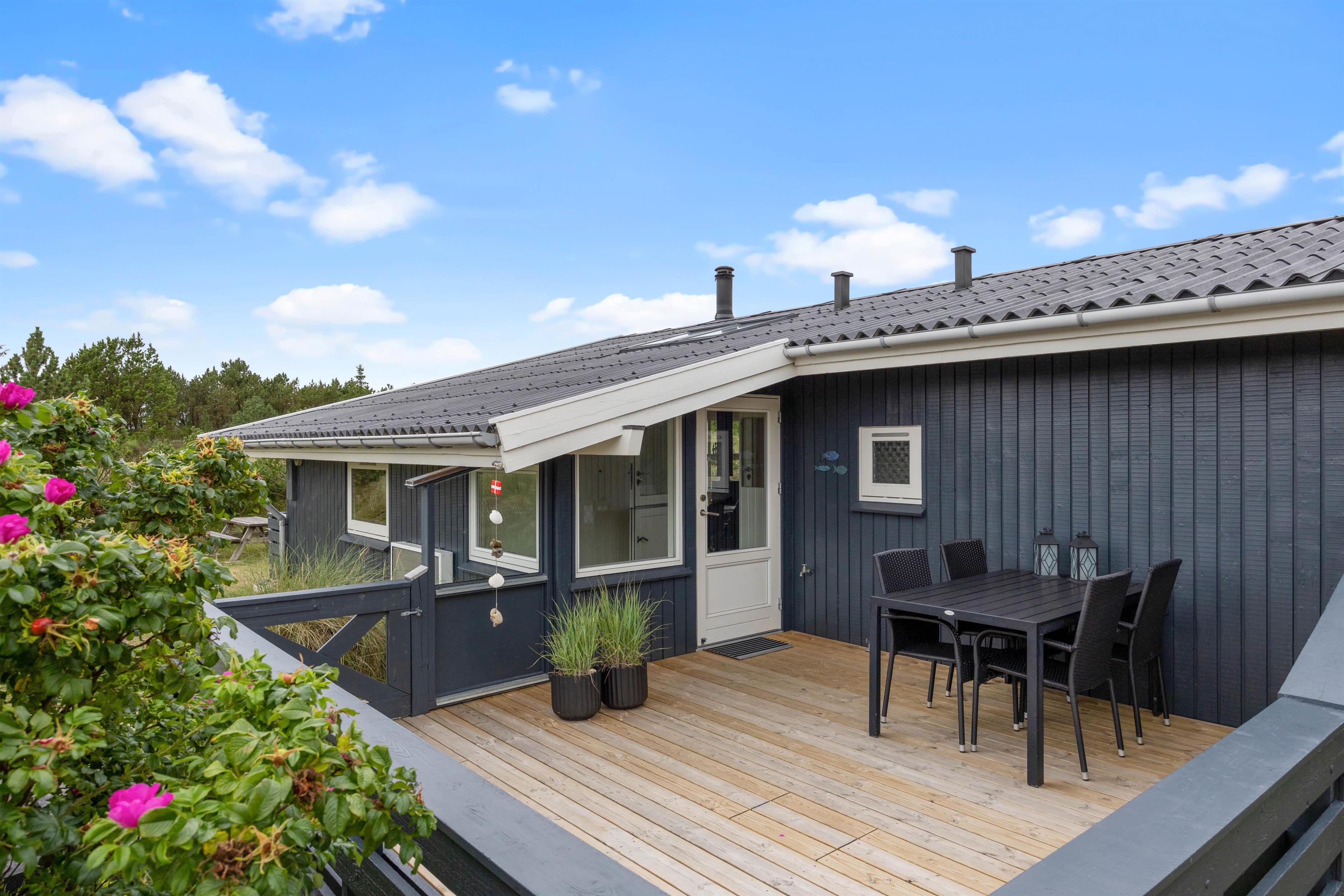 På Bjerregårdsvej 27 står dette lyse og hyggelige feriehus og venter på jer. Her kan I tilbringe en dejlig og afslappende ferie med familien. Indretningen er skønt afstemt, så I kan føle jer hjemme fra første ferieøjeblik, og det veludstyrede hus rummer alt, hvad ferien har brug for. På den store naturgrund og de to dejlige terrasser kan I nyde solen dagen lang.