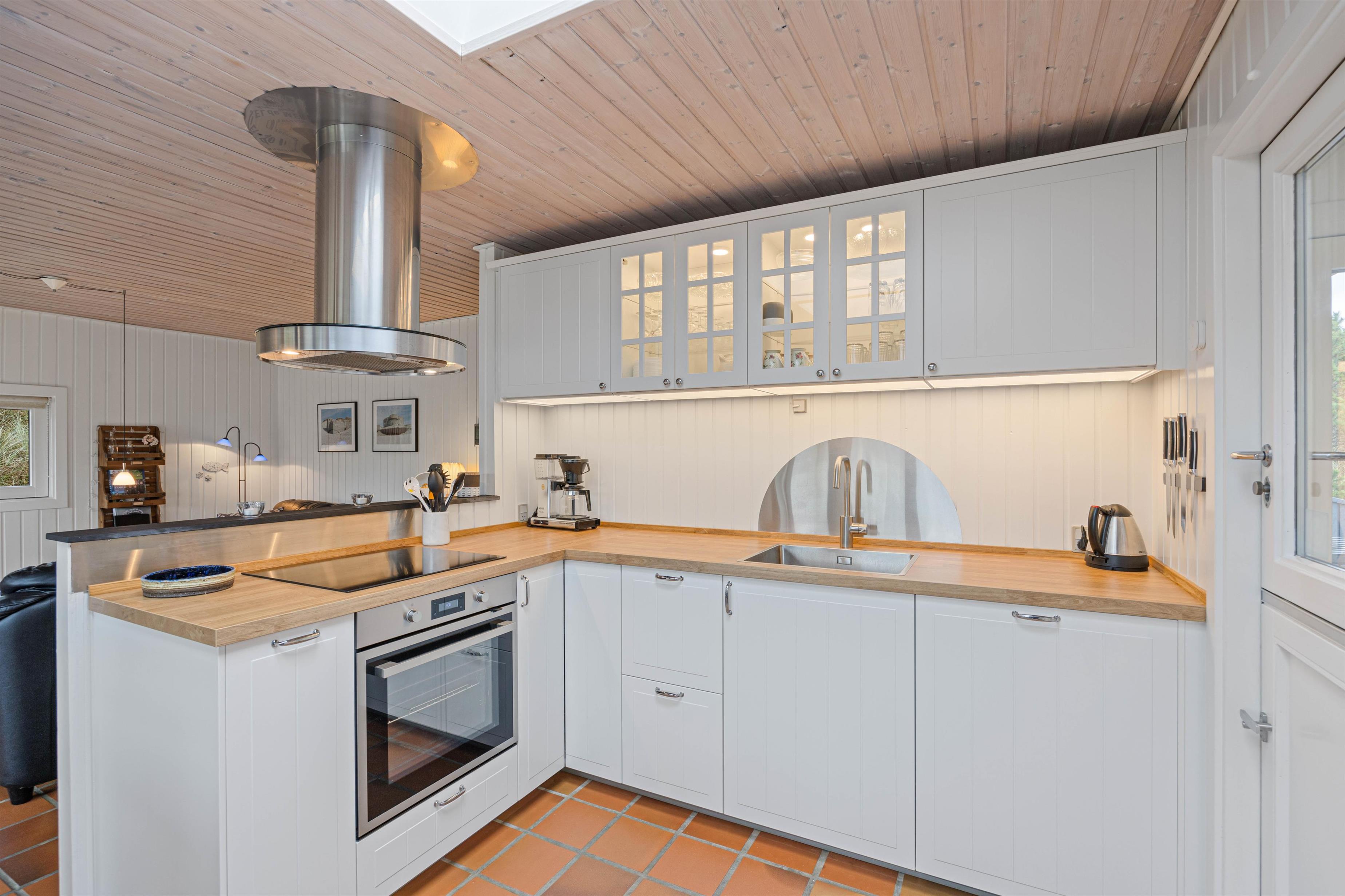 De mange vinduer lader masser af sollys slippe ind og giver jer samtidig en flot udsigt ud over naturgrunden. Det åbne køkken- og stueområde er feriehusets hjerte, og her er der lagt op til mange hyggelige feriestunder med fælles madlavning og samvær.