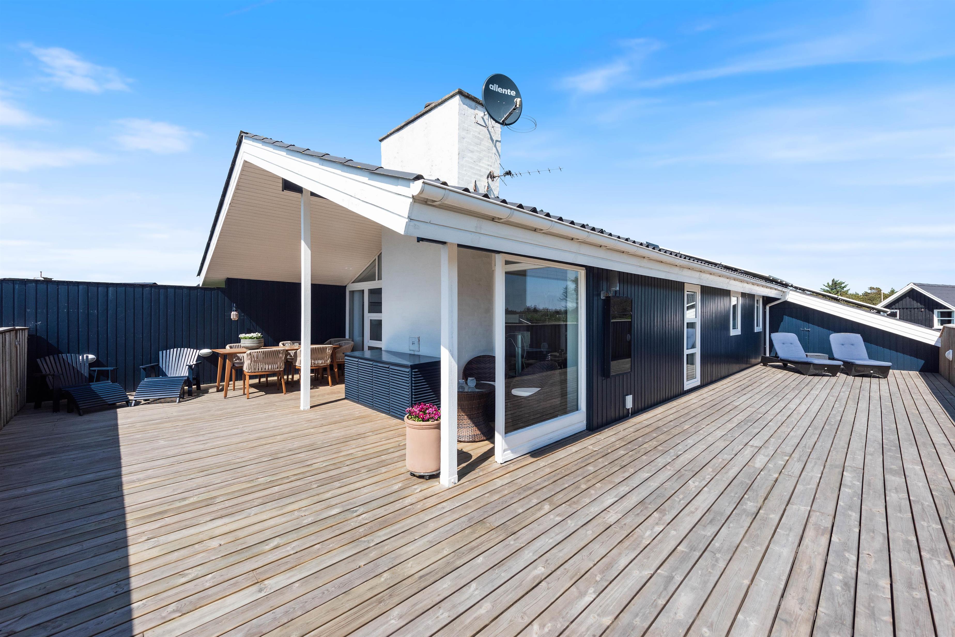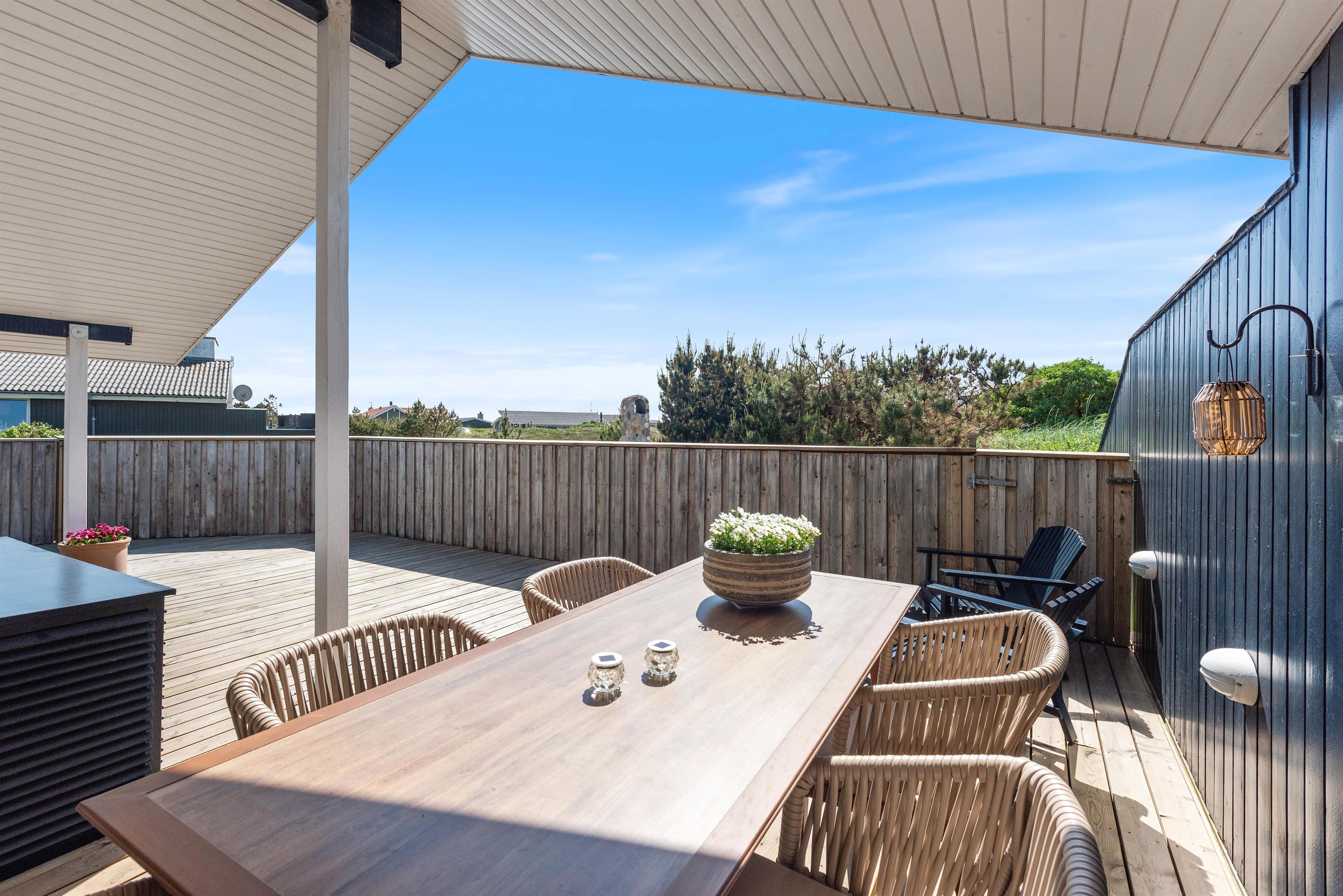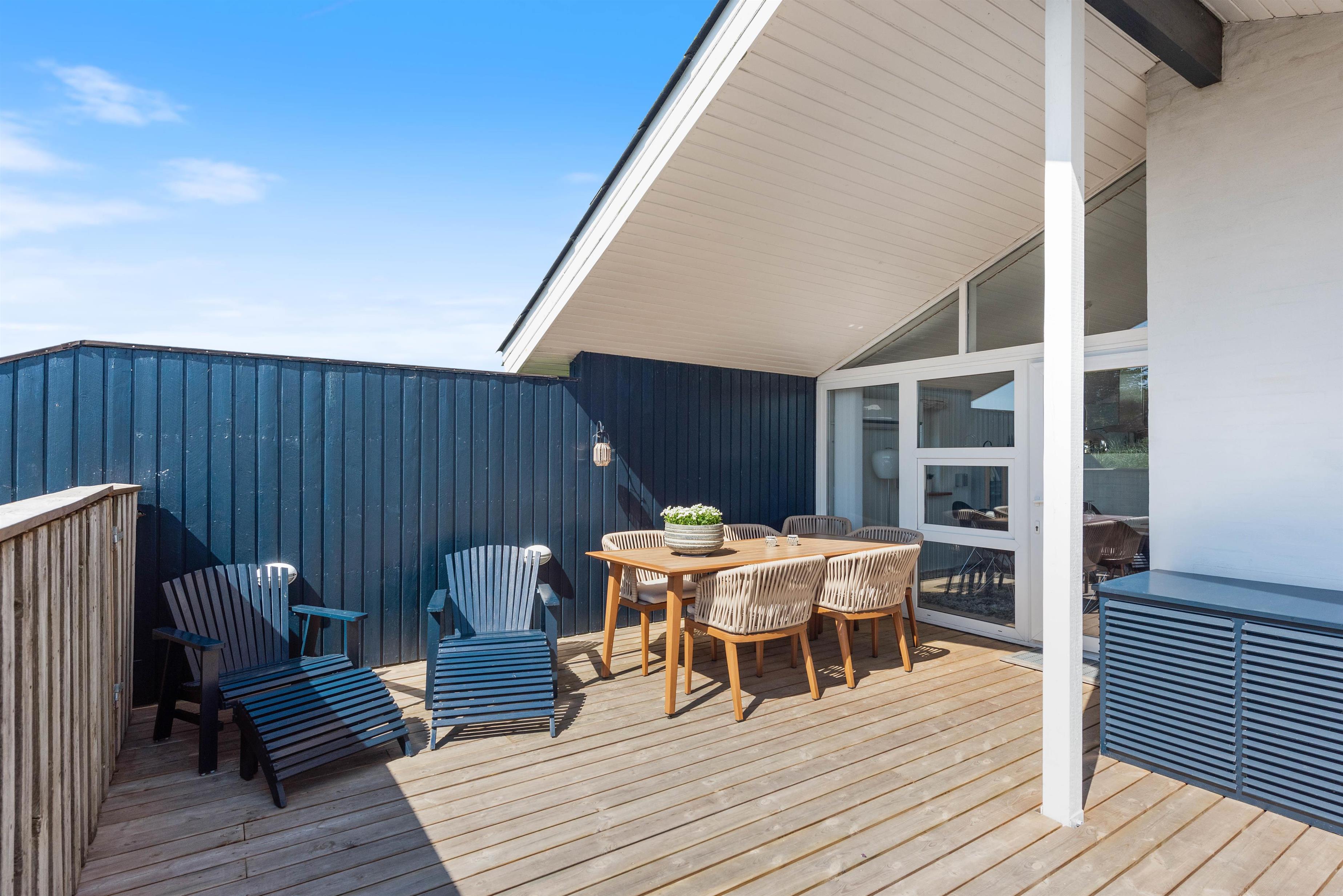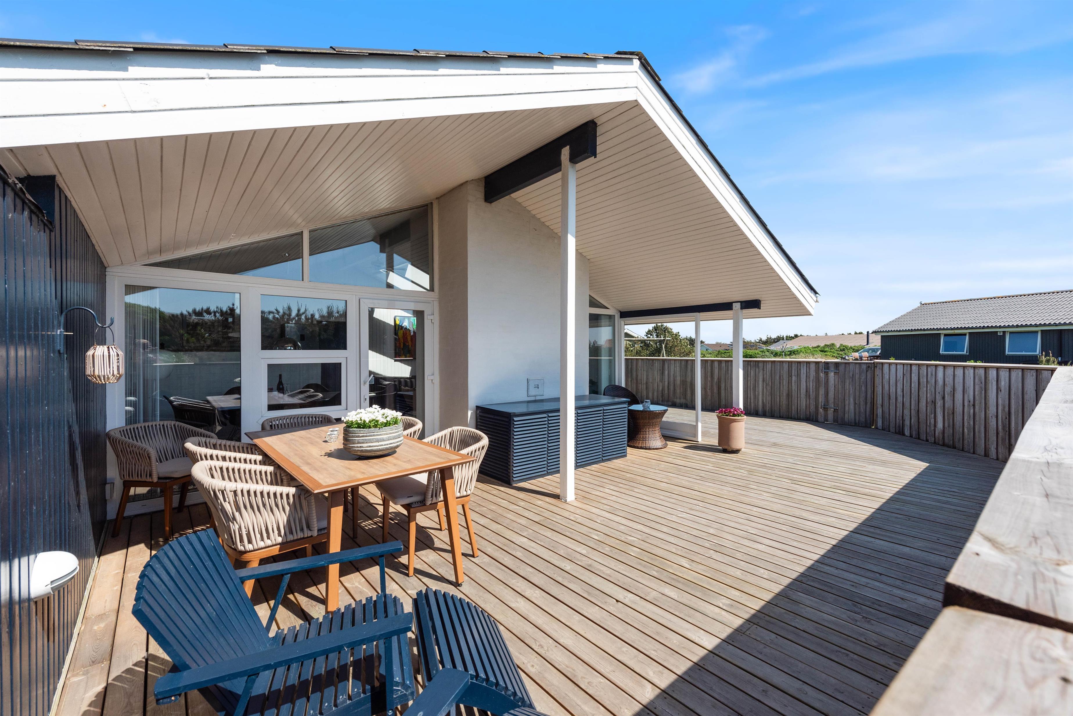 Mod øst er der en god delvist afdækket og flisebelagt terrasse, som er ideel i formiddagstimerne, eller når vinden kommer fra vest. Denne terrasse forbinder også carport, den flotte indkørsel og indgangen til feriehuset. Mod nord er der endnu en flisebelagt og helt åben terrasse. Mod syd og mod vest er der en stor og helt lukket træterrasse, som giver både læ og ro fra omverdenen.