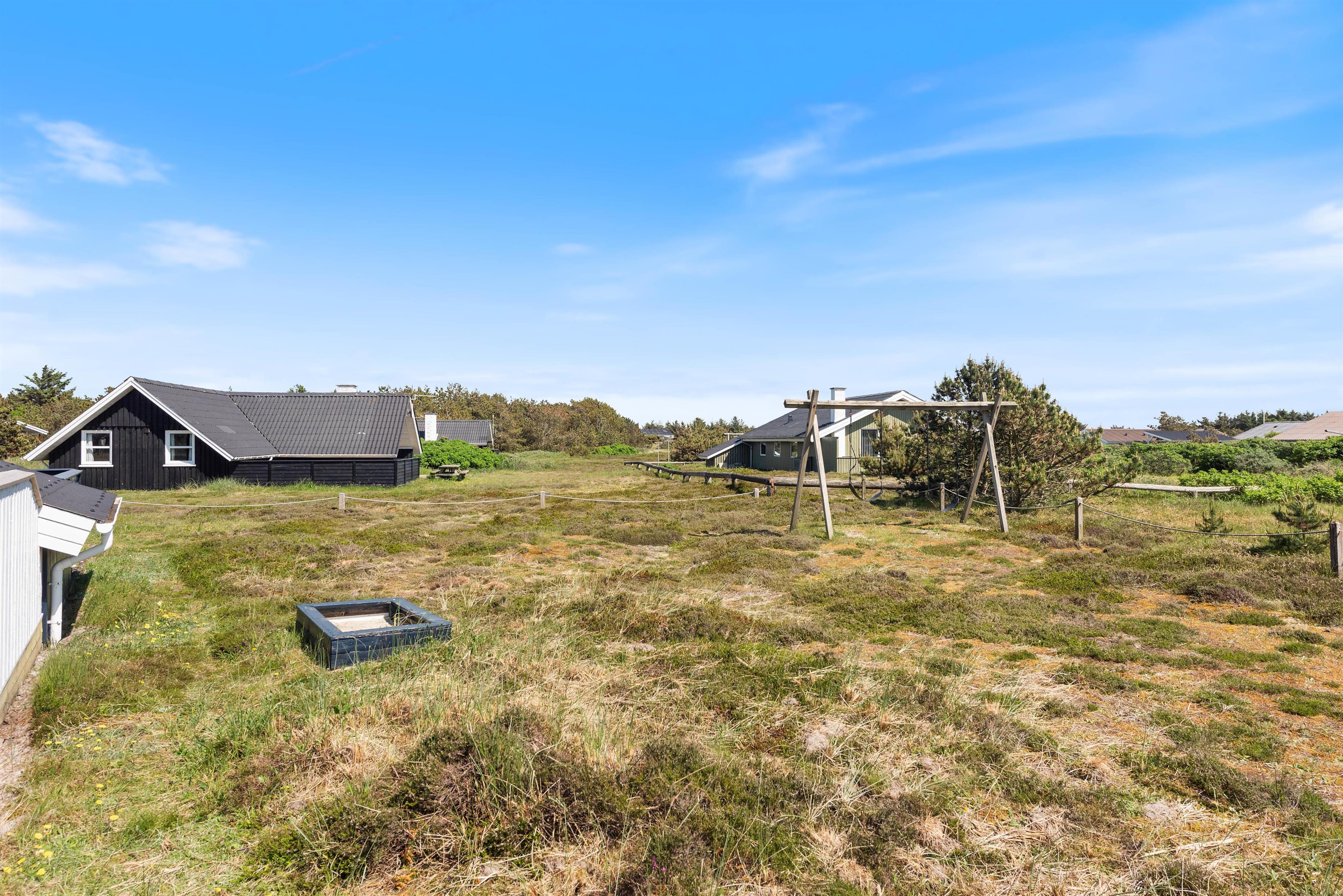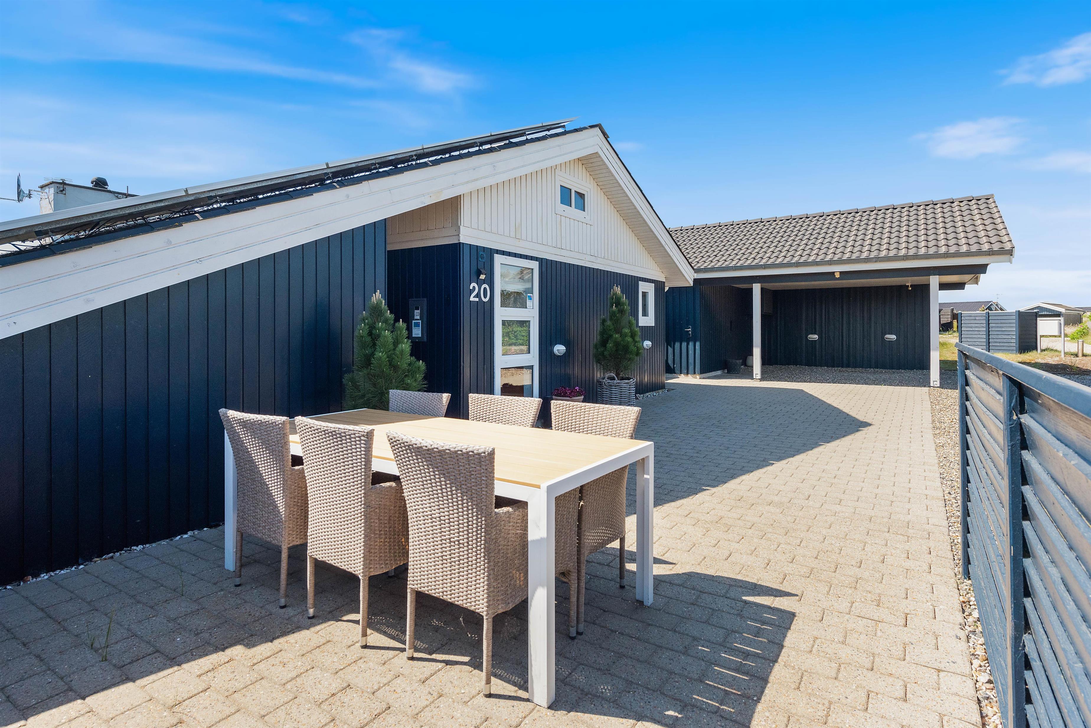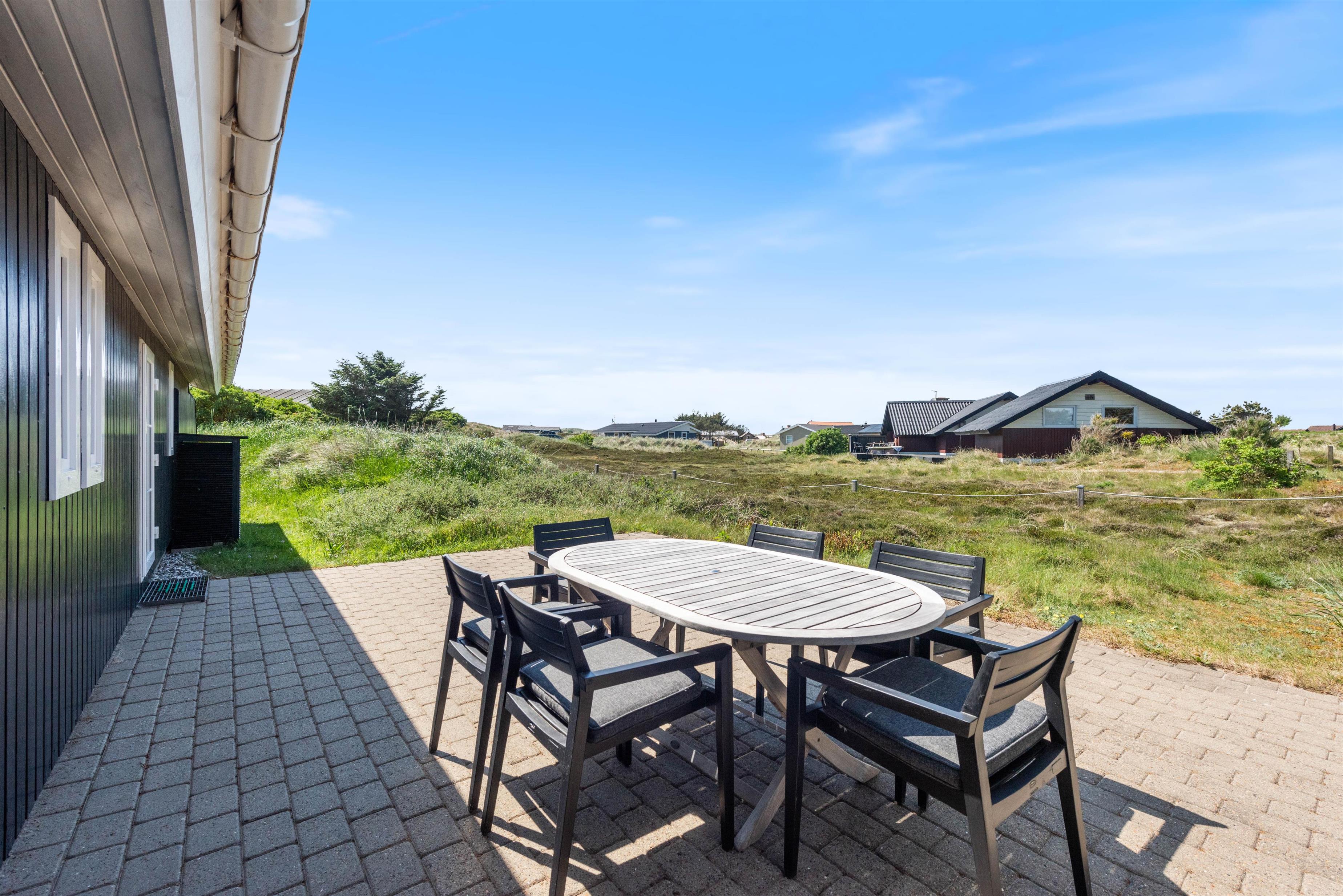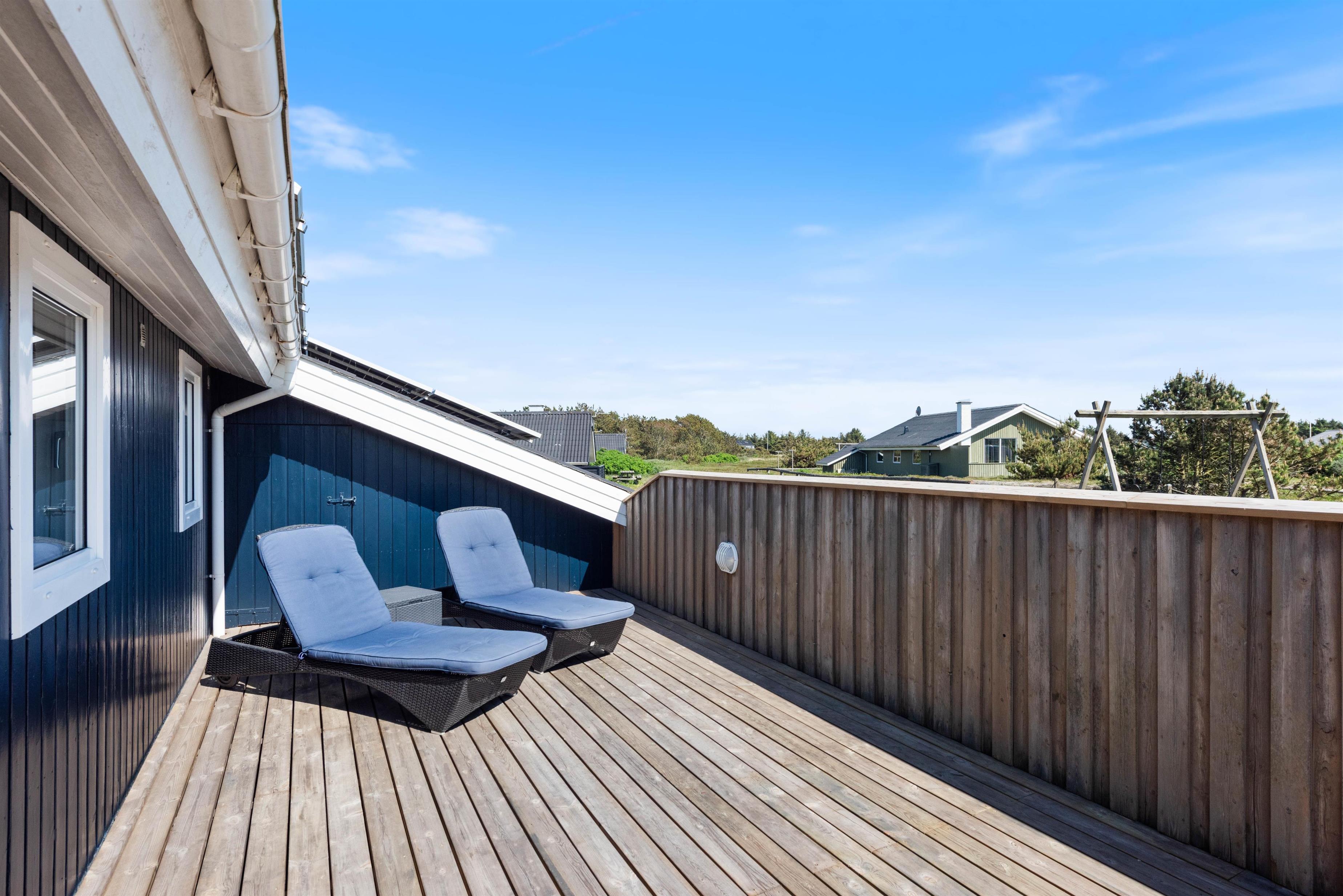 Mod øst er der en god delvist afdækket og flisebelagt terrasse, som er ideel i formiddagstimerne, eller når vinden kommer fra vest. Denne terrasse forbinder også carport, den flotte indkørsel og indgangen til feriehuset. Mod nord er der endnu en flisebelagt og helt åben terrasse. Mod syd og mod vest er der en stor og helt lukket træterrasse, som giver både læ og ro fra omverdenen.