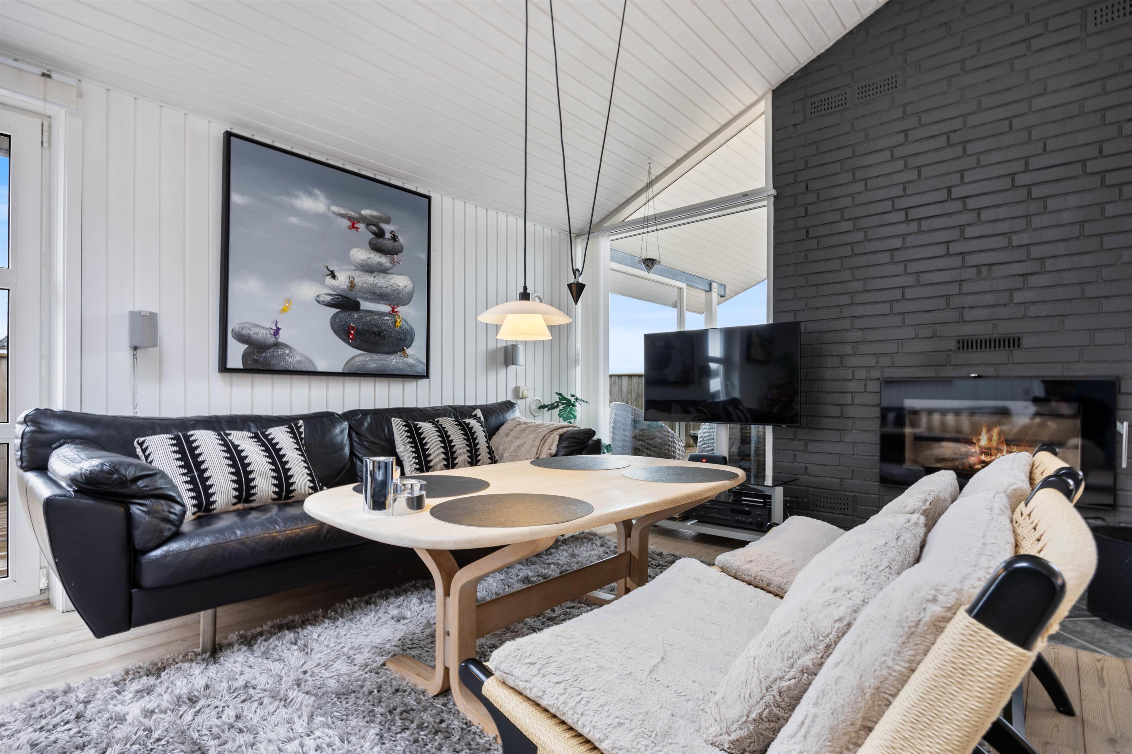 Derudover er der en hyggelig udendørs pejs og matchende stenbord. Alt er flot og gennemført og af høj kvalitet.