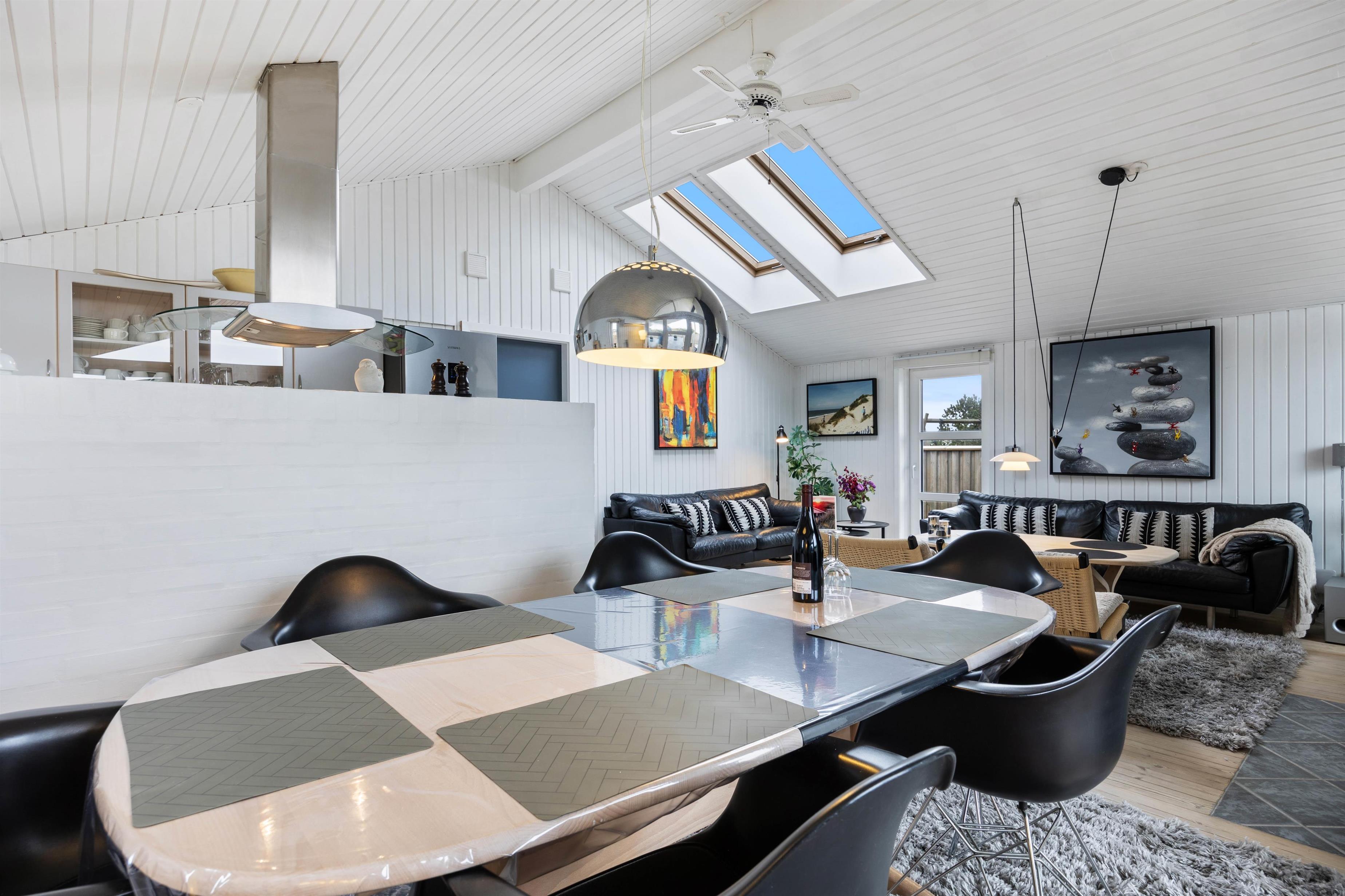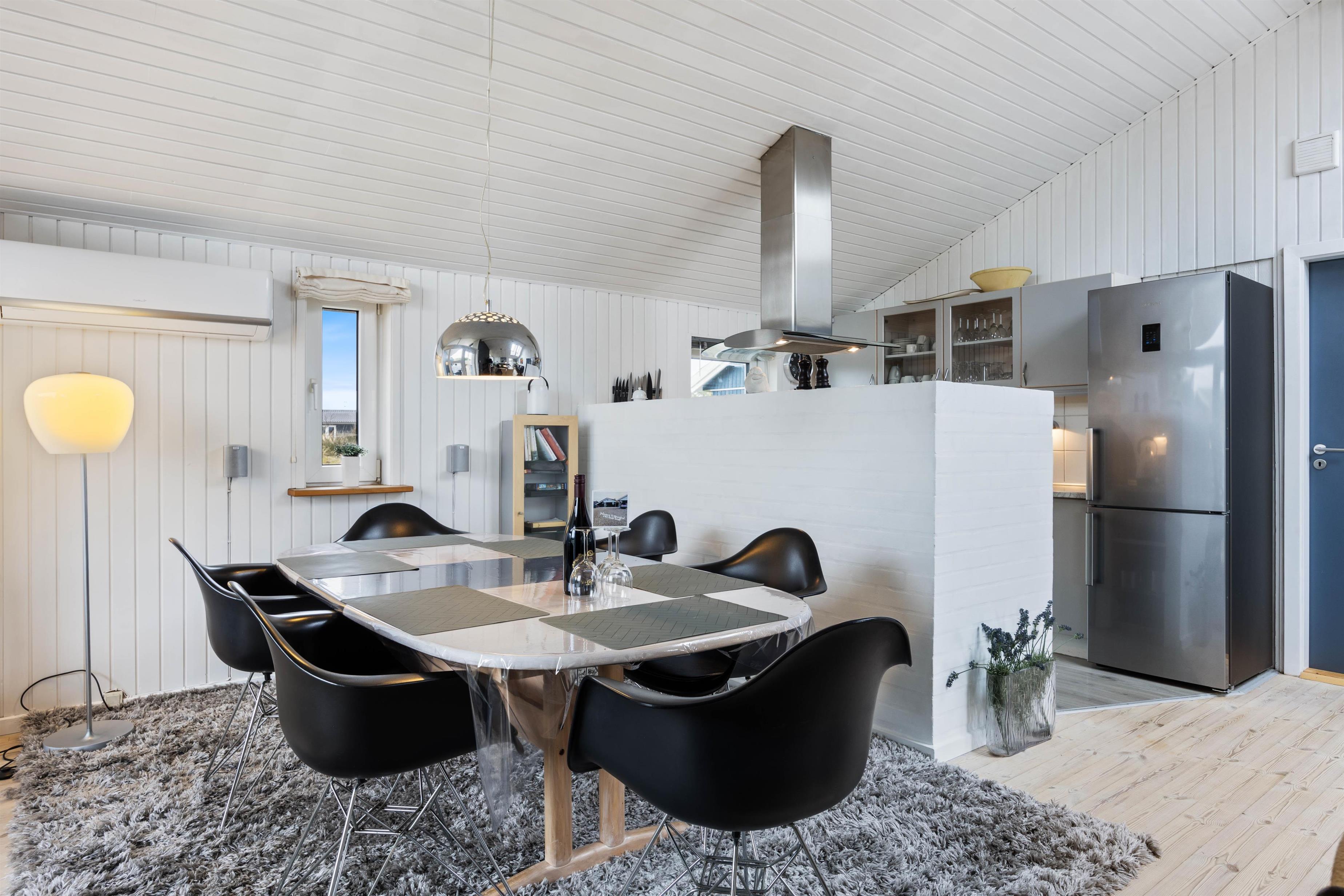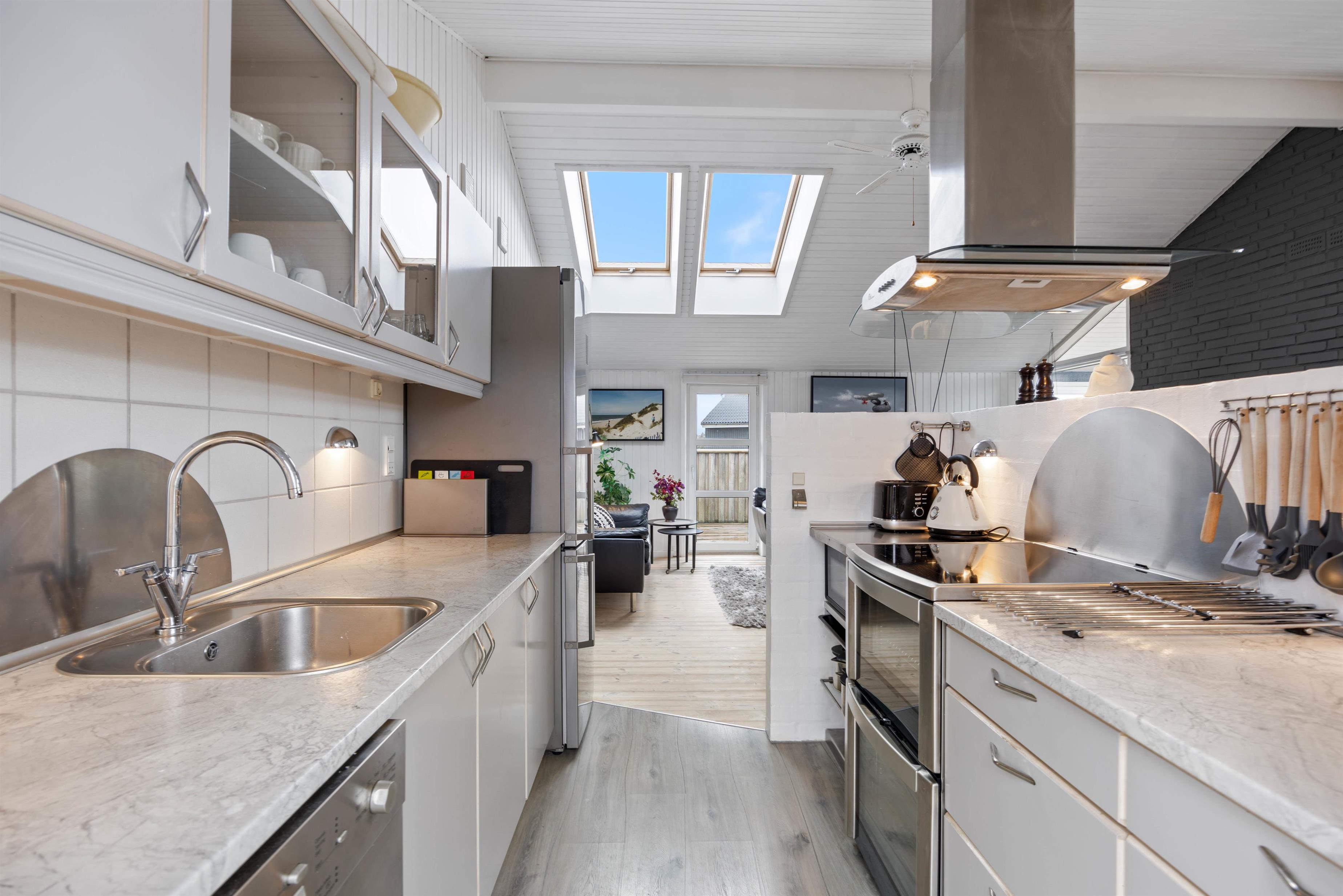 Køkken og stue går ud i et. Køkkenet har vinylgulv, og der er opvaskemaskine, fryser på 45 L og mikroovn. Den dejlige og hyggelige stue har loft til kip, en god og velplaceret brændeovn, store vinduespartier, terrasseudgang mod syd, mod vest og mod nord. Der er en fladskærm på væggen, Chromecast og gratis trådløst internet. Derudover er der 2 energibesparende varmepumper, som kan bruges som aircondition på varme dage.