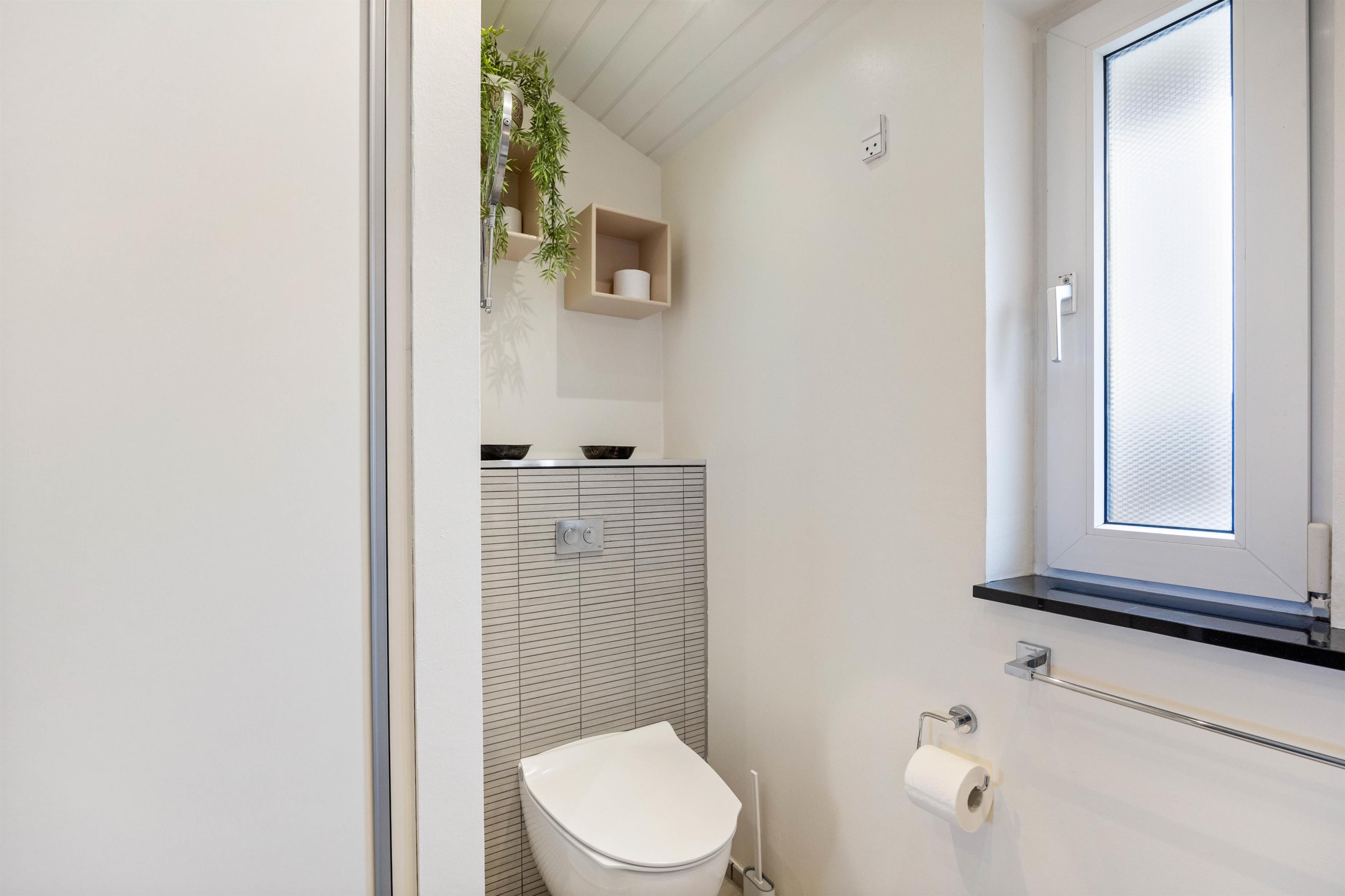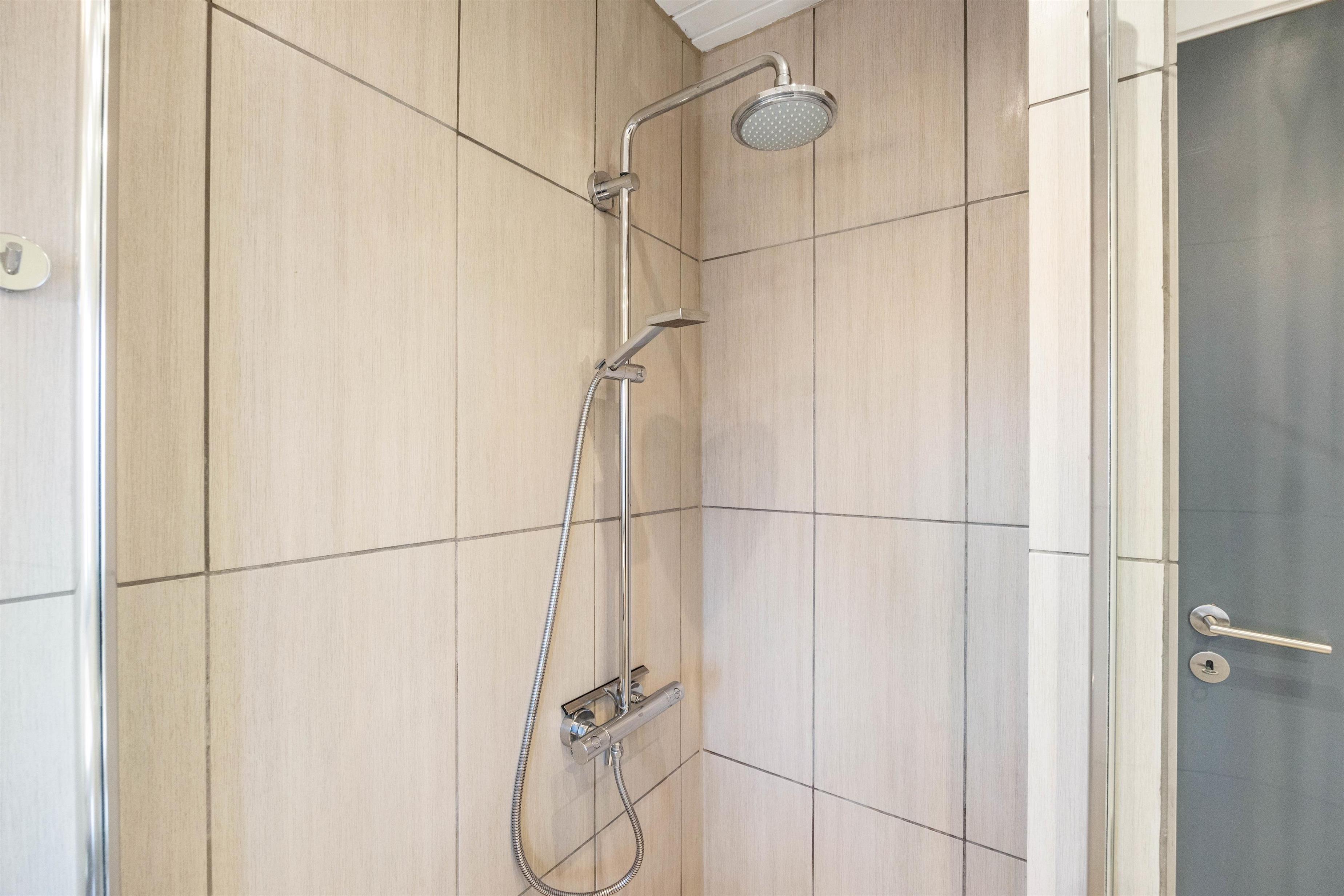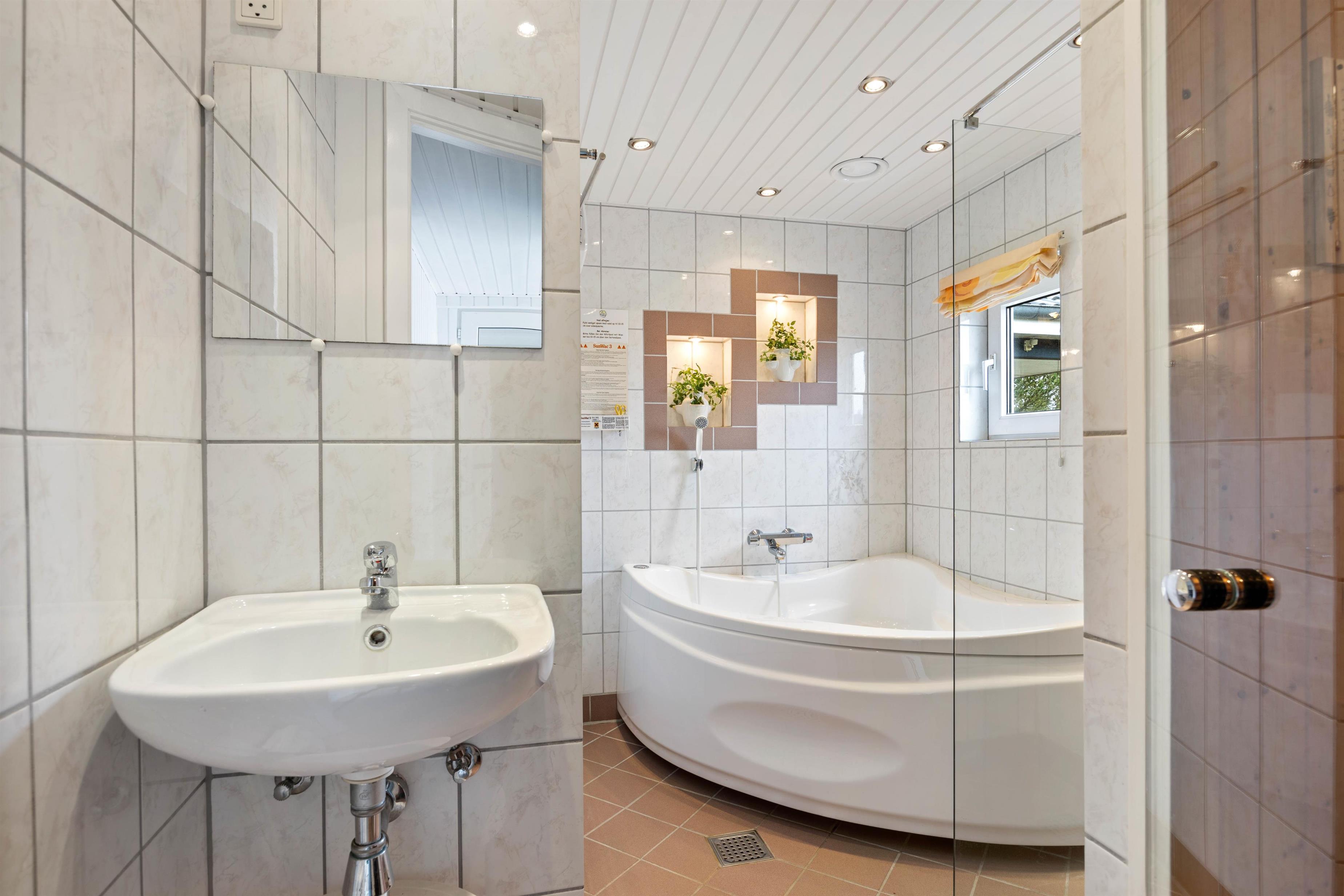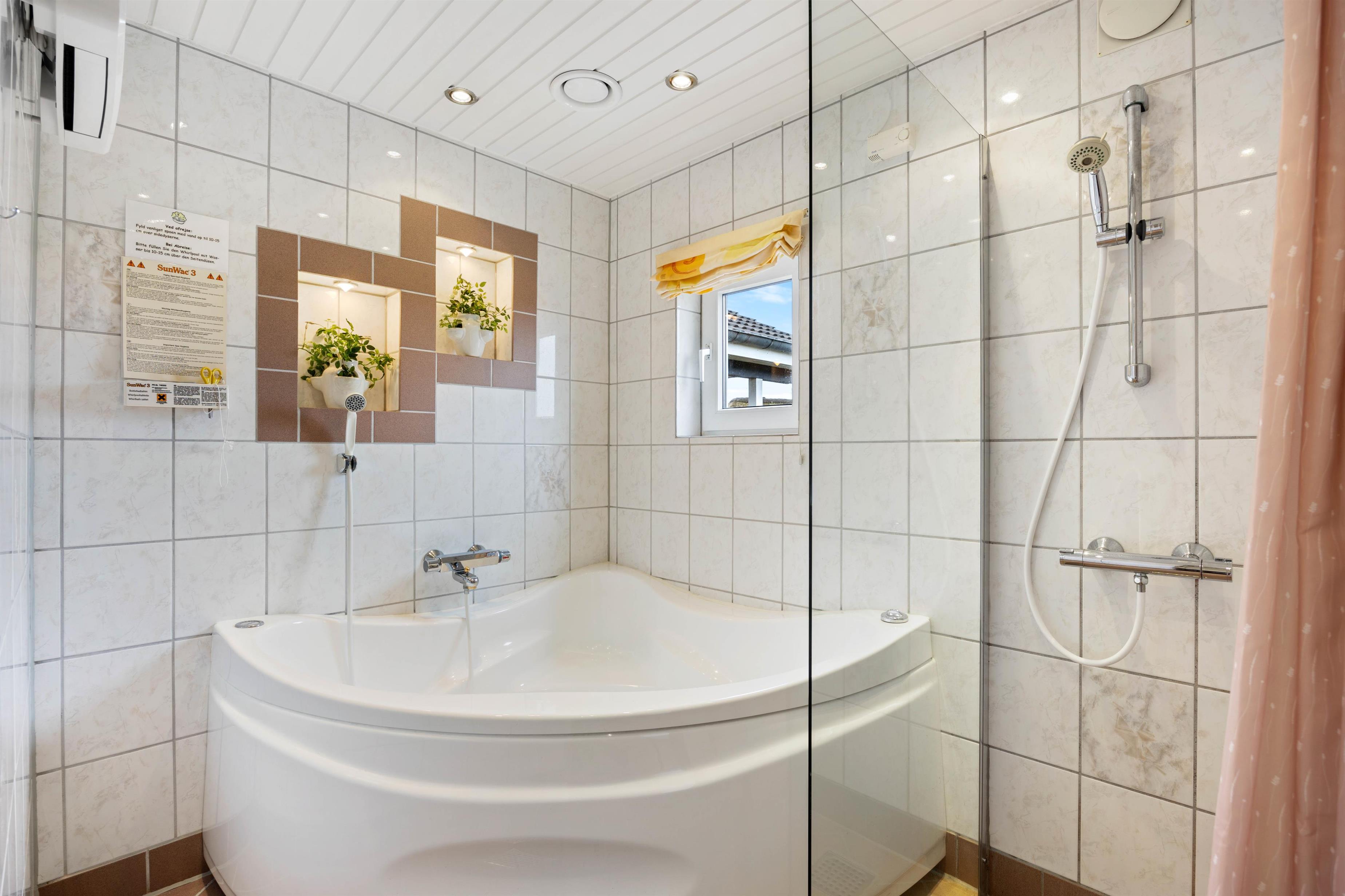 Der er 2 badeværelser, ét med spa, sauna, bruseniche og gulvvarme. Det andet har toilet, bruseniche, vaskemaskine, tørretumbler og gulvvarme.