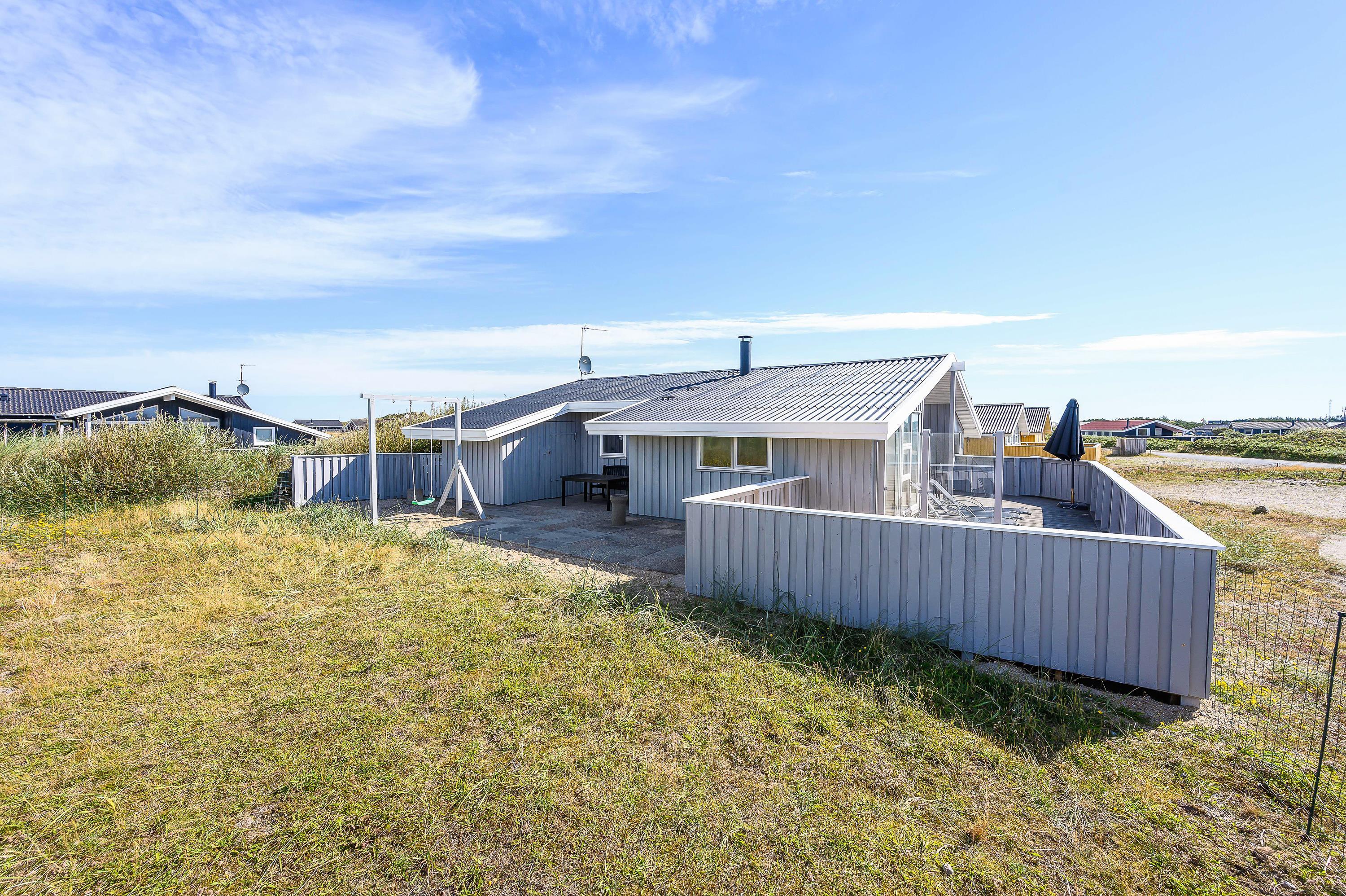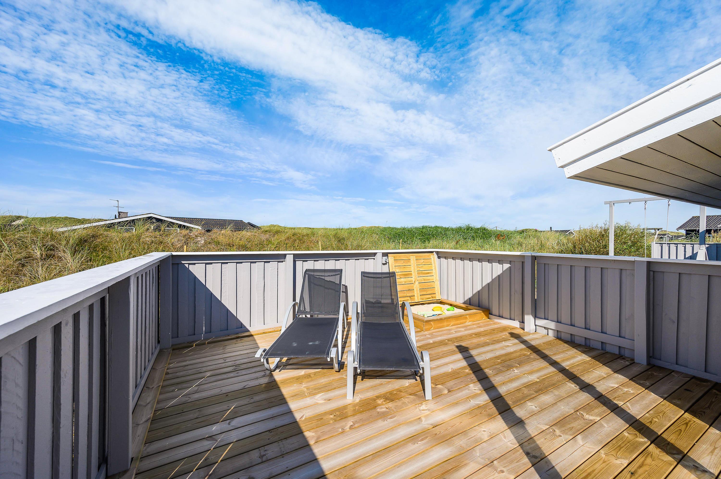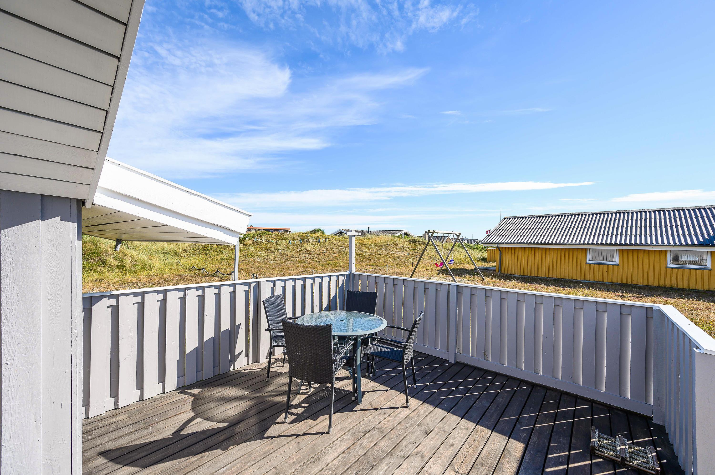 Beliggenheden på Holmsland Klit mellem hav og fjord giver masser af muligheder for aktiviteter f. eks. surfing, lystfiskeri eller vandskiløb (kabelpark) i Hvide Sande – eller hvad med en tur på golfbanen i Søndervig? På de store afskærmede og møblerede terrasser mod øst, syd og vest kan både solen og den friske havluft nydes i ro og fred. For børnene er der både gyngestativ og sandkasse.