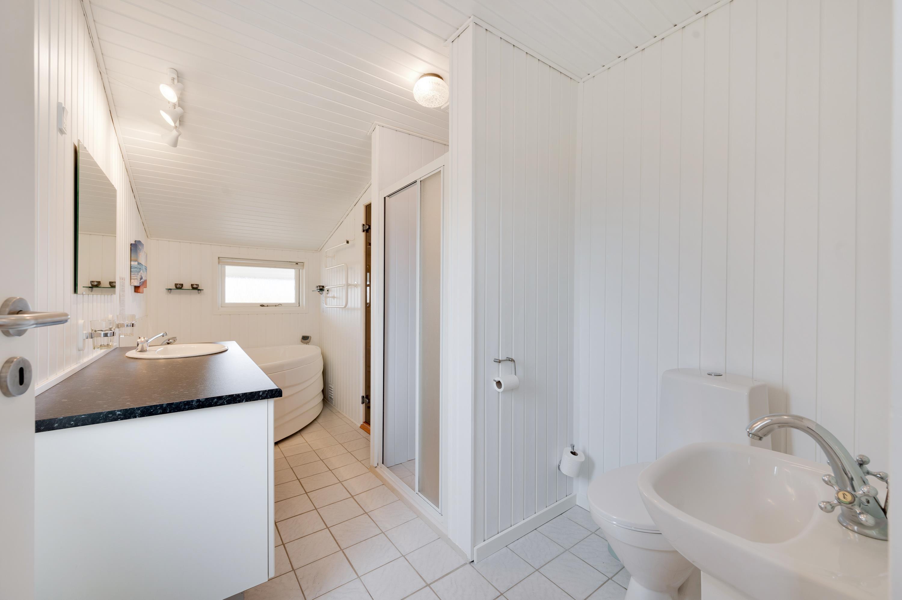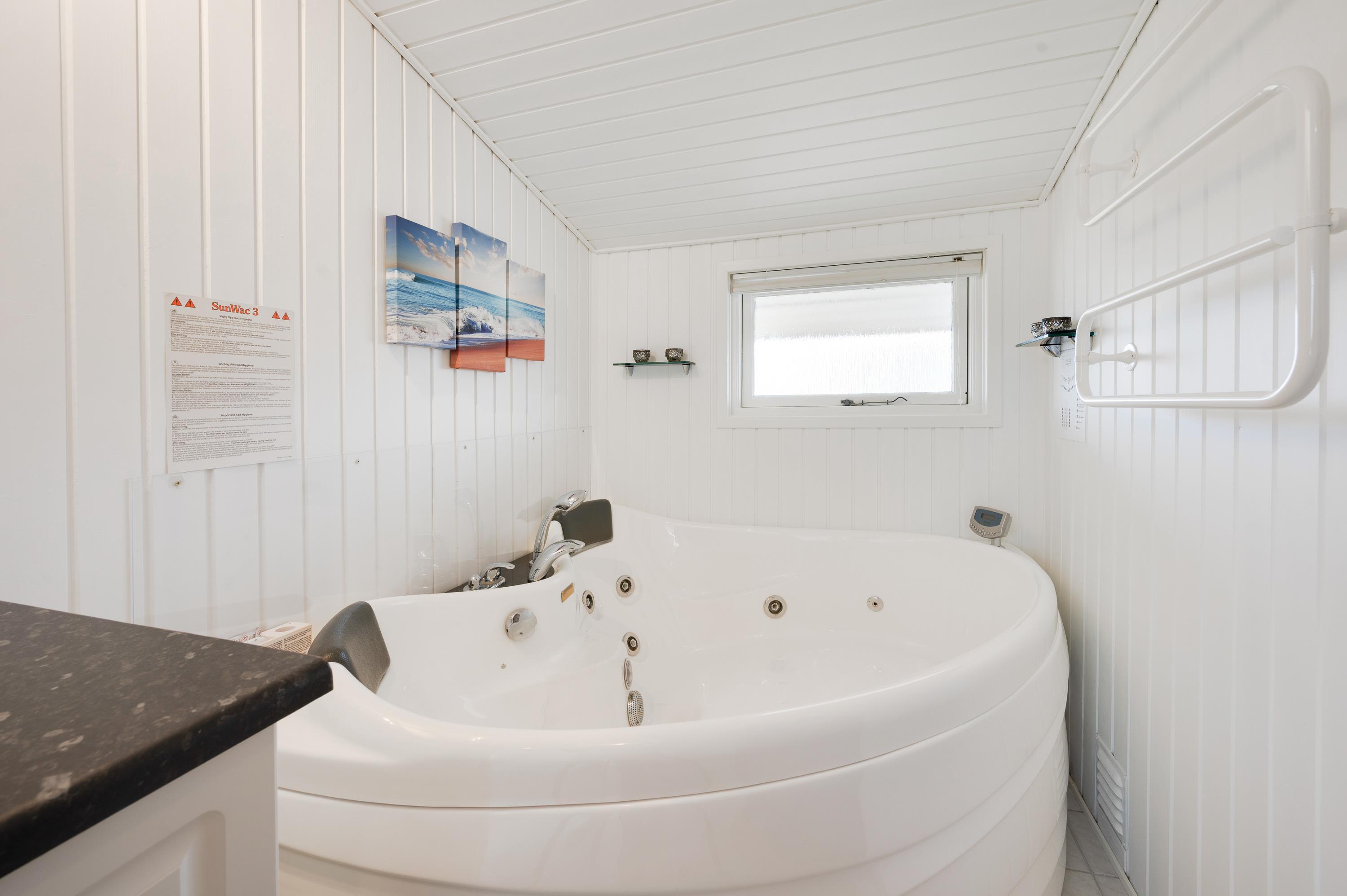 Feriehuset kan rumme op til 6 personer og 2 hunde. Som et særligt højdepunkt til jeres ferie er sommerhuset udstyret med sauna og spabad, så I virkelig kan få slappet af. Derudover sikrer gulvvarmen i badeværelset altid behageligt varme fødder.
