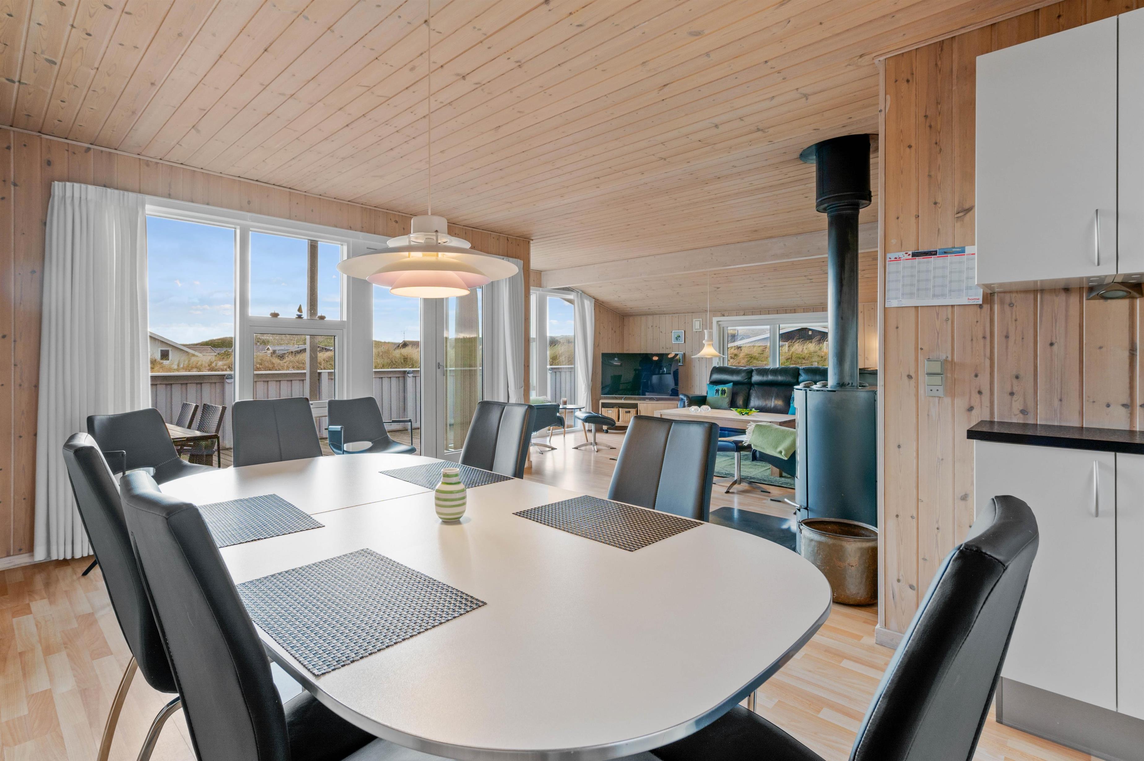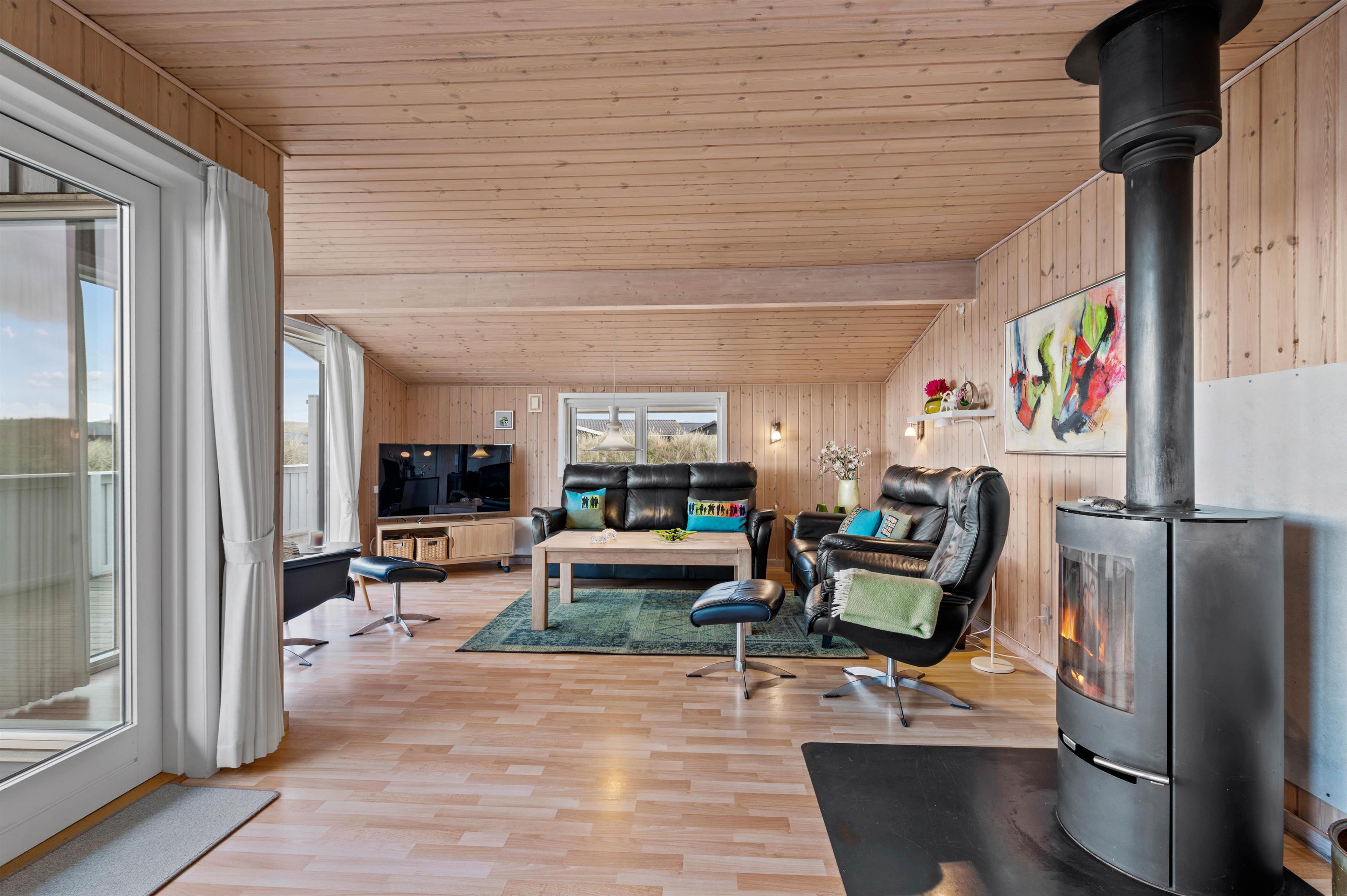 Opholdsstuen er hyggeligt indrettet med komfortable møbler, brændeovn, fladskærms-tv, dvd-afspiller og radio med cd-afspiller. Der er desuden gratis internetadgang i sommerhuset og den energibesparende varmepumpe sørger for, at eludgifterne ikke bliver for høje, og I kan nyde en behagelig temperatur i opholdsrummet.
