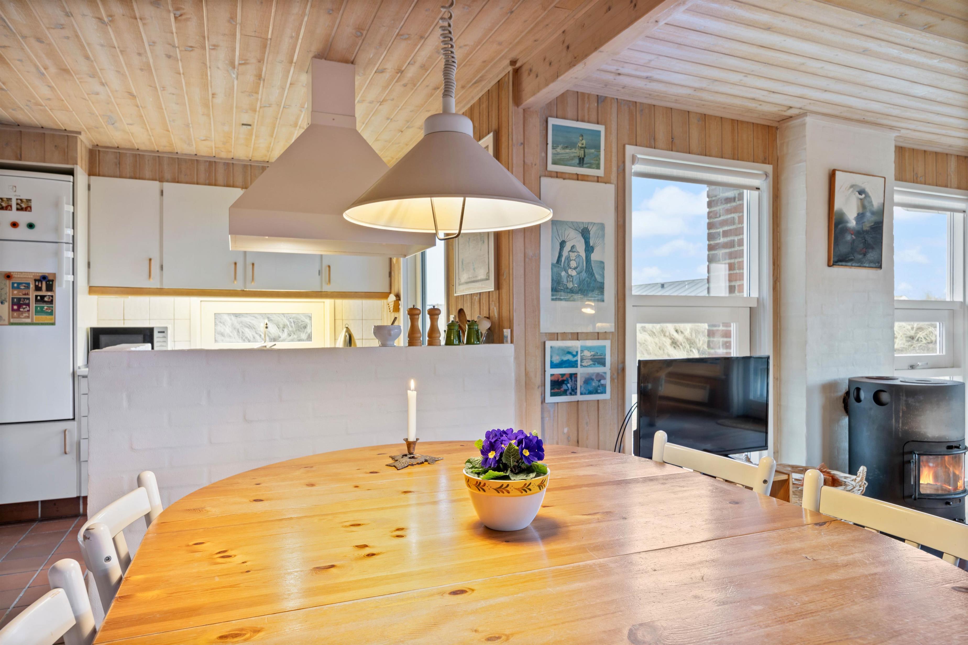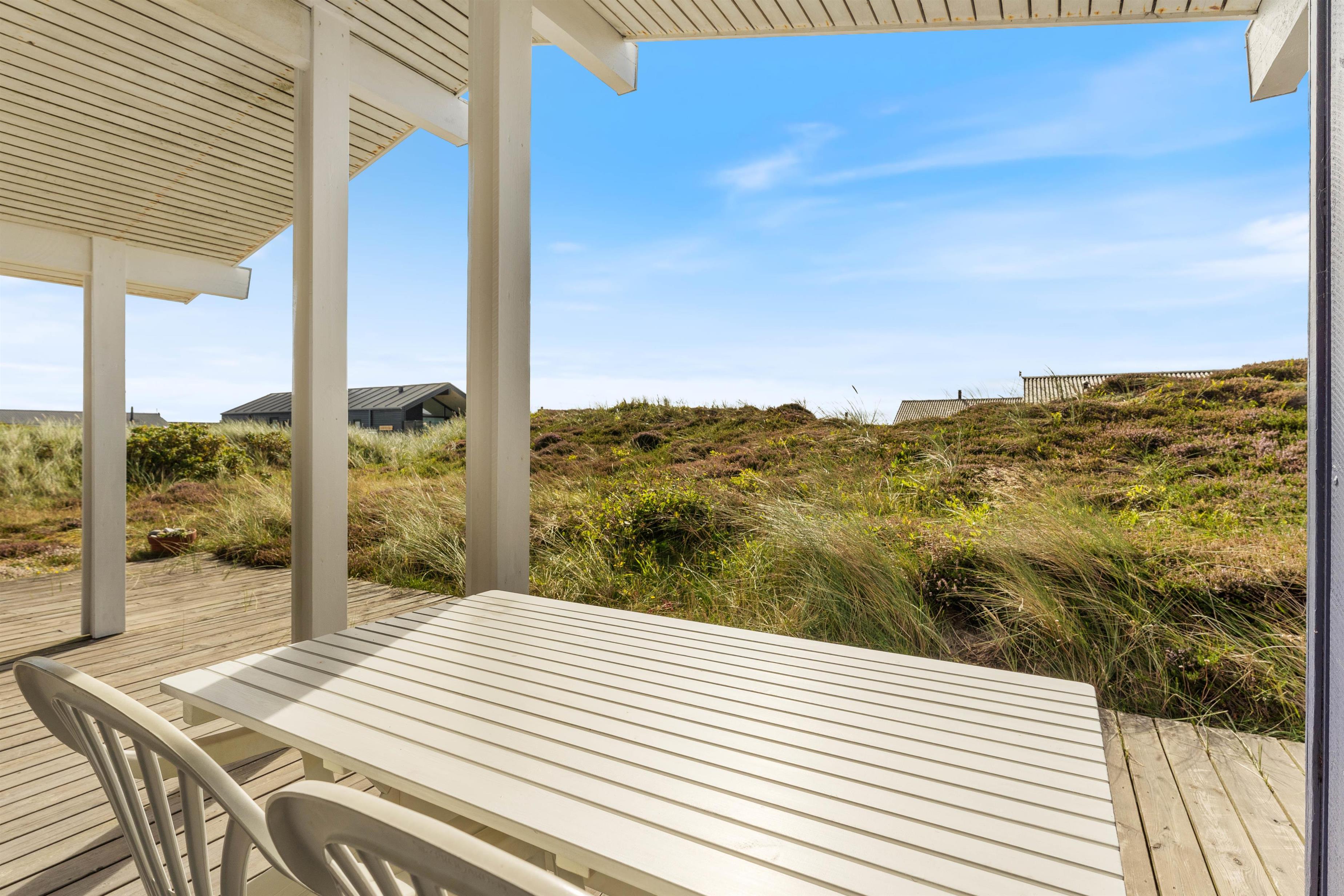 Fra alrummet har I direkte udgang til sommerhusets terrasse, som både er delvist afskærmet og overdækket. Her kan I nyde det lune sommervejr, mens bølgerne fra Vesterhavet bruser i baggrunden.