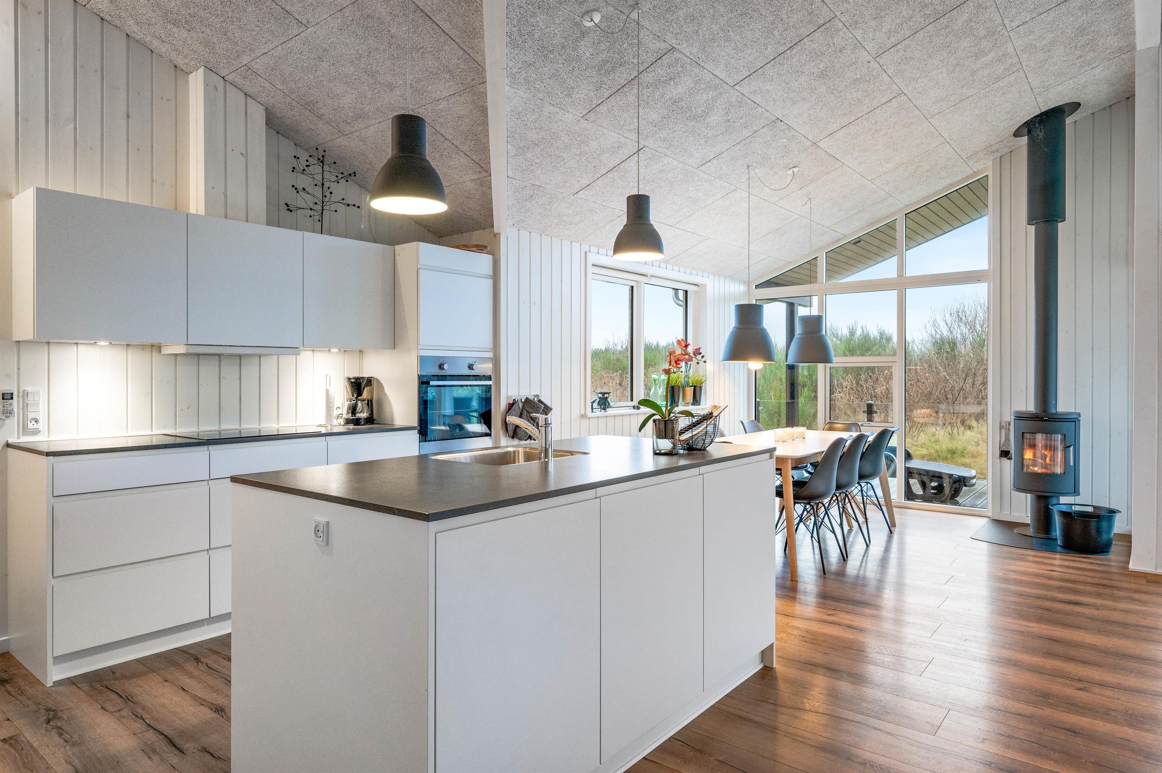 Et dejligt feriehus til otte personer, hvor jeres to firbenede venner også er velkomne. Den enkelte og moderne indretning skaber et feriehus, hvor man føler sig tilpas og har lyst til at være. Hjerterummet er det åbne køkken-alrum, hvor de store vinduer inviterer naturen indenfor. Her kan I koncentrere jer om hinanden og hygge jer med fælles madlavning, filmaftener i sofakrogen, sjove spil og planlægningen af feriens udflugter.