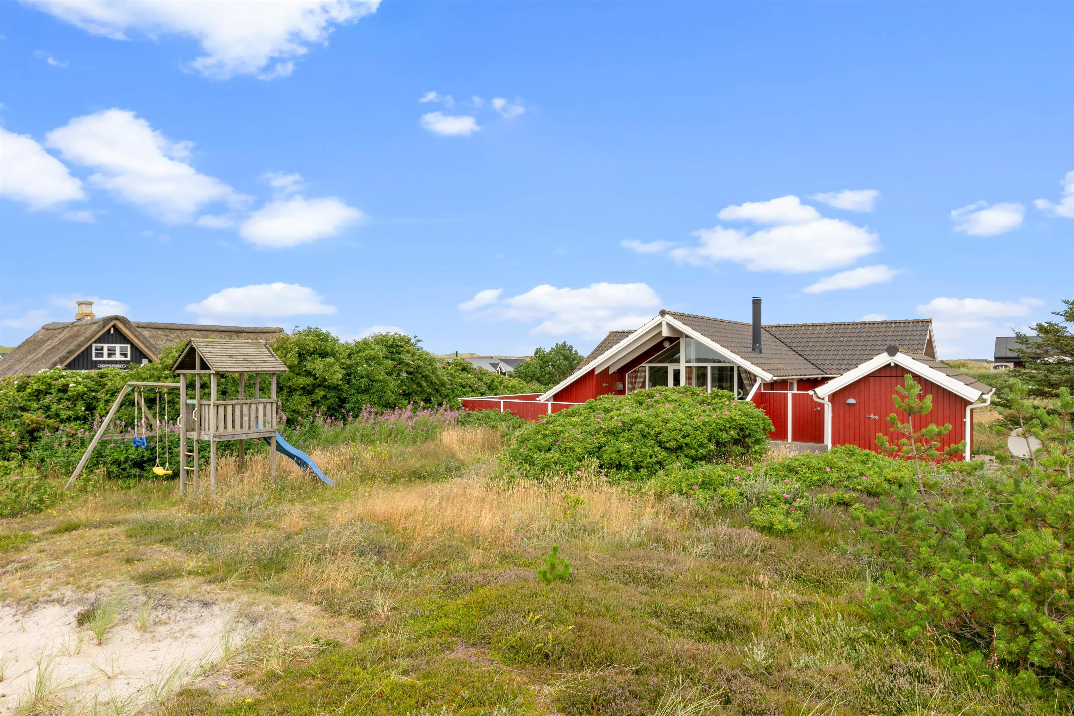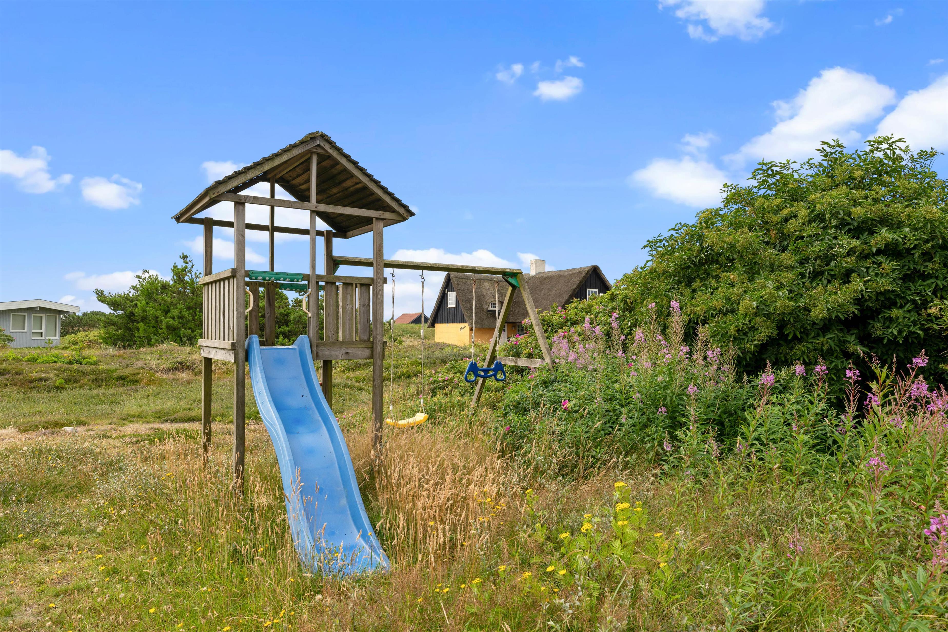 Udendørs lokker den skønne sydlige terrasse. Terrassen er indhegnet, hvilket særligt hundeejere værdsætter. Derudover er et stykke af terrassen også overdækket, så der er mulighed for at finde en plads i skyggen. Havemøbler og liggestole venter på jer, mens der på den anden side af hegnet findes et legetårn med gynge, rutsjebane og sandkasse til familiens mindste. På de lune sommeraftener kan I spise aftensmad udenfor med lækker mad fra grillen og ristede skumfiduser.