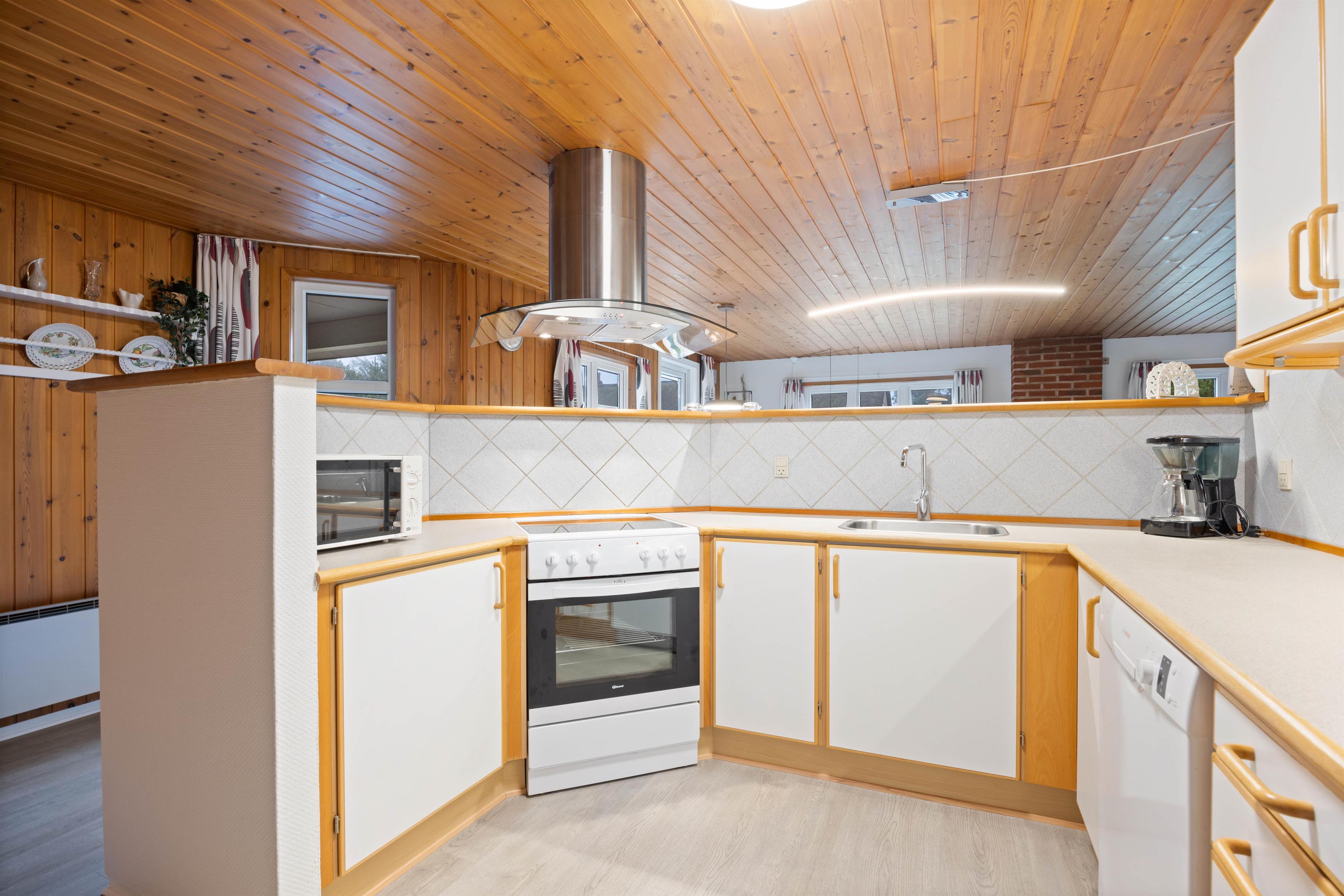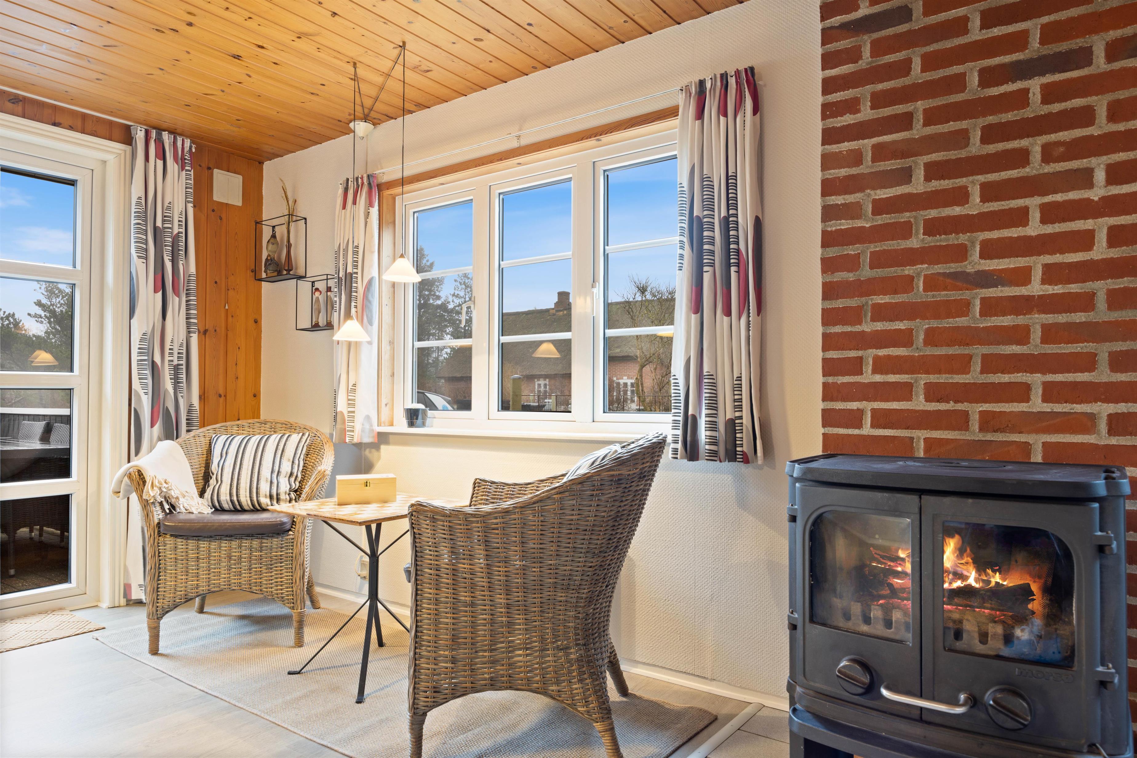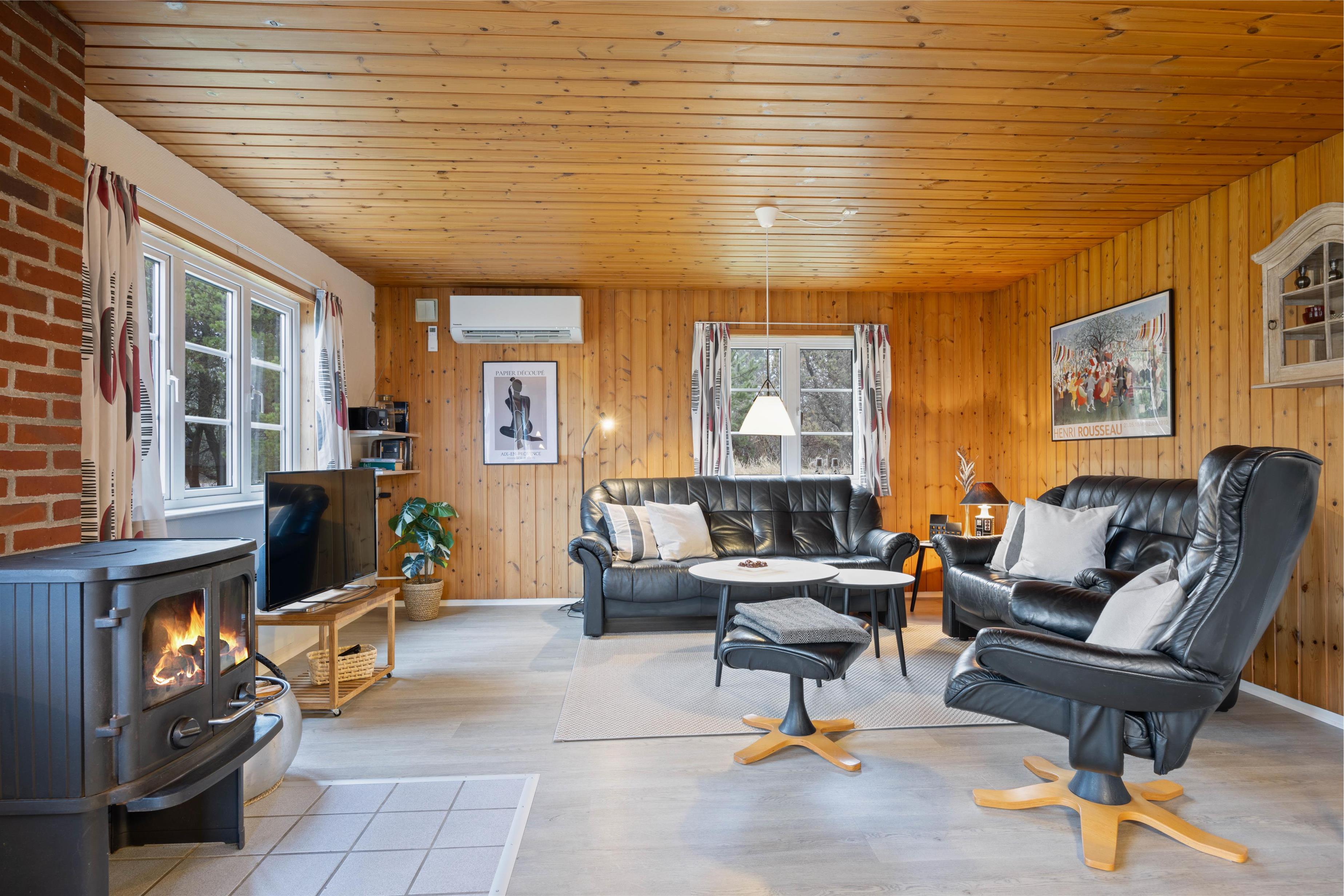 Køkkenet er hjertet i sommerhuset og er i åben forbindelse med både spiseafdeling og den godt møblerede opholdsafdeling, hvor brændeovnen spreder hygge og indbyder til afslapning på ferien. Her er også en varmepumpe, som I med fordel kan benytte jer af.