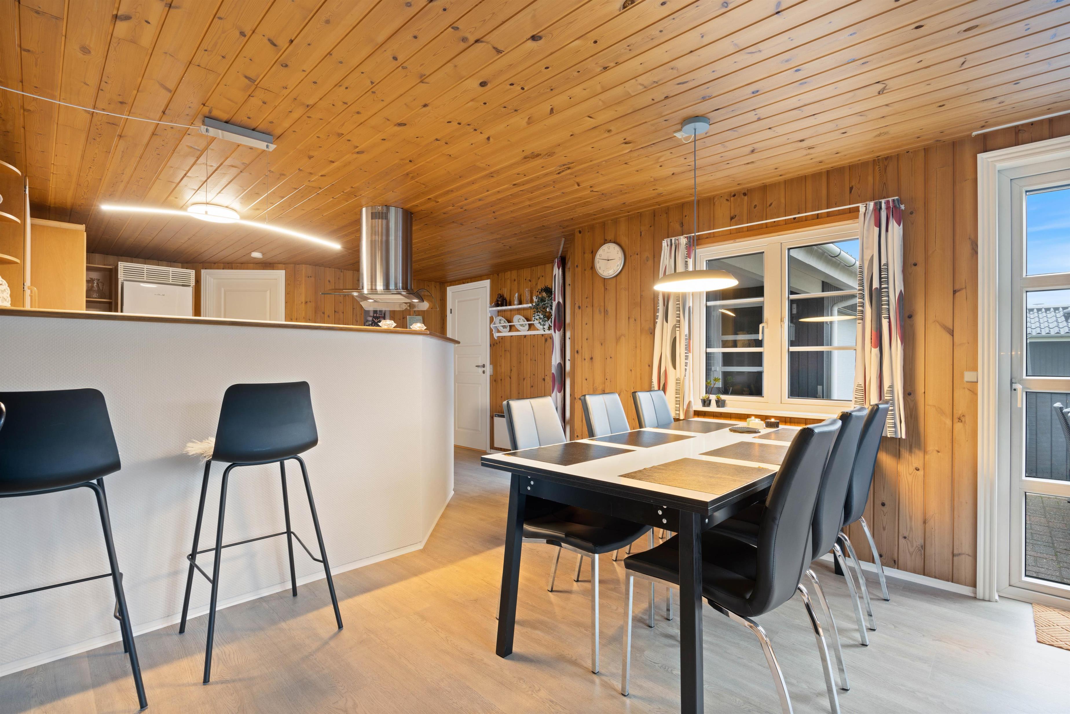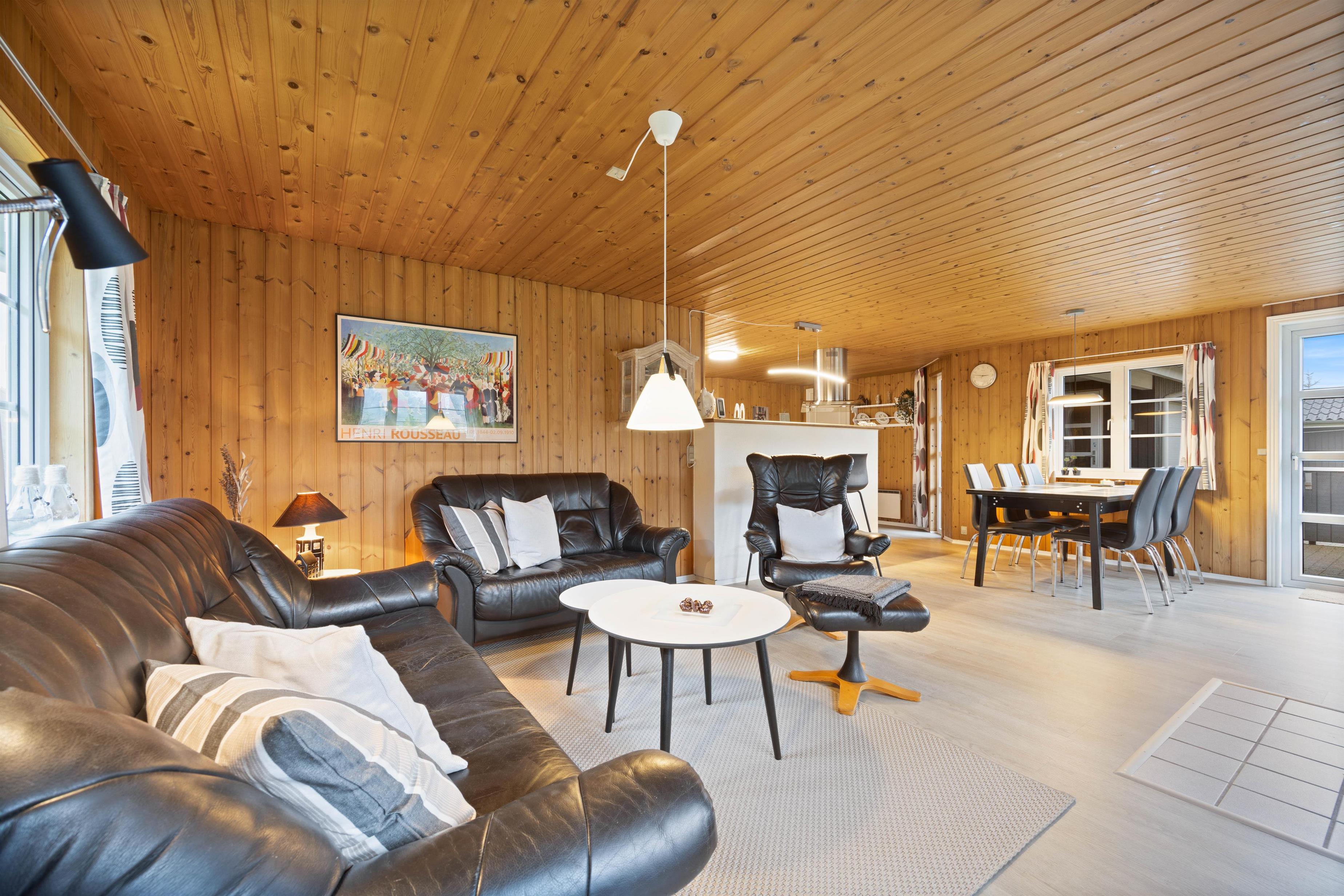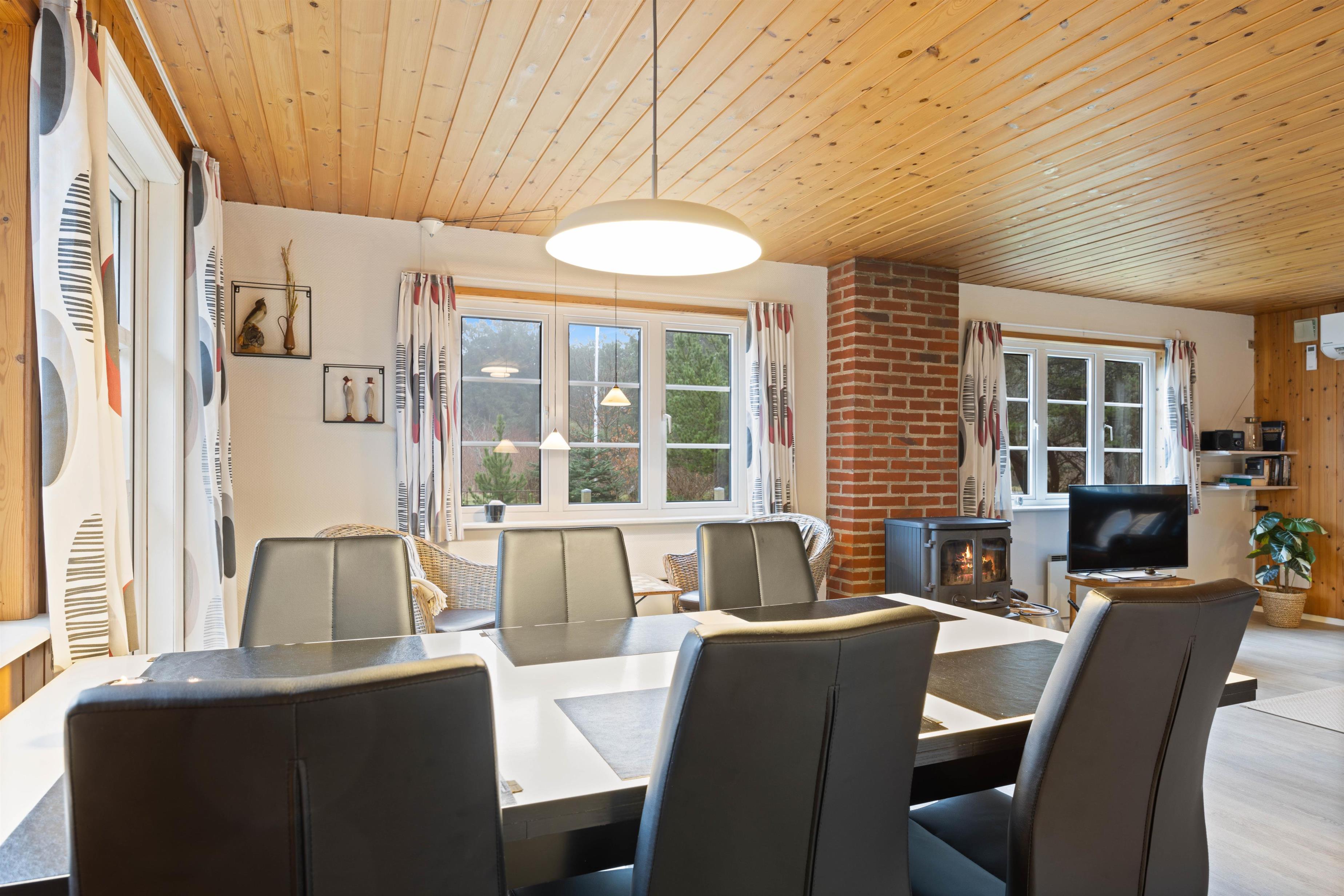Køkkenet er hjertet i sommerhuset og er i åben forbindelse med både spiseafdeling og den godt møblerede opholdsafdeling, hvor brændeovnen spreder hygge og indbyder til afslapning på ferien. Her er også en varmepumpe, som I med fordel kan benytte jer af.