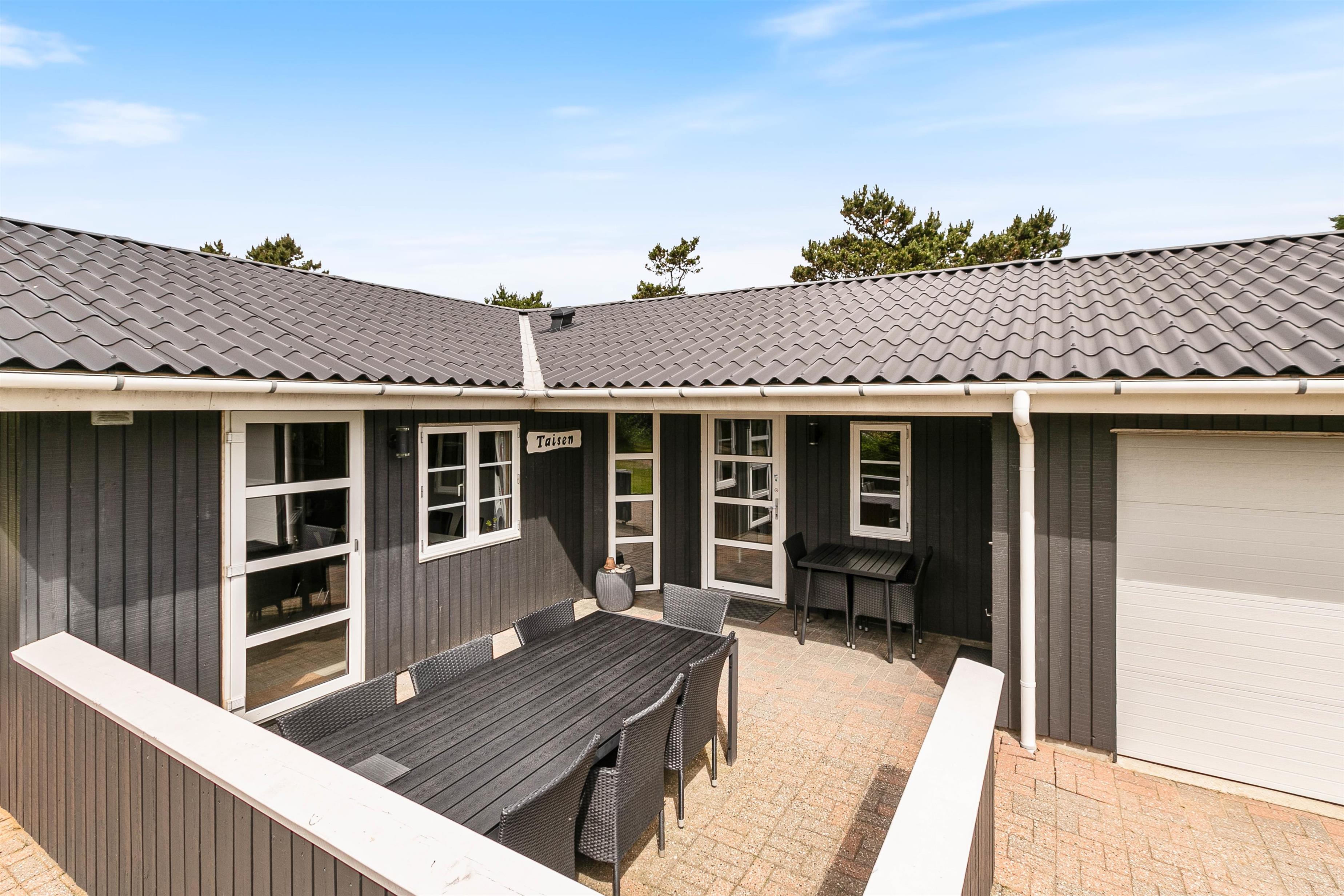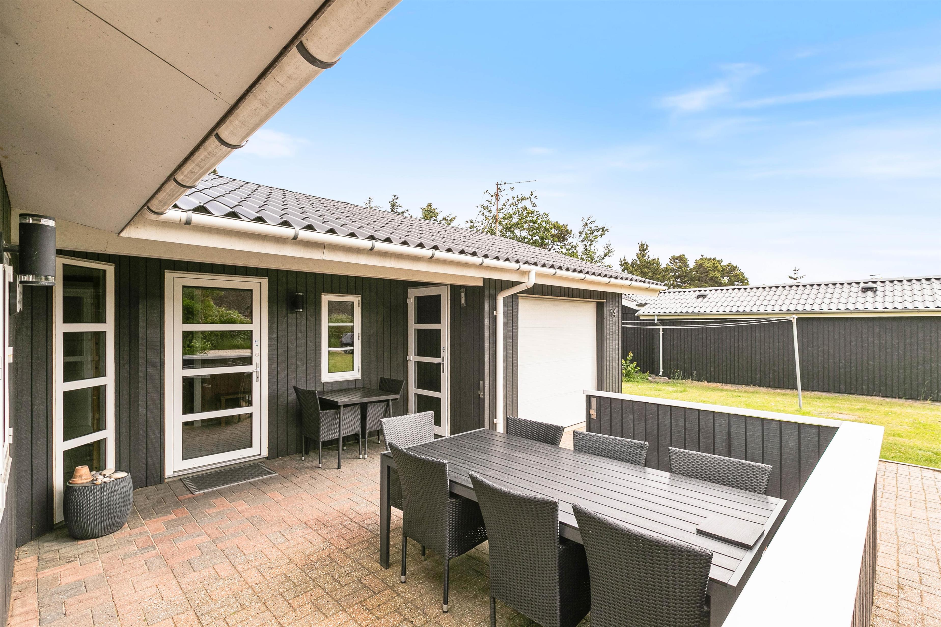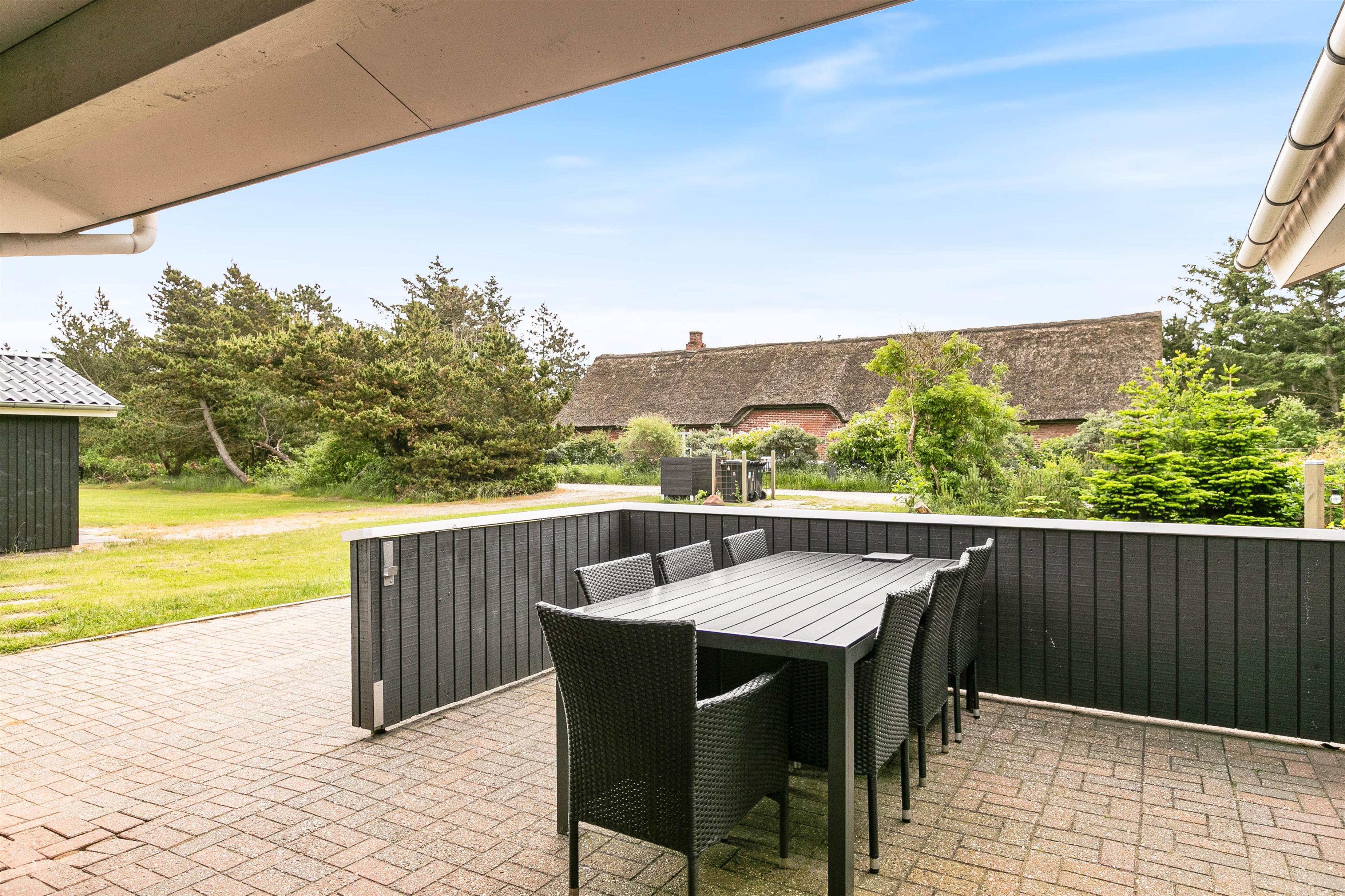 Sommerhuset er beliggende på en fin naturgrund, er omgivet af fyrretræer på de tre sider og giver både læ samt fred og ro på ferien. Her kan børnene og hunden udfolde sig på plænen eller i gyngerne og sandkassen og den fine møblerede terrasse med grill opfordrer til nydelse af naturen og den friske havluft. Terrassen er delvist afskærmet, så I kan sidde i læ for vinden.