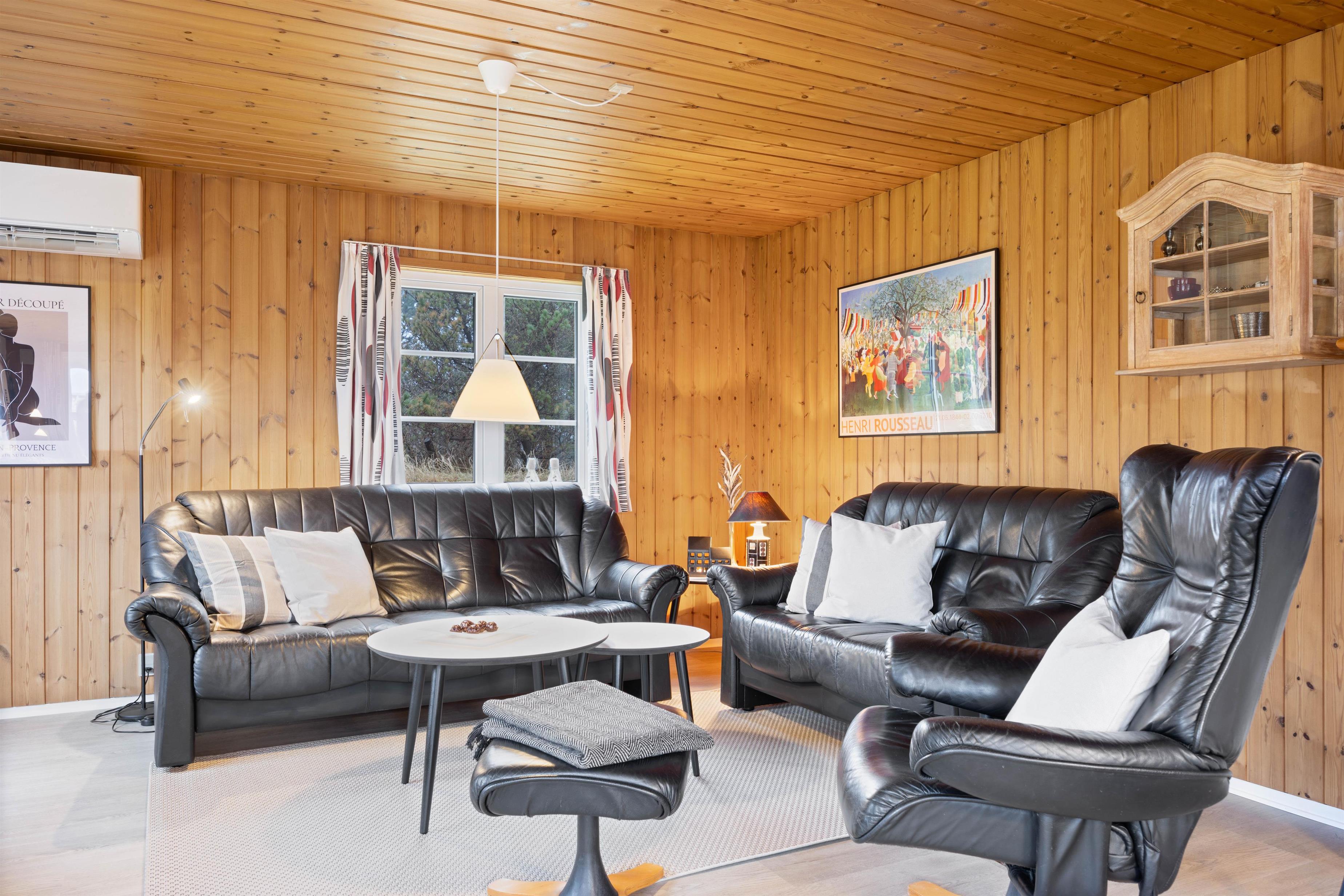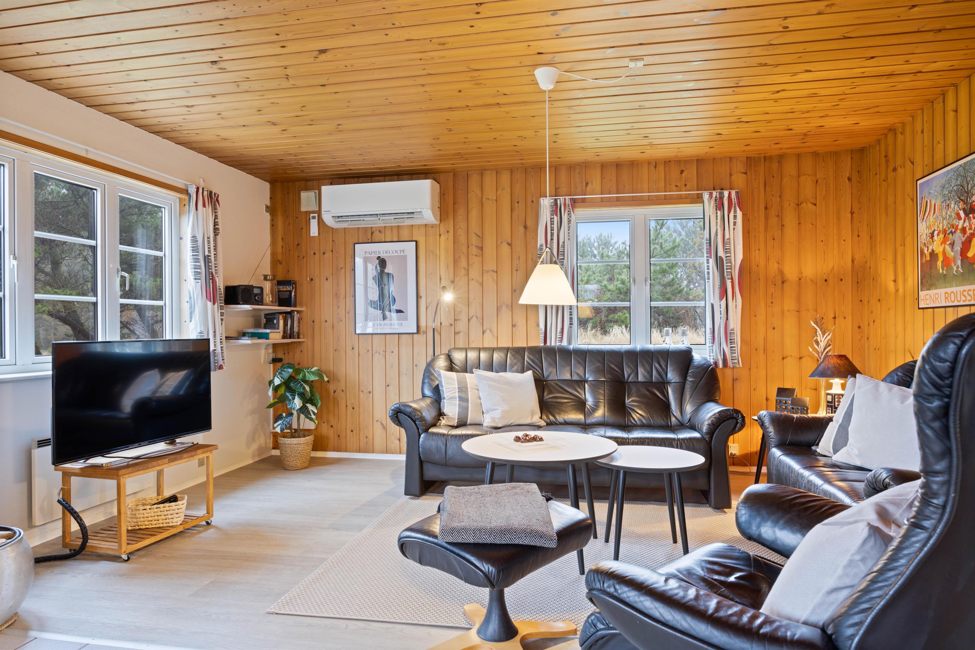 Det hyggelige sommerhus har en indbydende indretning med træbeklædte lofter og vægge.