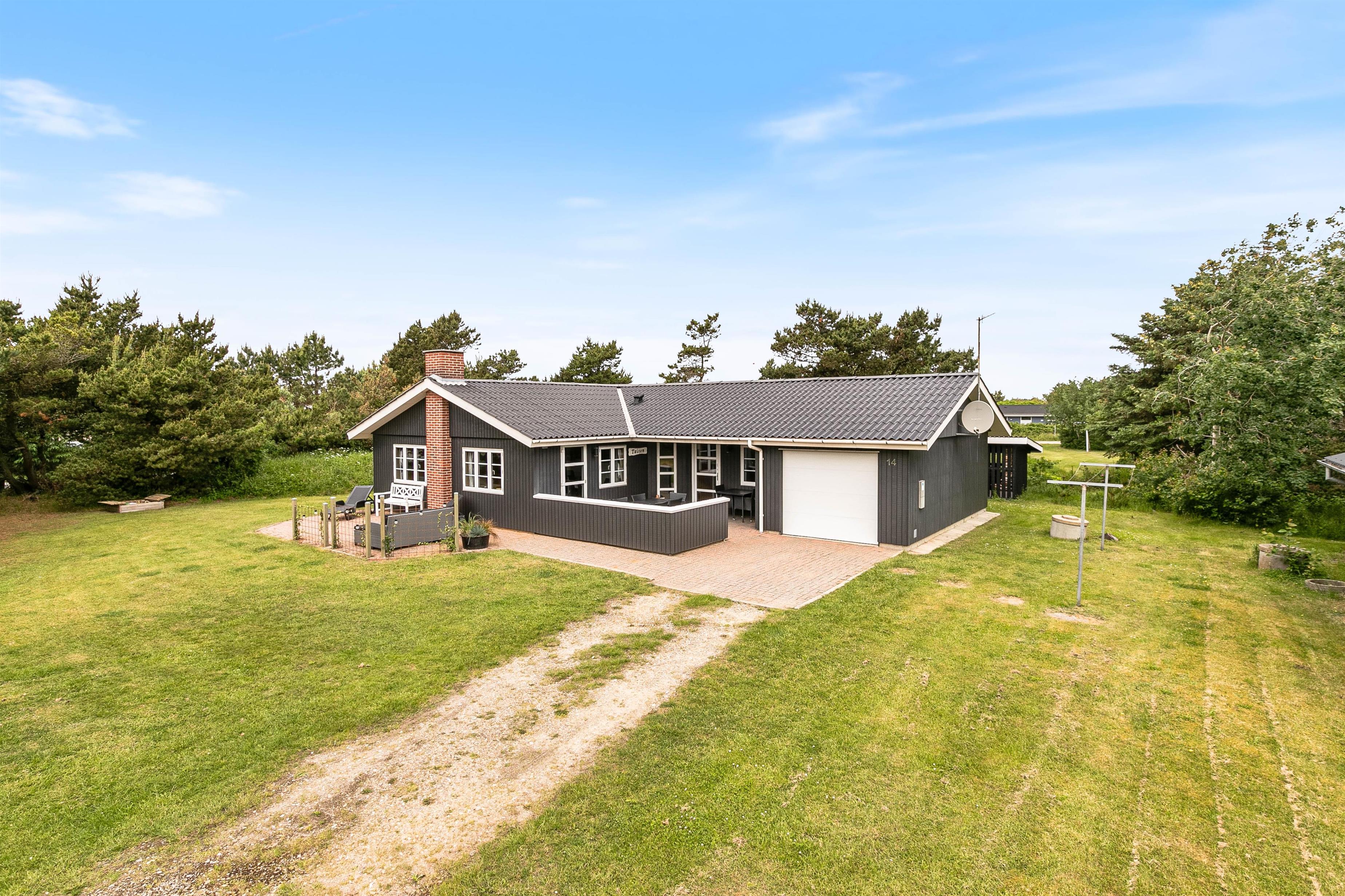 På Humlegårdsvej 14 i Bjerregård finder du dette flotte feriehus med garage – perfekt til jer, der søger en rolig ferie midt i den vestjyske natur. Huset ligger på en dejlig naturgrund omgivet af fyrretræer, som giver både læ og privatliv. Her er masser af plads til hele familien, og også hunden er hjertelig velkommen. Udenfor venter en fin, delvist afskærmet og møbleret terrasse, hvor du kan nyde solen det meste af dagen. For de yngste gæster er der gyngestativ og sandkasse, så børnene kan lege frit, mens de voksne slapper af med en kop kaffe eller en god bog.