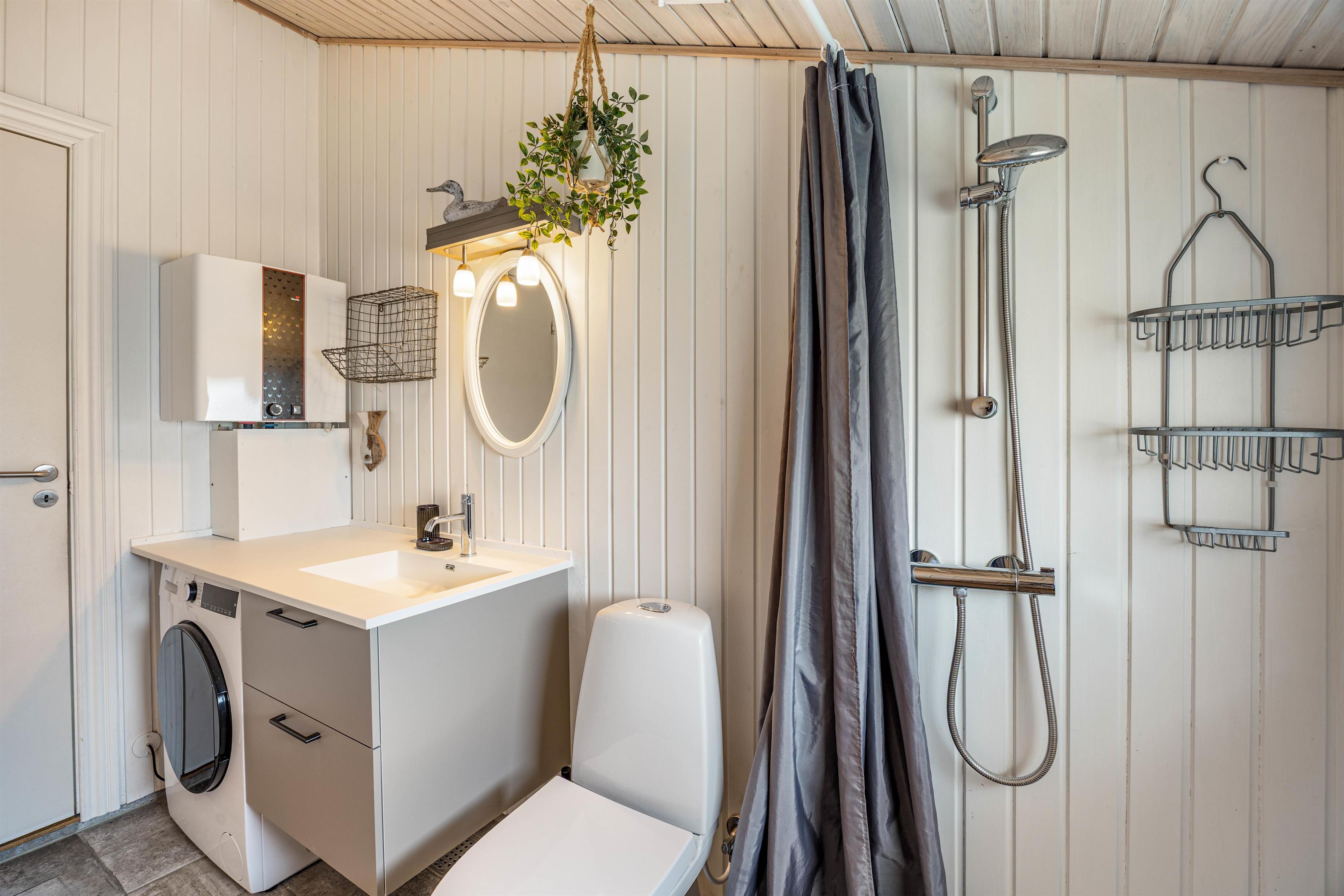 På badeværelset sørger gulvvarmen for lune fødder, og har I brug for ekstra velvære efter en skøn gåtur ved stranden, kan I slappe af og få varmen i sommerhusets sauna.