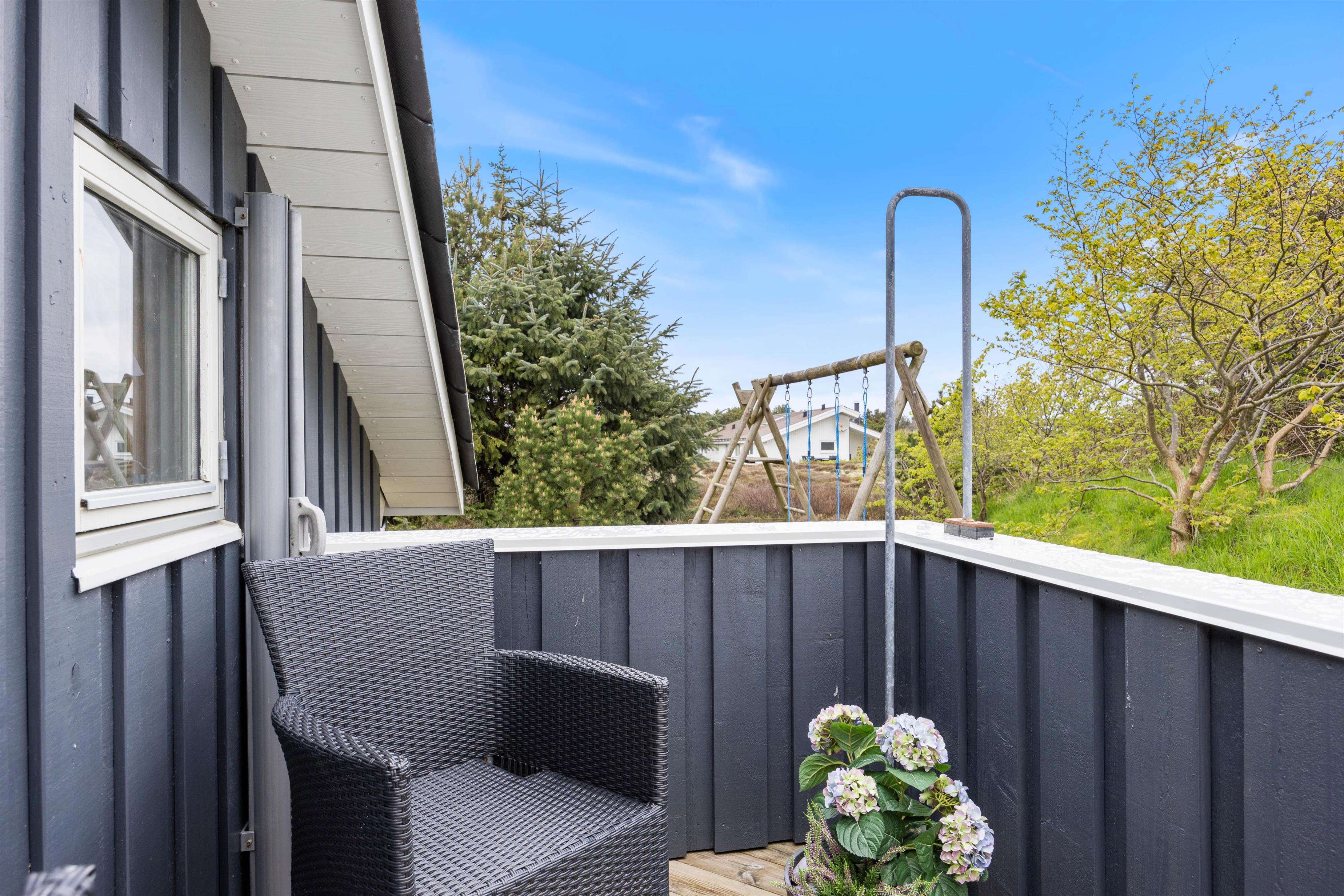 På den dejlige terrasse kan familien nyde lange grillaftner på den vestvendte terrasse og se solen gå ned bag klitterne. I solens varme stråler er der mulighed for at søge skygge under den delvist overdækket terrasse. Den østvendte terrasse kan bruges til at nyde kaffen i morgenssolens timer, mens børnene gynger eller leger i sandkassen.
