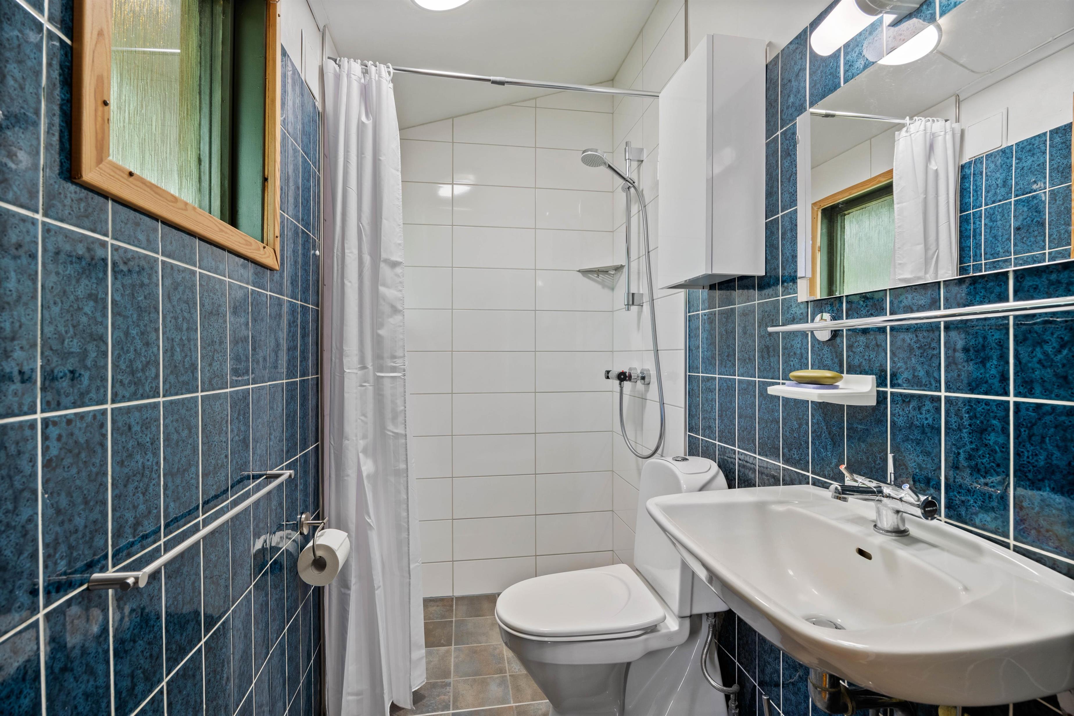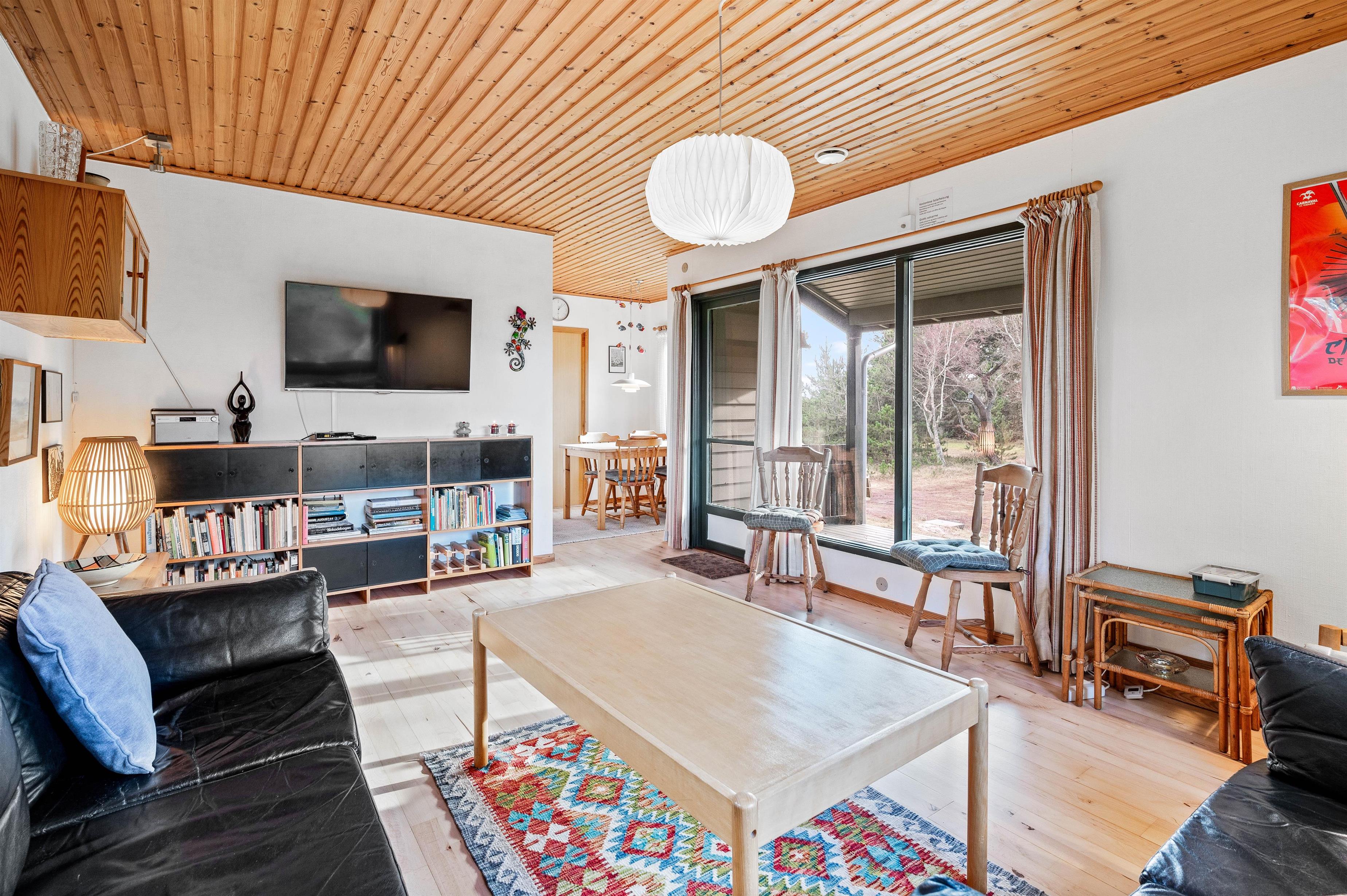 Sommerhuset er indrettet med trælofter og trægulve, der går igen i alle rum. I stuen er der fra de store panoramavinduer et flot lysindfald, og herfra er der en flot udsigt til den skønne naturgrund, der omkranser sommerhuset. I stuen finder I også den praktiske varmepumpe, der gør det nemt at holde en fin temperatur i sommerhuset.