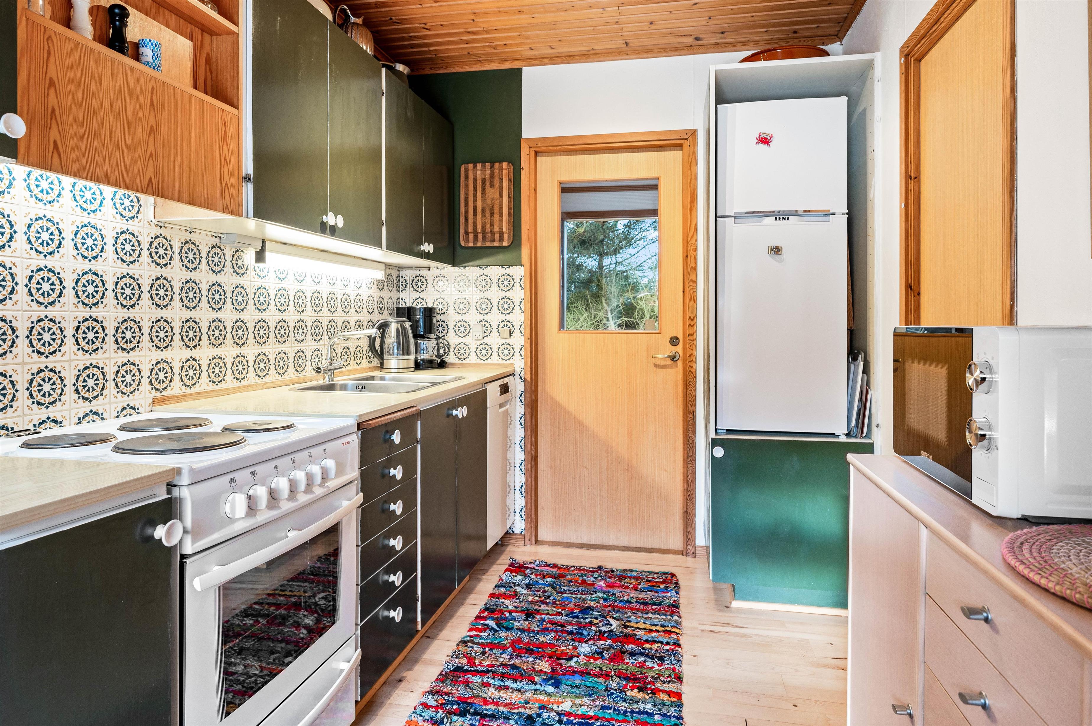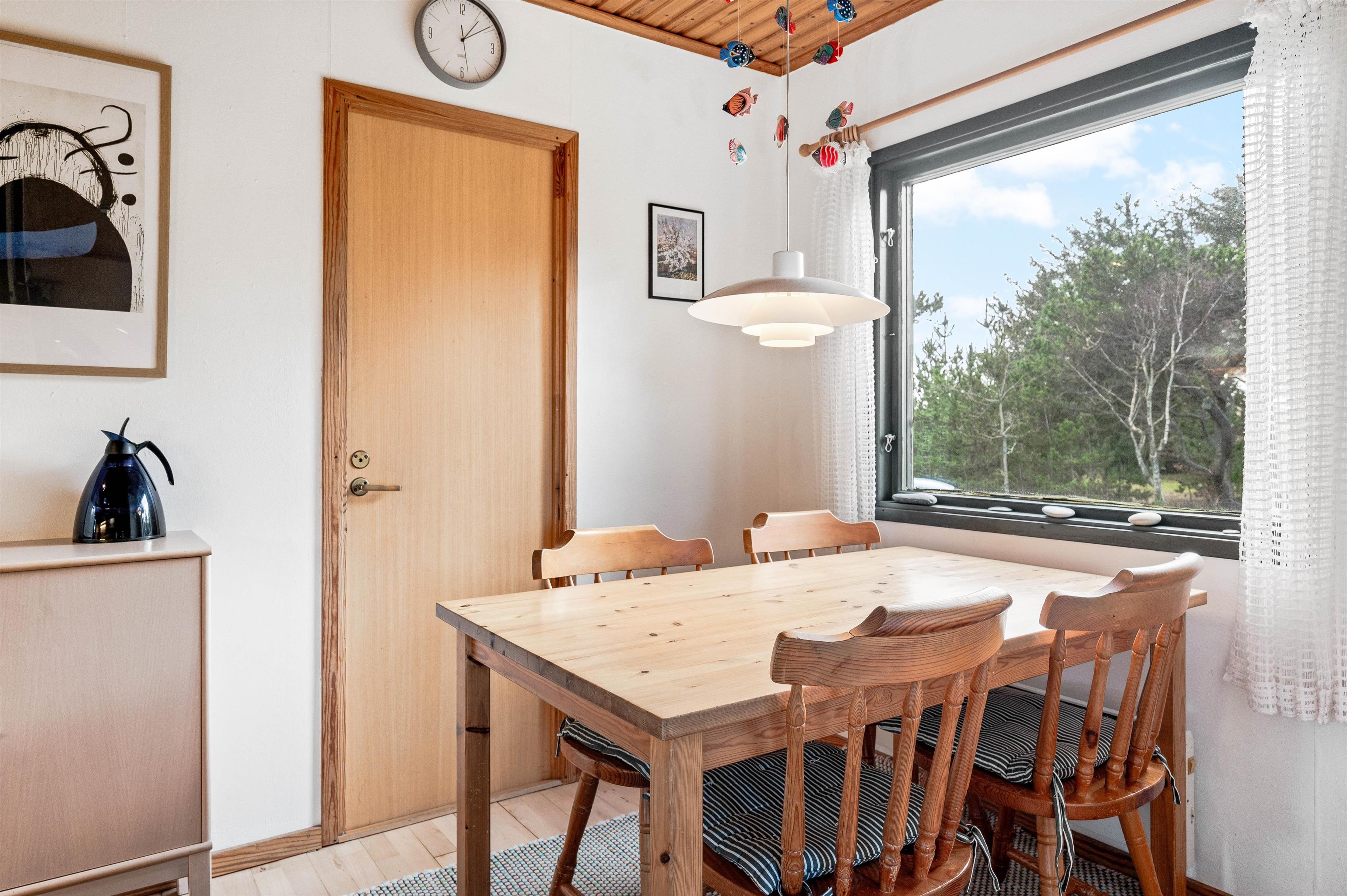 Det første, der møder jer, når I træder ind i feriehuset, er en praktisk entré til opbevaring af overtøj og fodtøj. Herfra er der indgang til det lille køkken med blandt andet opvaskemaskine og god skabsplads. Ud for køkkenet er spisebordet placeret. Herfra kan kokken underholdes, eller I kan nyde et glas vin, mens der holdes øje med maden, der koger færdig på komfuret, og børnene spiller spil.